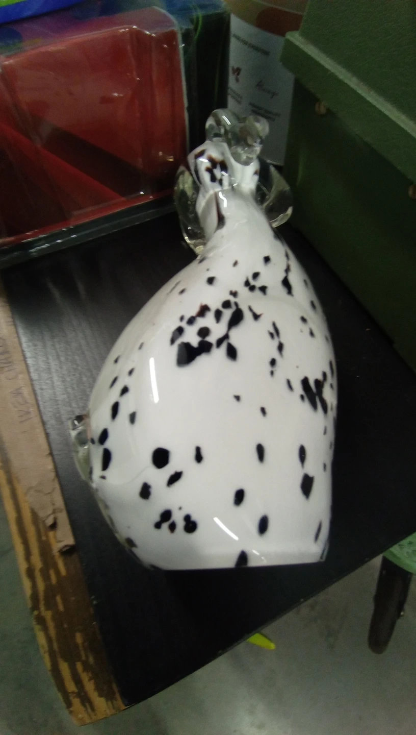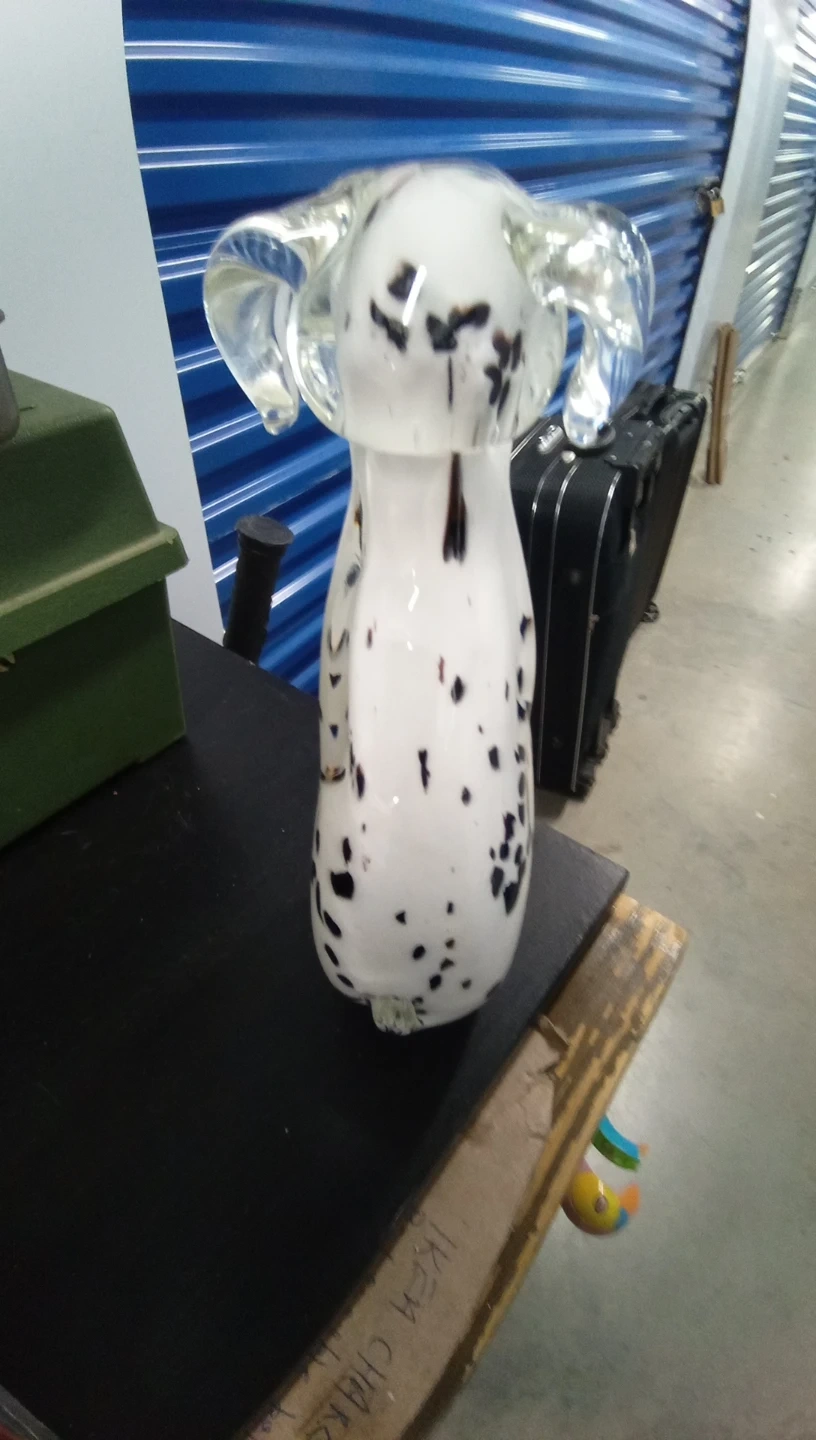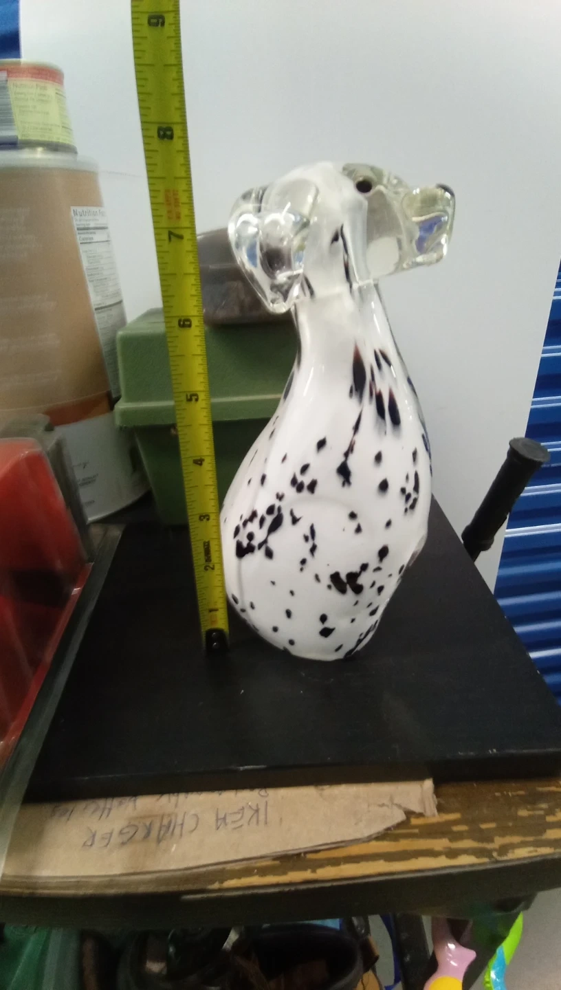 Hand-blown glass dog figurine with a white body and black spots. Features clear glass ears and eyes. Stands approximately 8 inches tall. It's a unique piece of art!