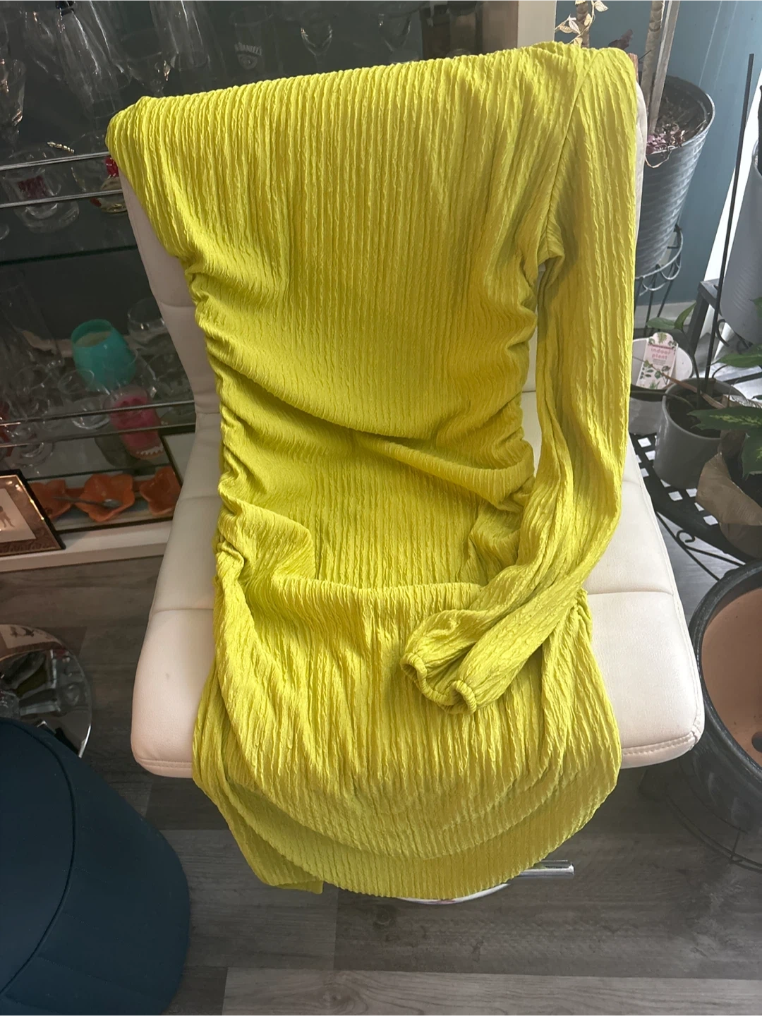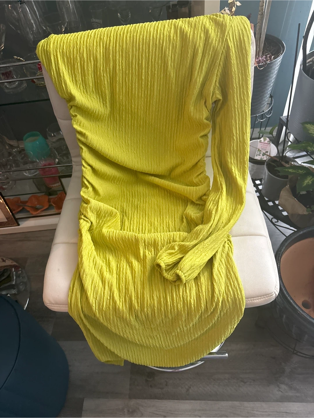 This lime green dress features a ruched design and long sleeves. It's made from a textured fabric. It's a size medium.