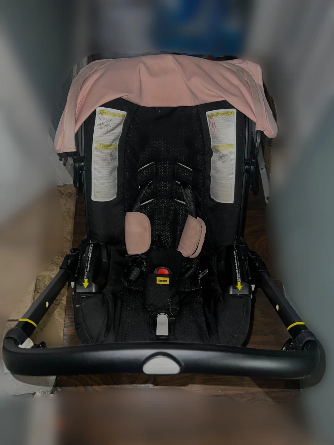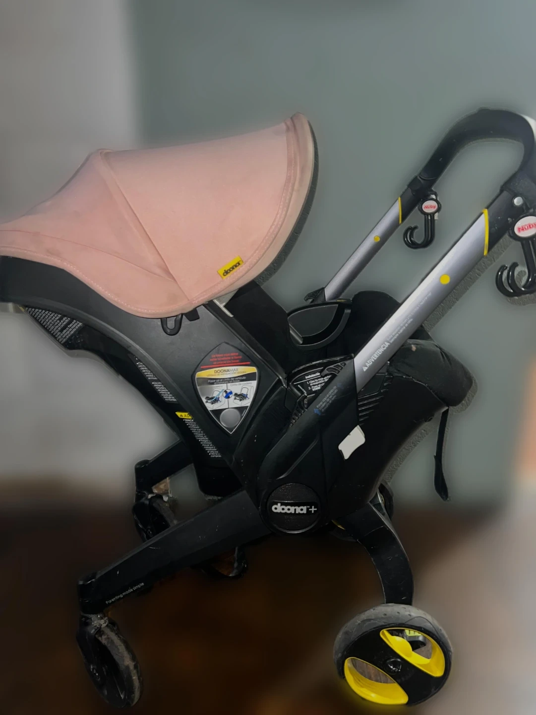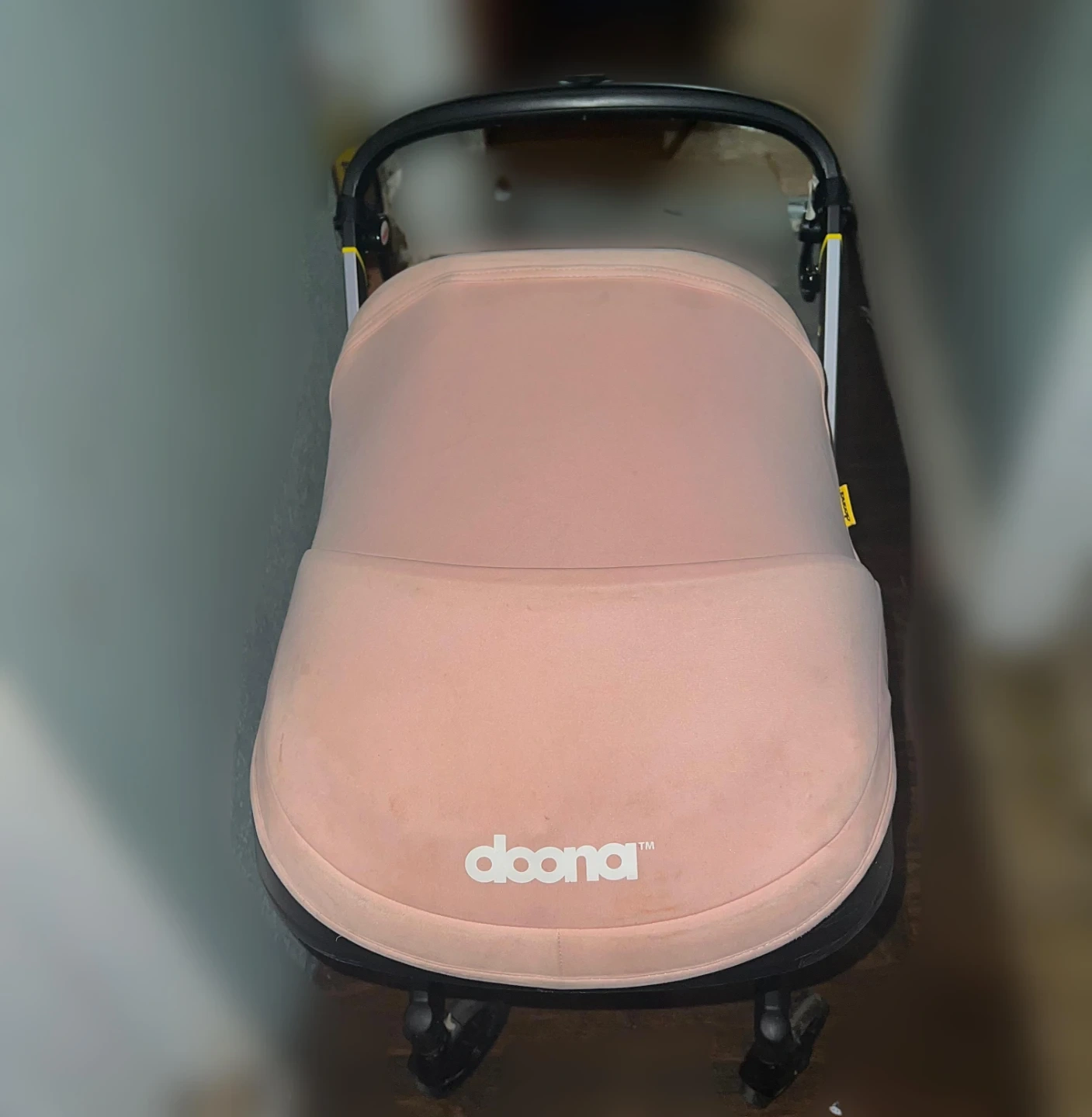 This is a Doona infant car seat and stroller combo. It's a pink color and converts from a car seat to a stroller. The fabric appears to be durable for travel.