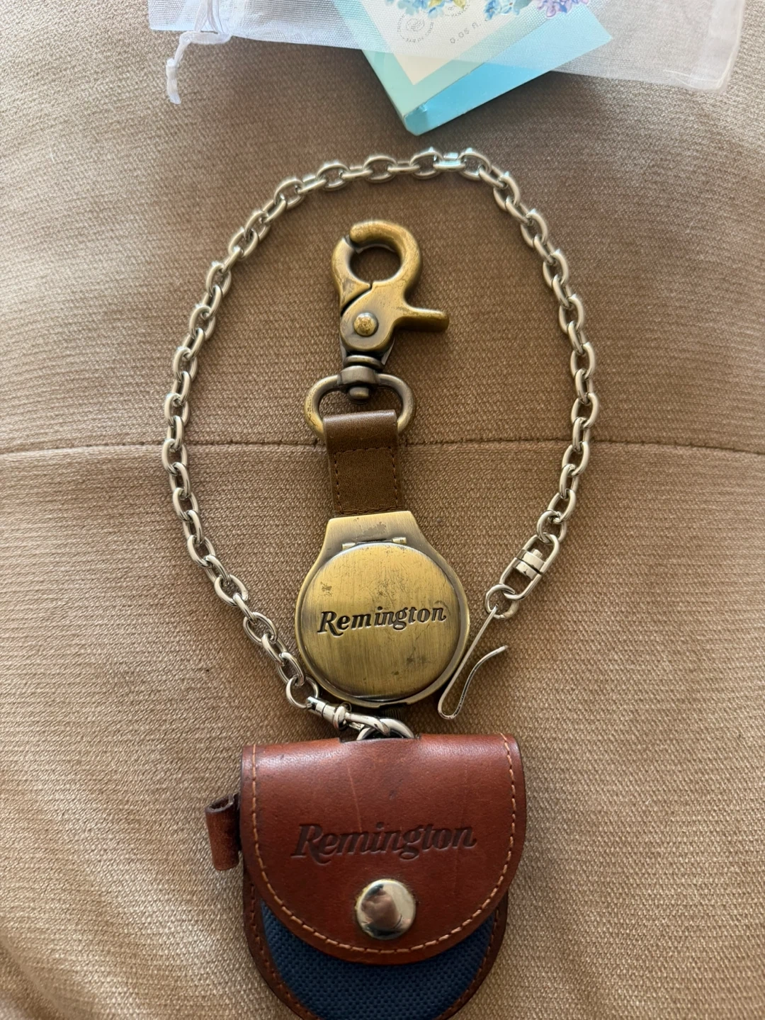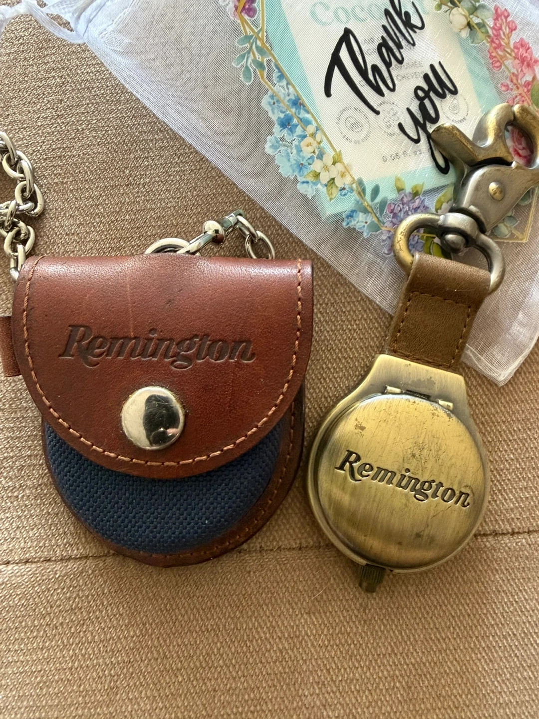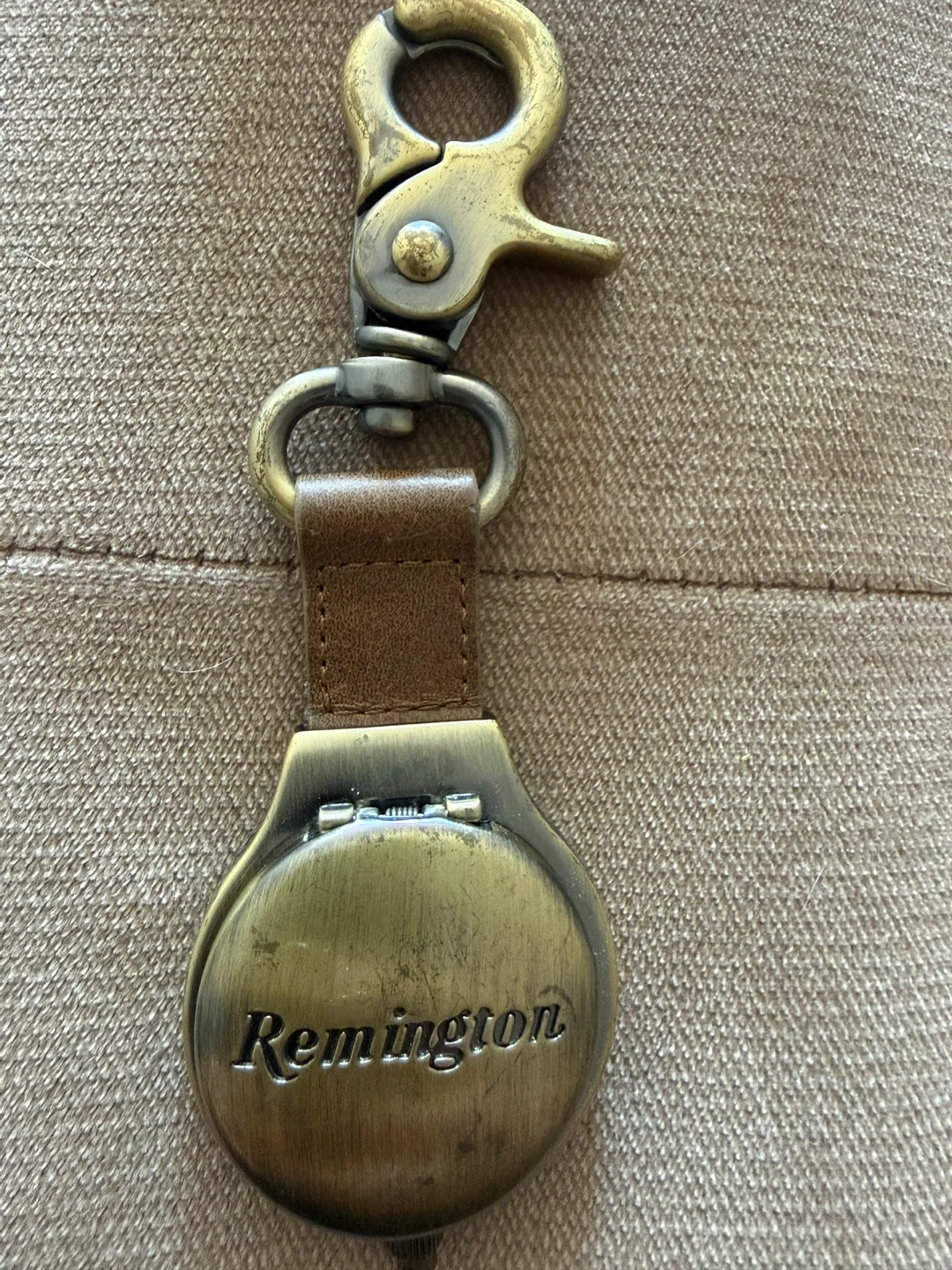 a Remington leather and canvas pouch with a metal snap closure ..and a matching Remington keychain. The keychain features a round, brass-toned casing with a leather strap and a sturdy clip. Both items showcase the Remington brand.
