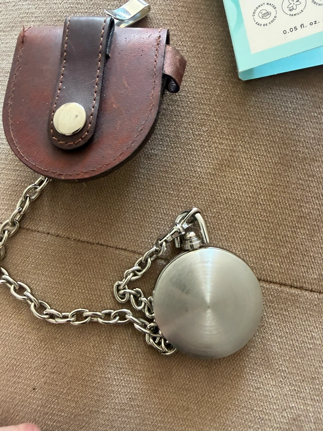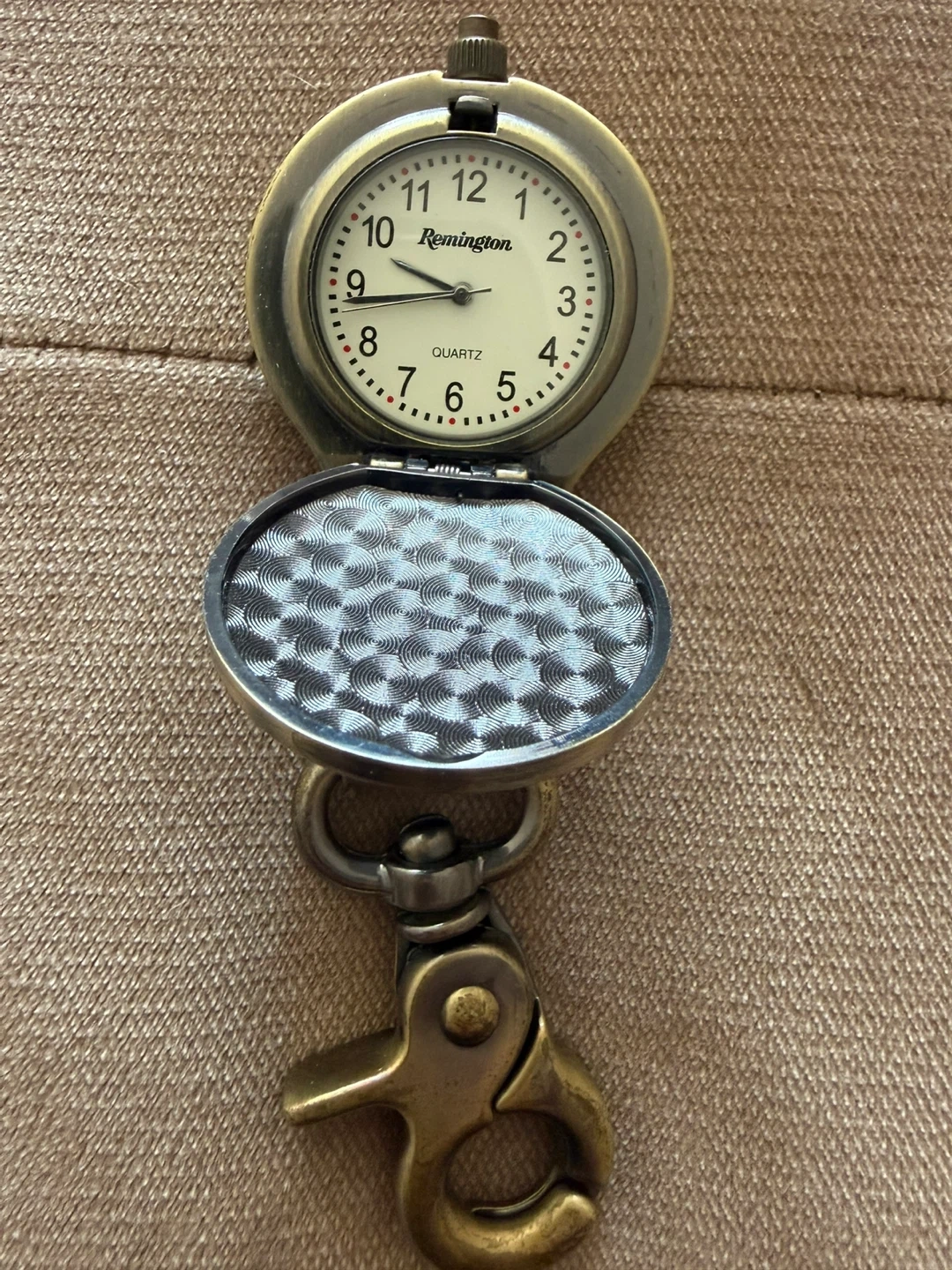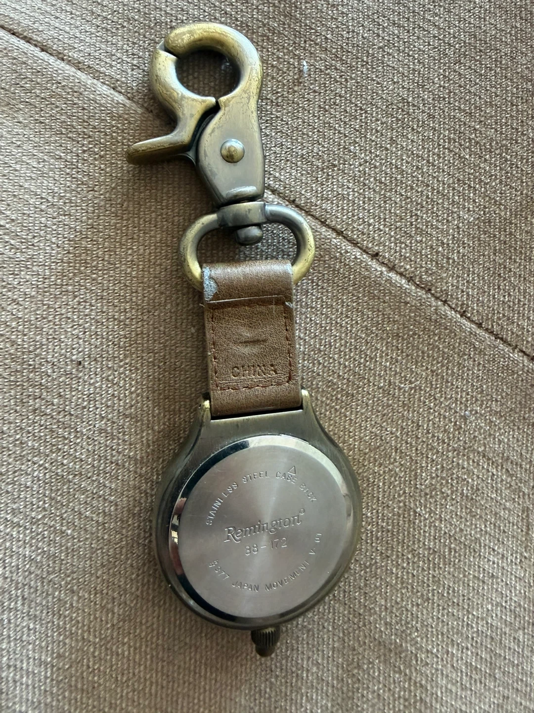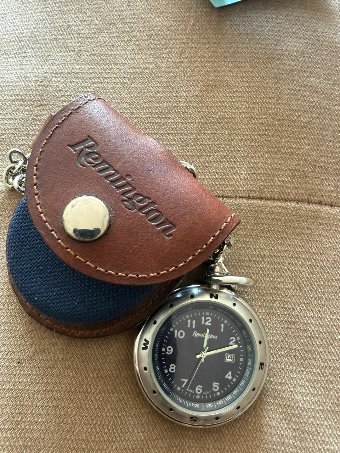 a Remington leather and canvas pouch with a metal snap closure ..and a matching Remington keychain. The keychain features a round, brass-toned casing with a leather strap and a sturdy clip. Both items showcase the Remington brand.