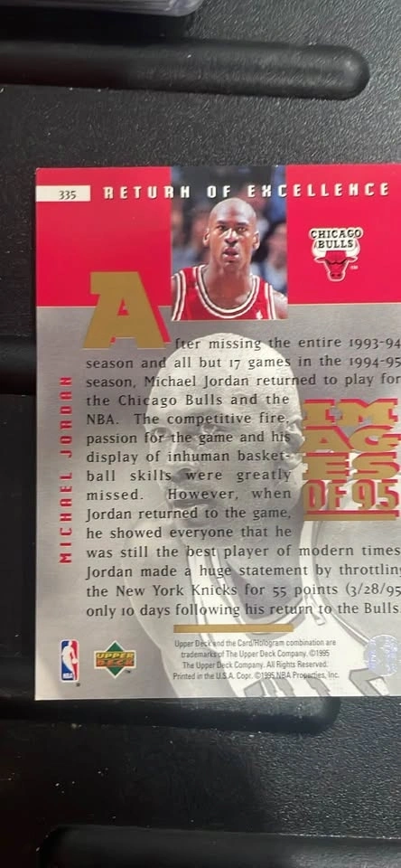 I have an Upper Deck Michael Jordan “Images of 95 Return of Excellence” card for sale. It can be picked up around the corner of Wellington and Seminary, close to the Wellington Brown Line stop. I have several Jordan cards listed if you search my profile.