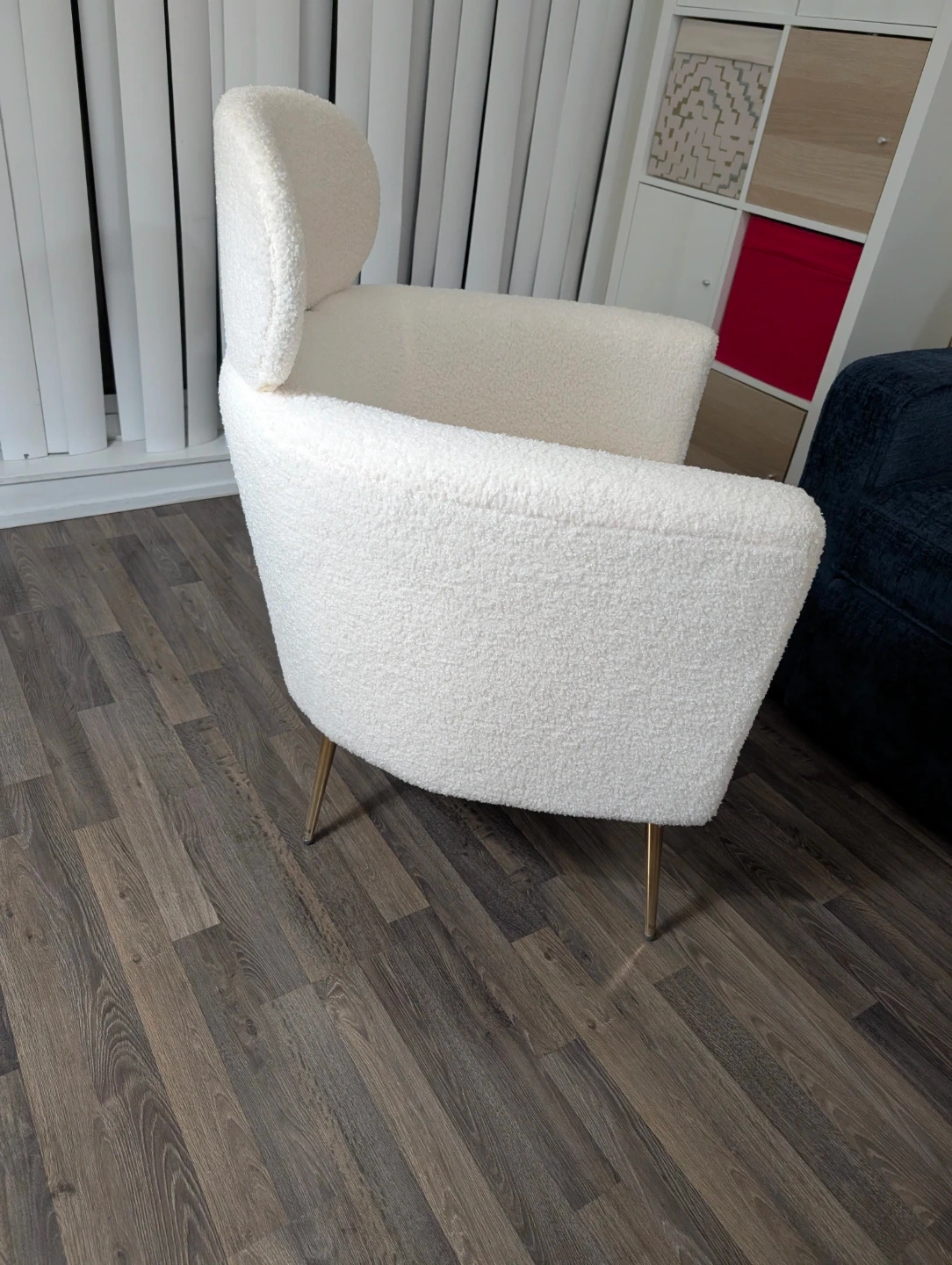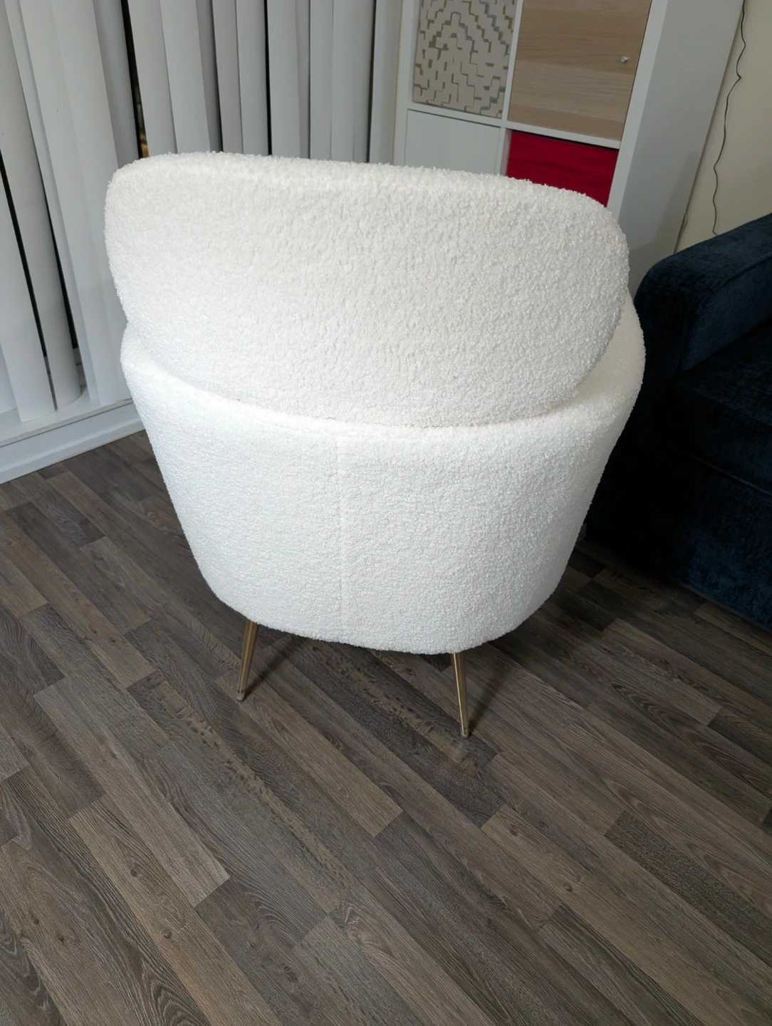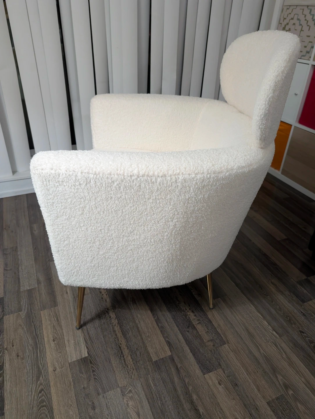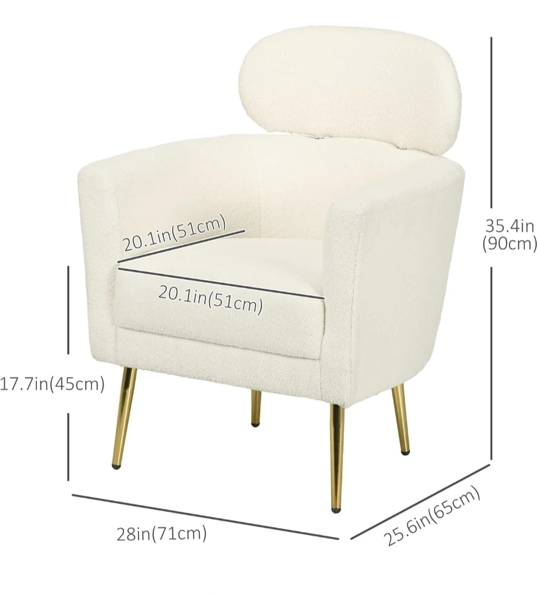 Sparingly used, cozy armchair upholstered in soft white boucle fabric. It features a curved backrest and stylish gold metal legs. Seat width is 20.1 inches and depth is 20.1 inches. Overall chair dimensions are 28 inches wide, 25.6 inches deep, and 35.4 inches high. Always used with a seat cover on and not a single mark/stain/scratch on the armchair.