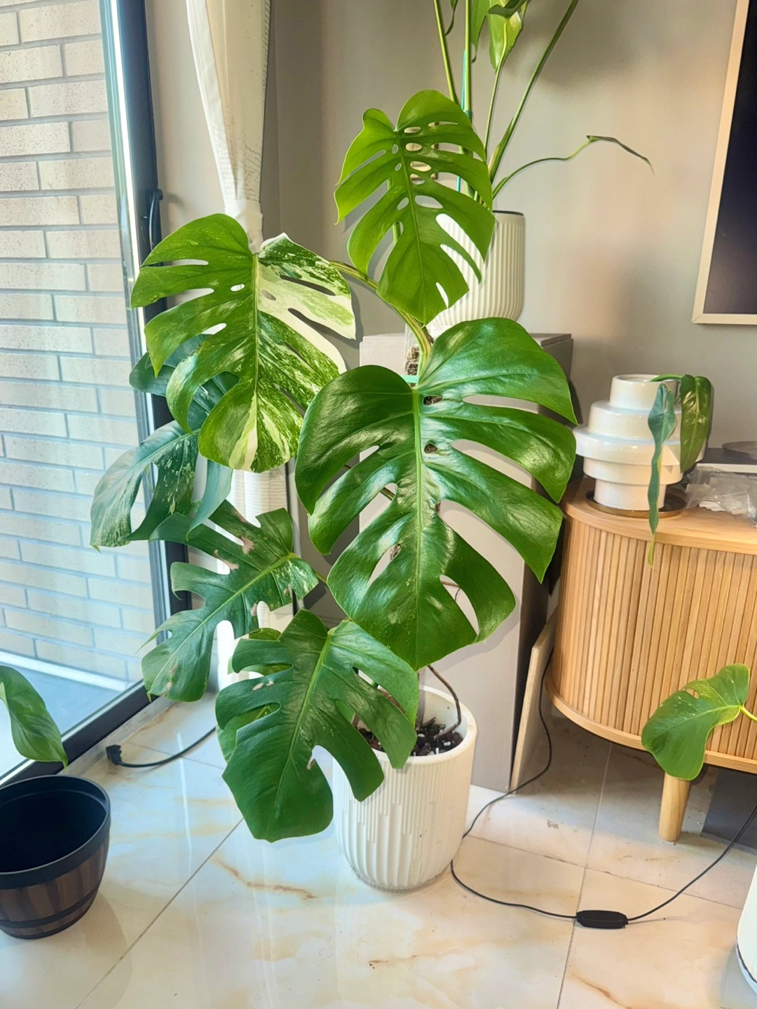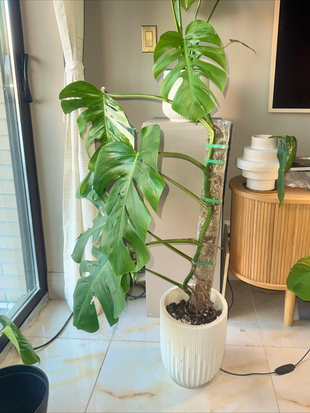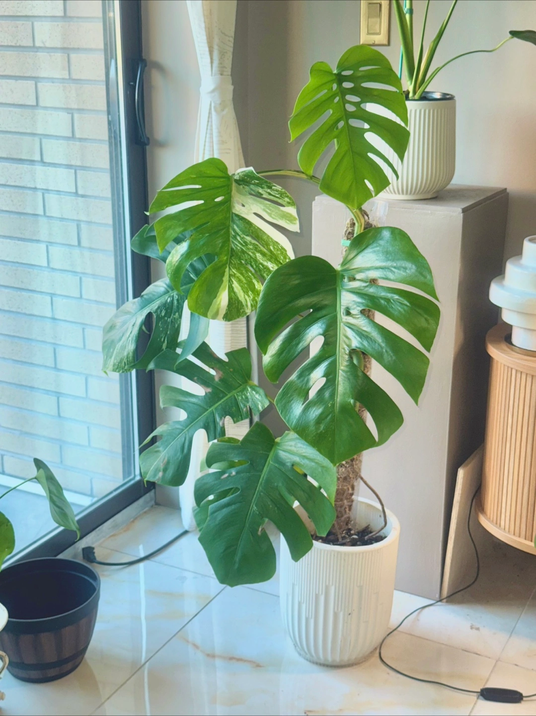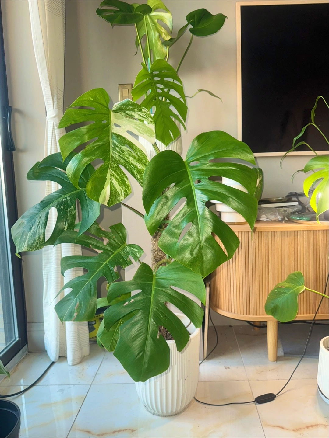 114Large size Monstera ablo 4Ft tall. Produces high variegation every few other leaves. Skated on moss pole and comes with the white planter.