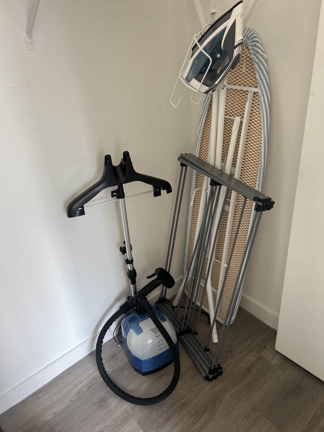 Includes a garment steamer, iron, and ironing board. Great for quick and easy wrinkle removal. All in good condition. Perfect for apartments.