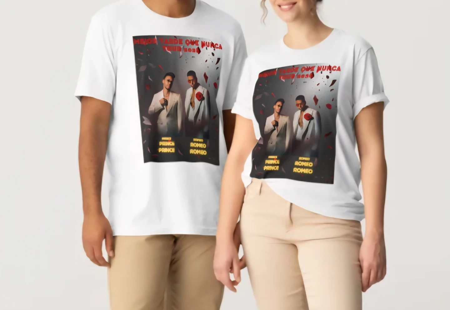 White cotton blend t-shirt featuring the "Mejor Tarde Que Nunca" tour graphic with Prince Royce and Romeo Santos. "Mejor Tarde Que Nunca Tour 2020" text is visible on the graphic. It's a crew neck, short-sleeve design. This shirt is great for fans of Prince Royce and Romeo Santos!