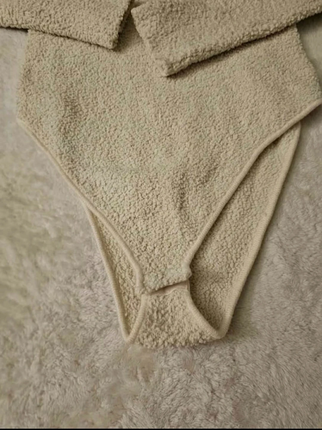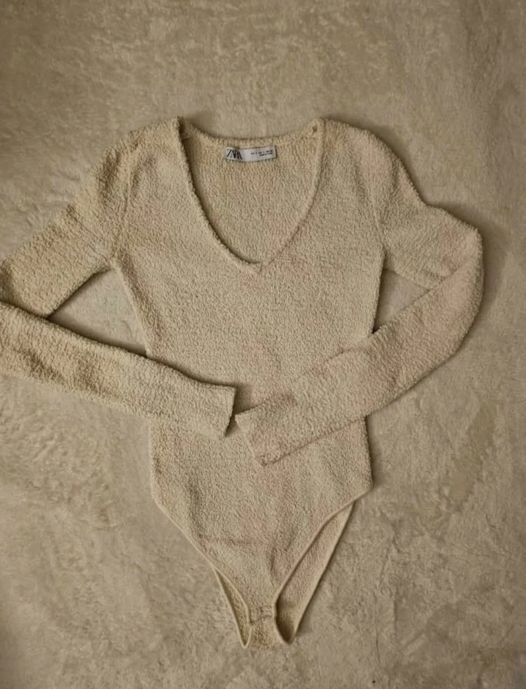 Cream textured bodysuit by Zara. It features a V-neck and long sleeves. Snap closure at the bottom. Size S. Barely used.