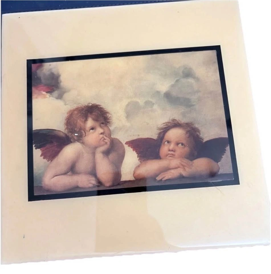 This is a set of two 8" square wall hangings featuring Cherubs by GRANDER IMAGE. These tiles showcase angels and would be a beautiful addition to your home decor. You can hang or lean them against the wall. They are missing the stand part, please see pic. There are minor imperfections due to age and use.