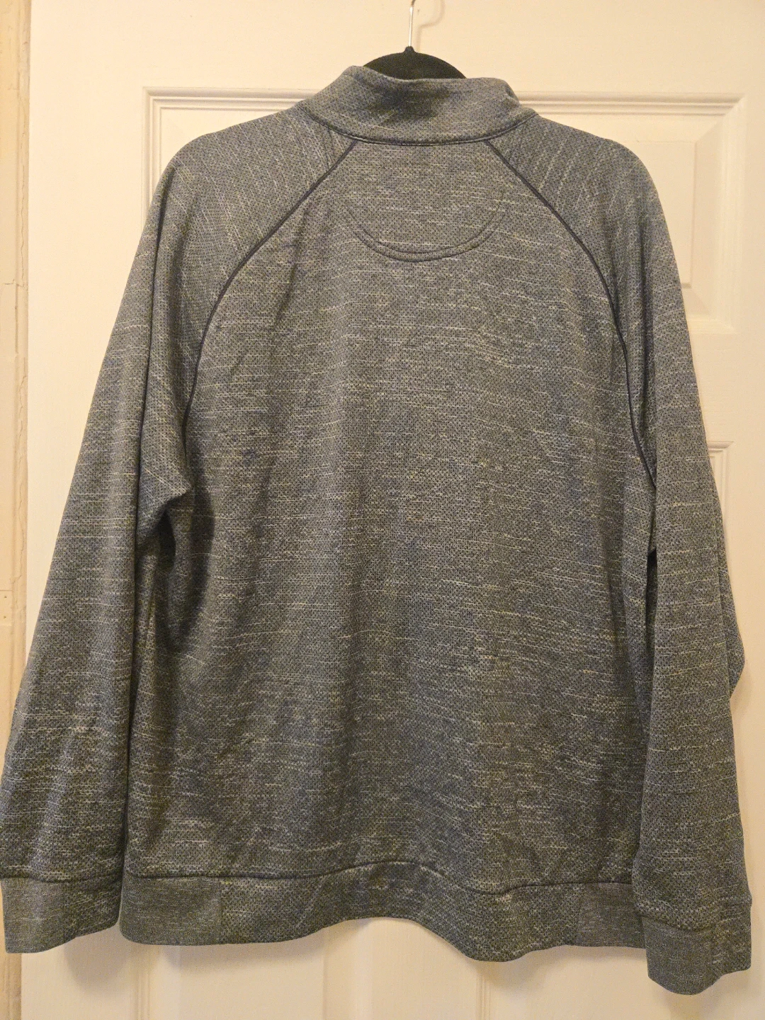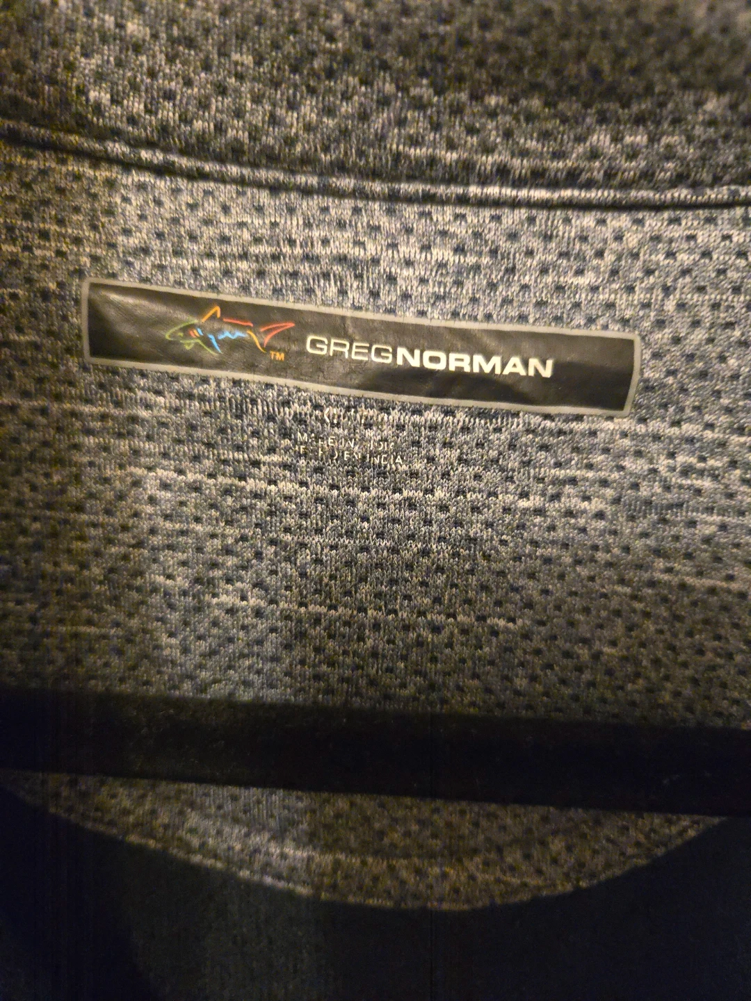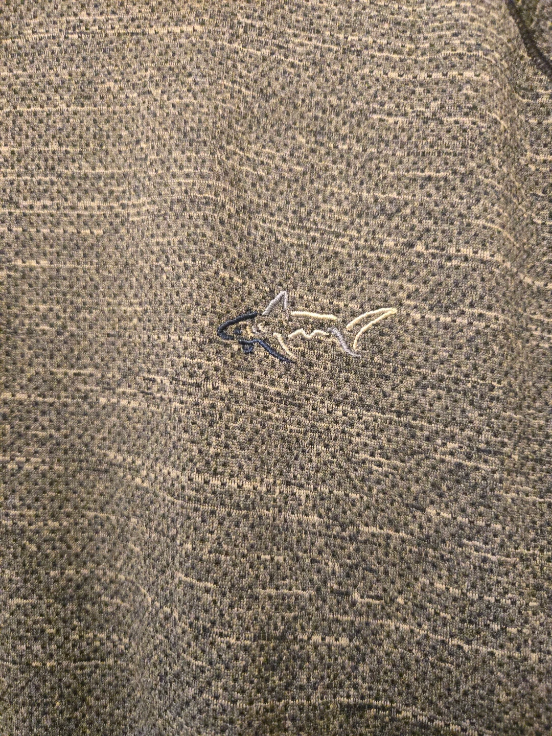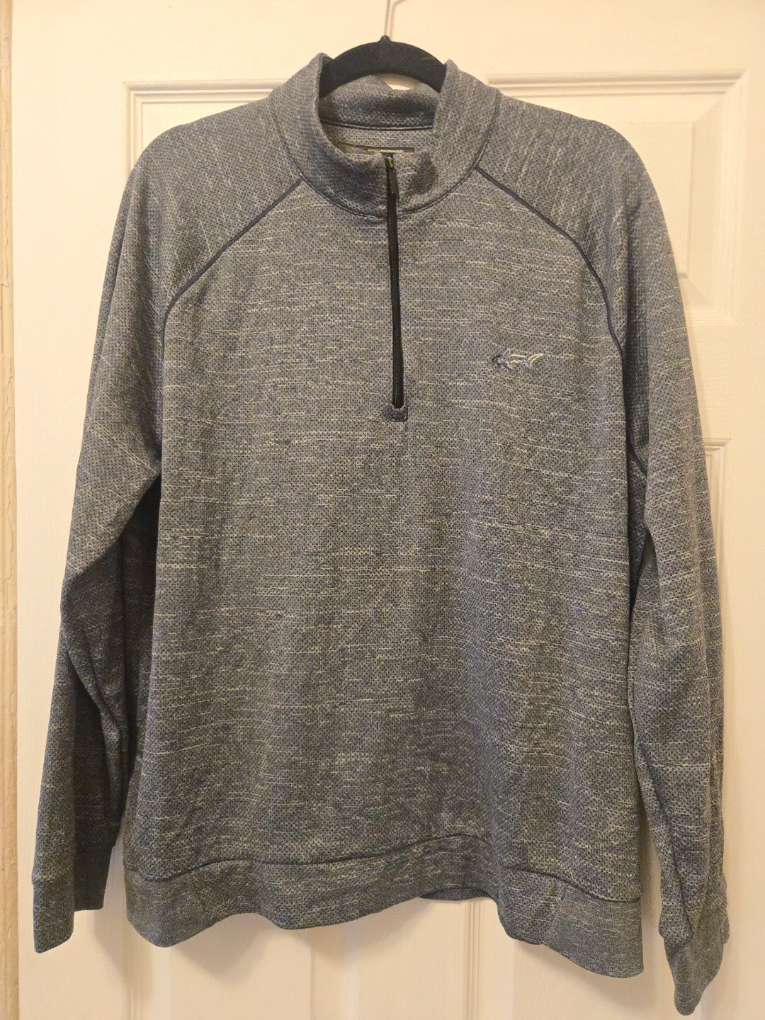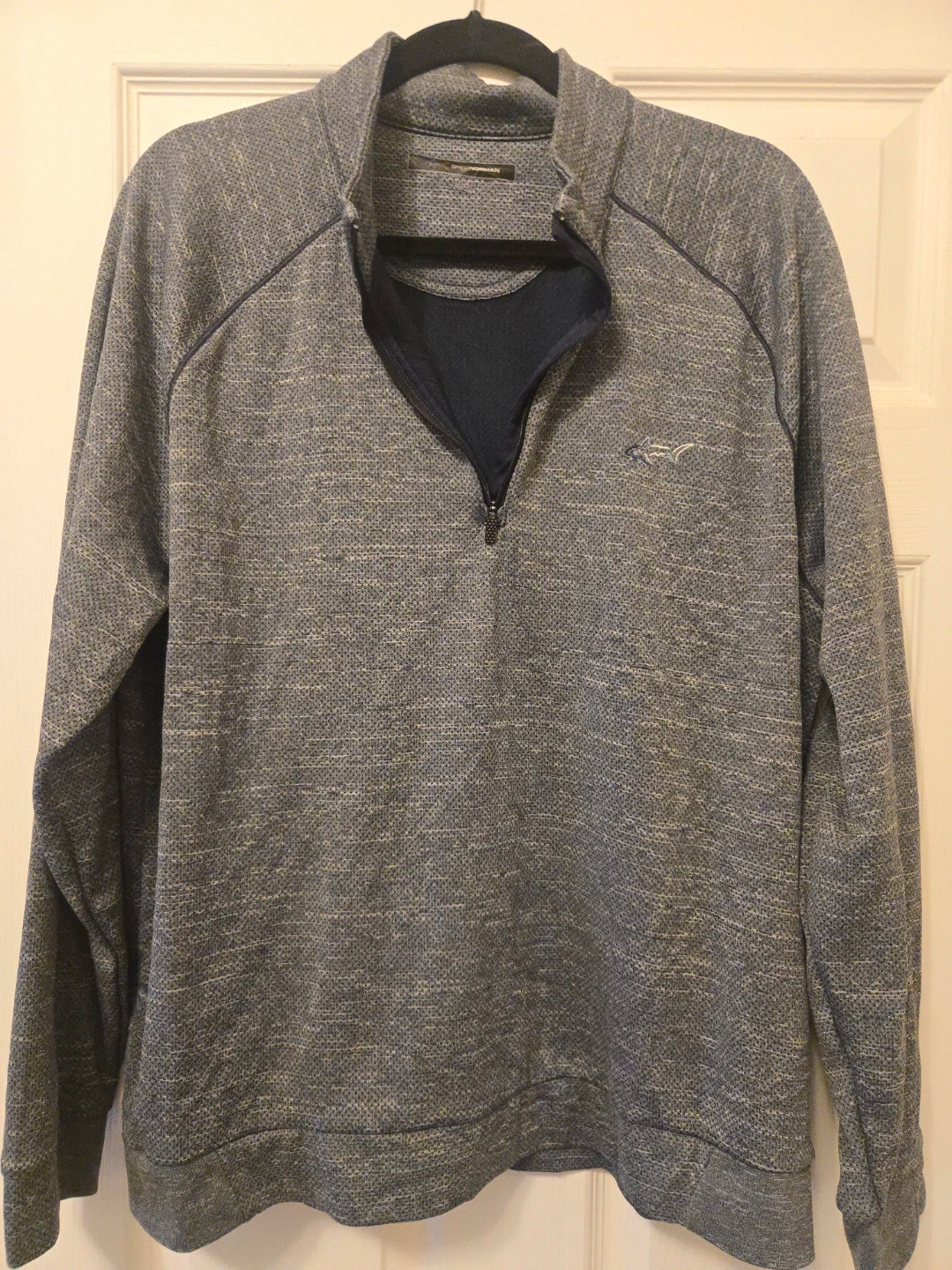 This is a Greg Norman men's 1/4 zip pullover sweater. It's a heathered grey color with a small shark logo embroidered on the chest. The material is a polyester blend.