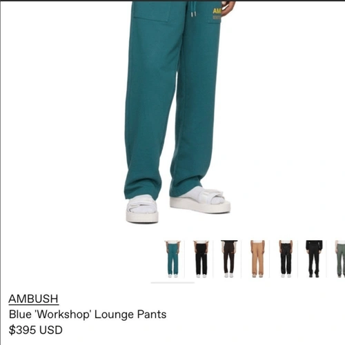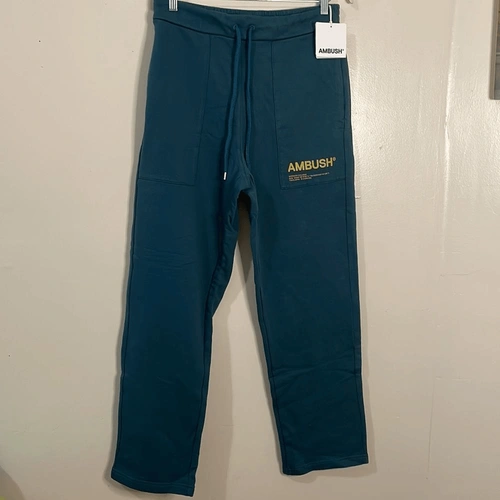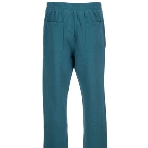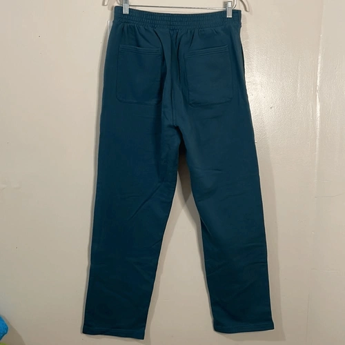 Brand new, "Blue workshop pants" but the color is more of a teal. Cotton fleece pants, mid-rise four pockets styling. Drawstring at partially elasticized waistband.