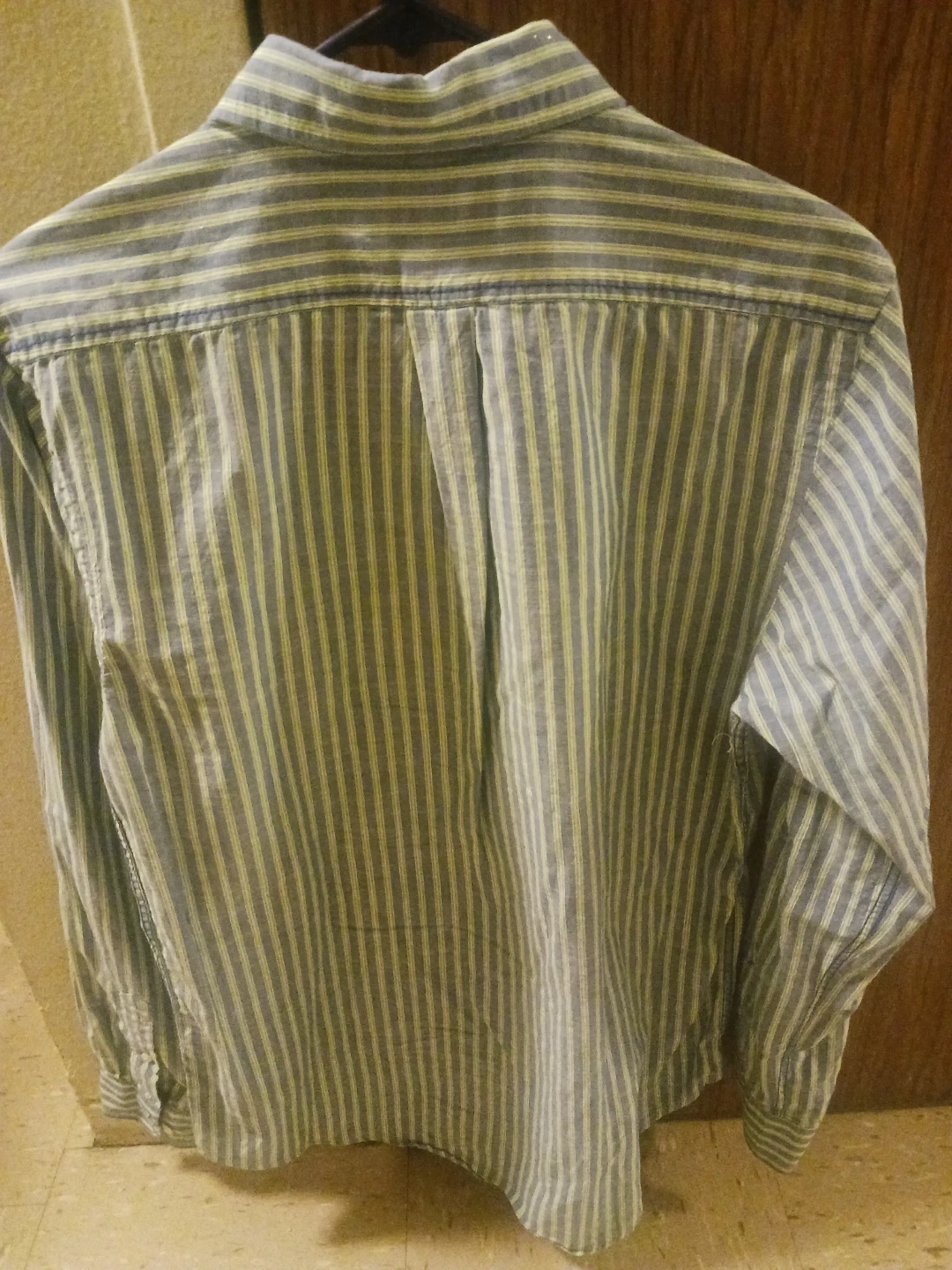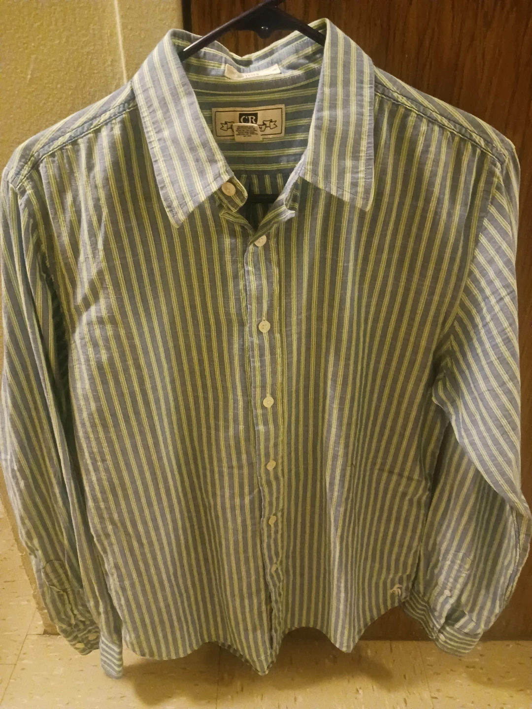 This Club Room button-down shirt features a classic pinstripe pattern in blue and green. It's a men's size small. 100% cotton fabric.