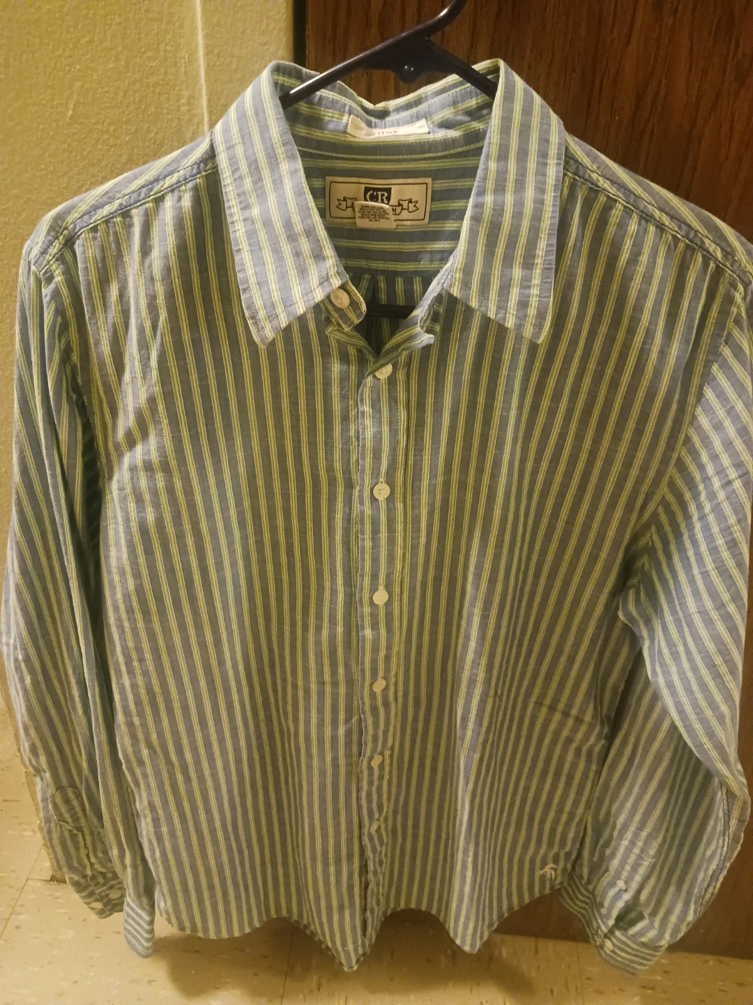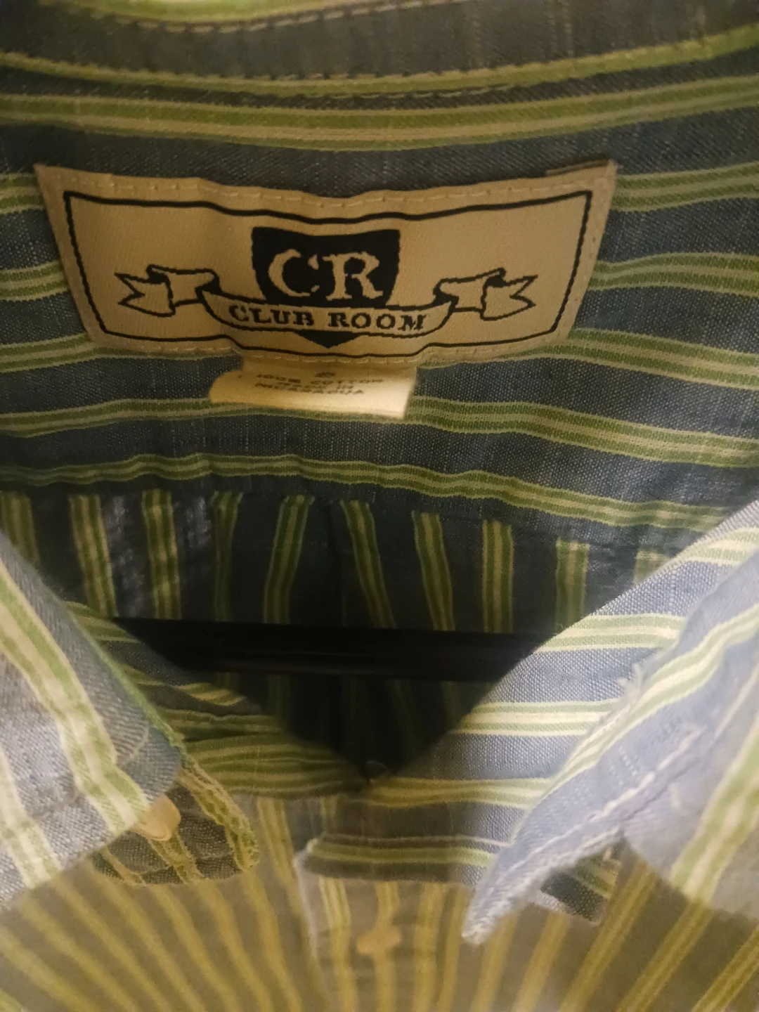 This Club Room button-down shirt features a classic pinstripe pattern in blue and green. It's a men's size small. 100% cotton fabric.