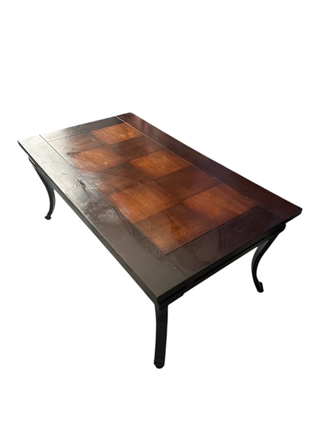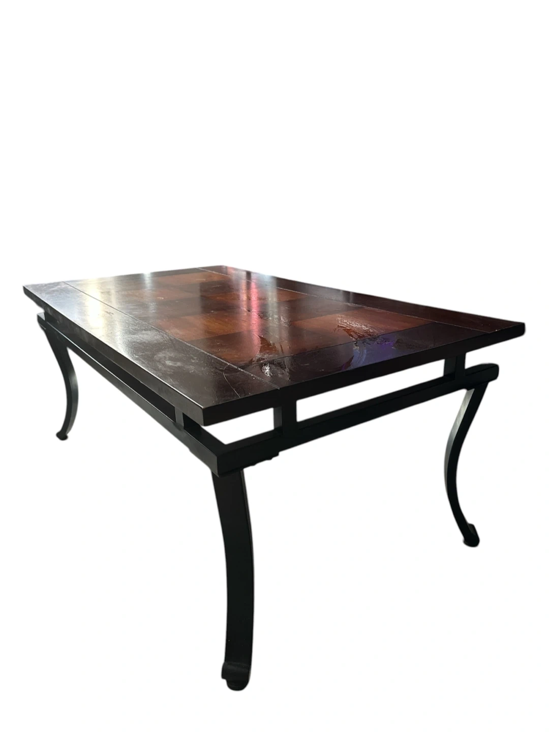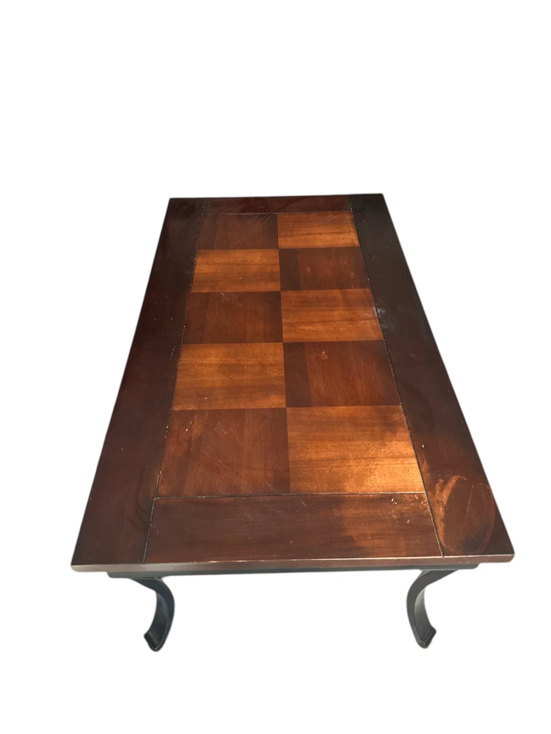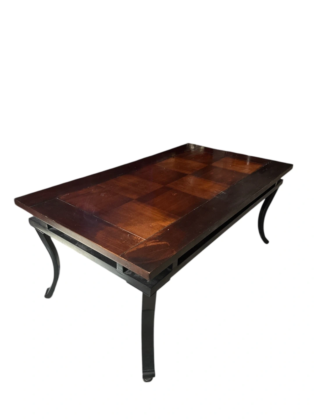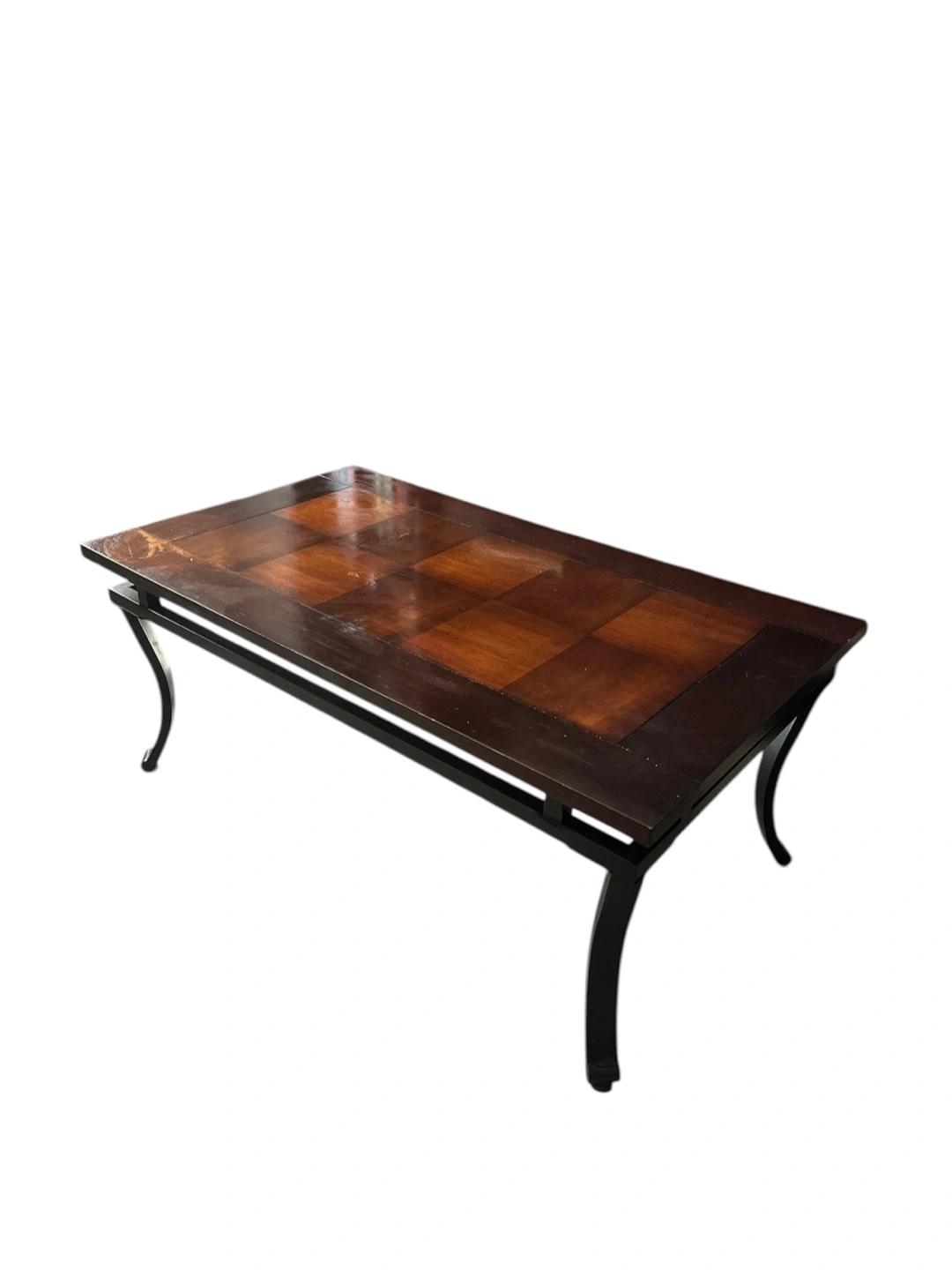 Coffee table featuring a wood inlay top with a checkerboard pattern. It has a dark wood finish and a black metal frame with curved legs. This table's design makes it a stylish addition to any living room. 42 x 24 x 18 inches. Pickup only. Cash only. #furniture #home #livingroom #coffeetable