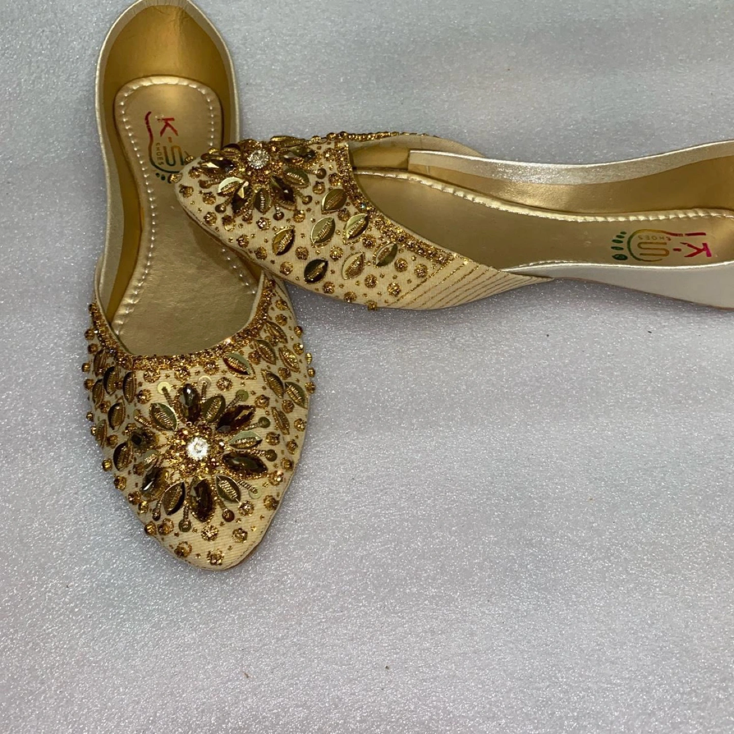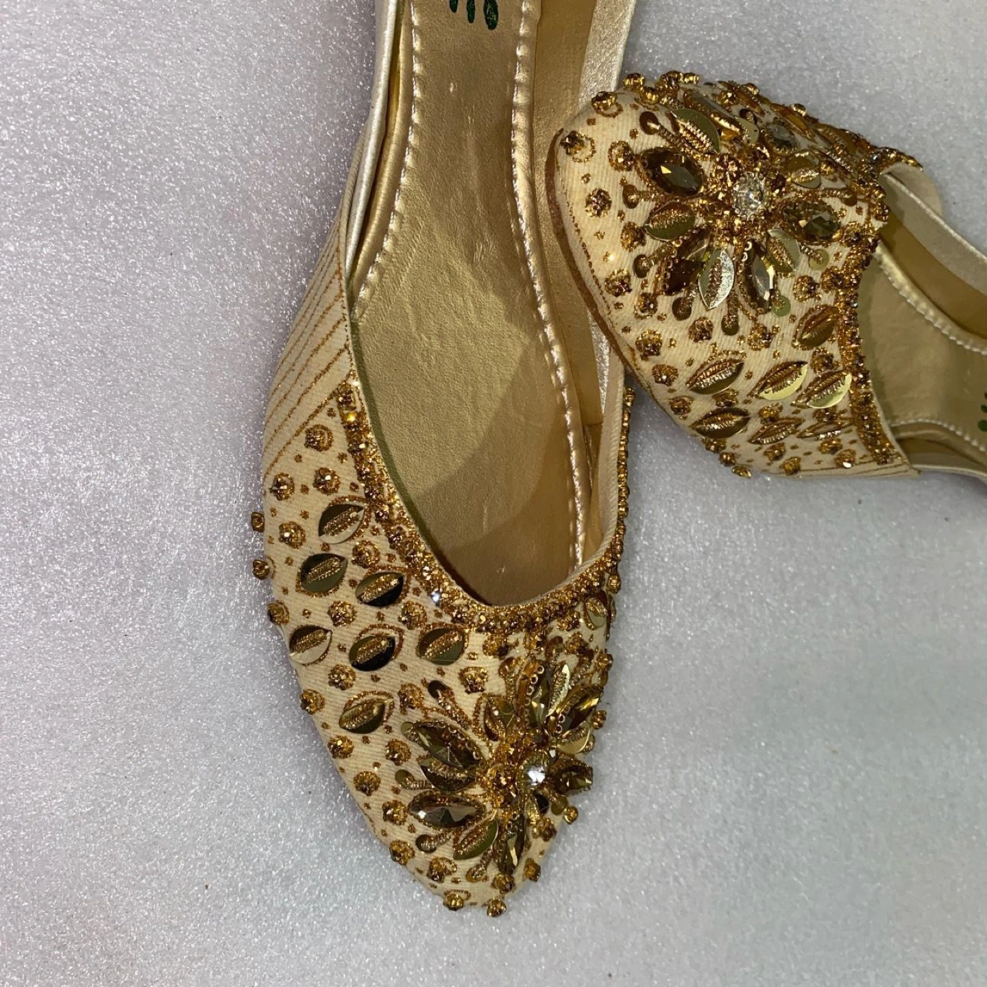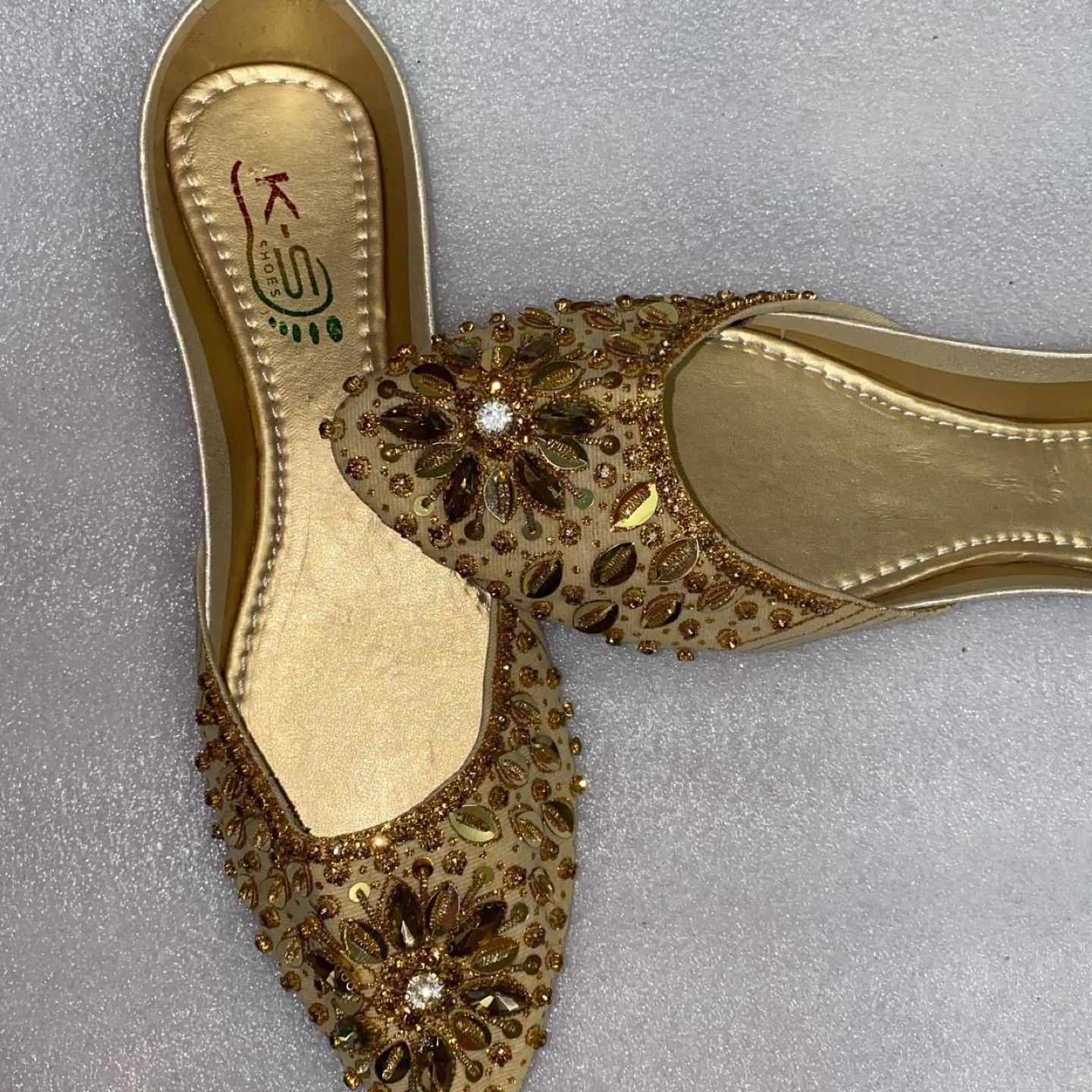 Please Note: These are typically worn for parties and special days! Beautiful and Handmade but flat, no foot support. Some have tiny nail holes as that is how Indian stalls display them. These do not affect the flats.