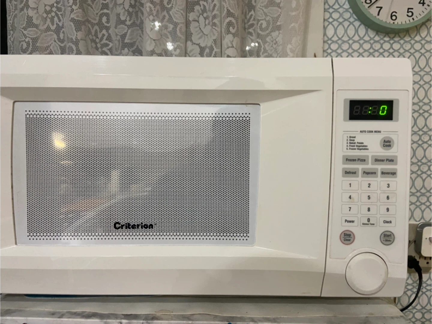 Selling a Criterion microwave oven in white. It's in good working condition and ready for a new kitchen. Features include auto cook menu options for bread, baked potato, fresh vegetables, frozen pizza, and dinner plate. It also has defrost, popcorn, and beverage settings. Easy to use and clean! It’s the bigger size for extra power.