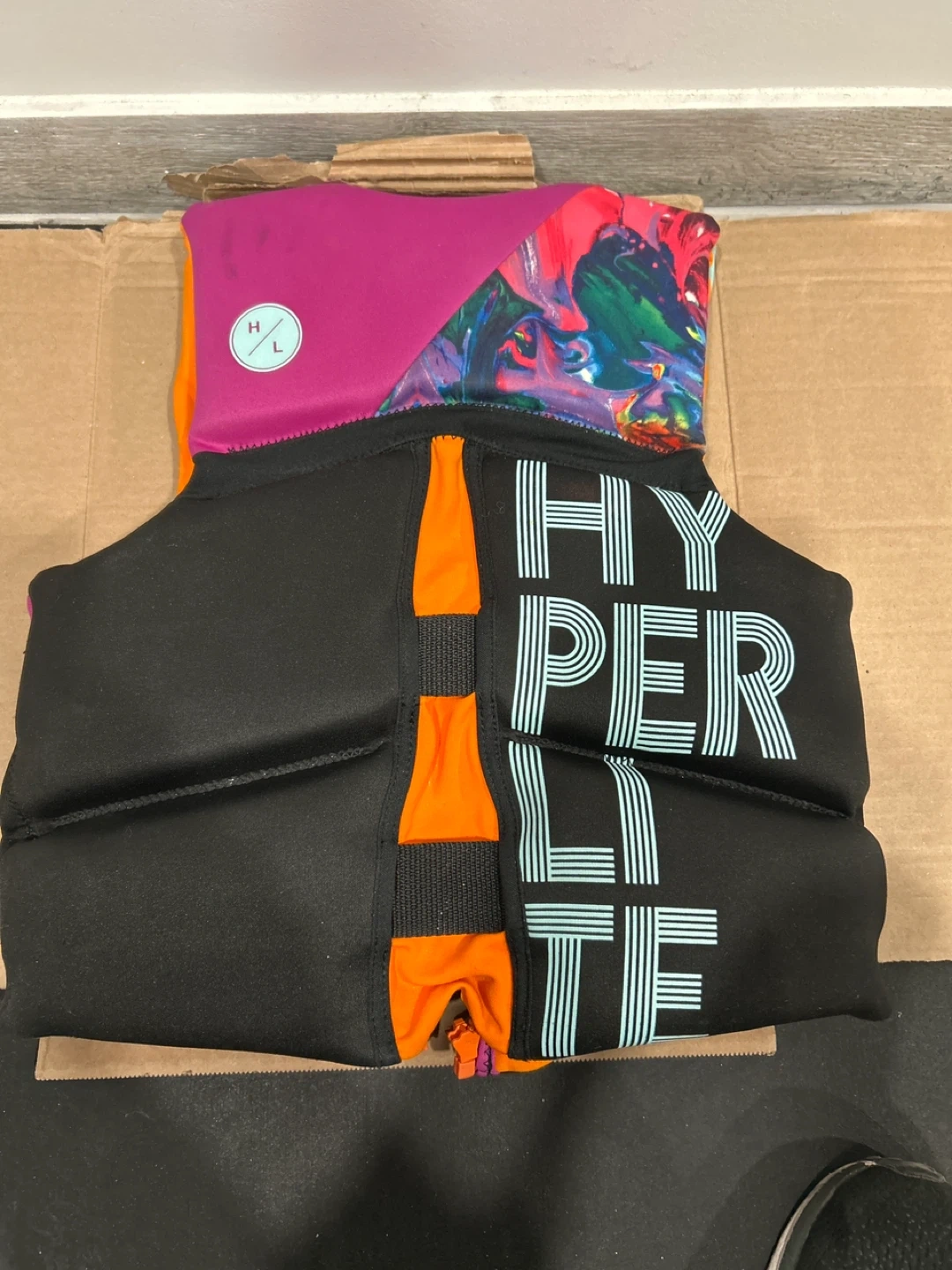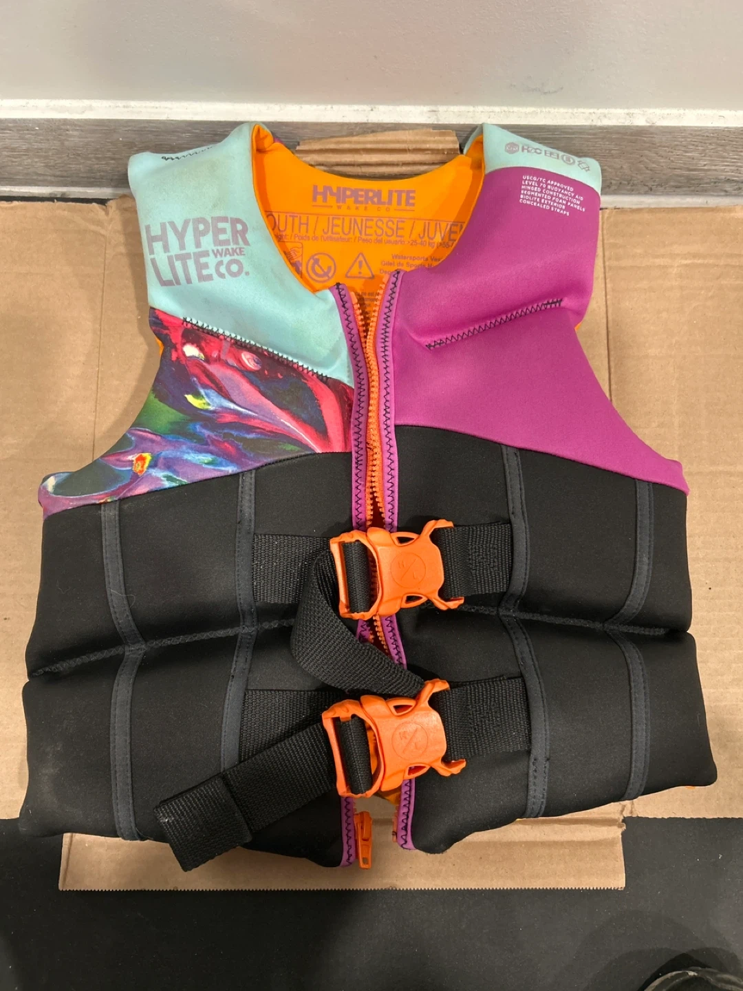 This Hyperlite life vest is designed for youth use. It features adjustable straps and a secure zipper closure. The vest is made with durable materials for water activities.