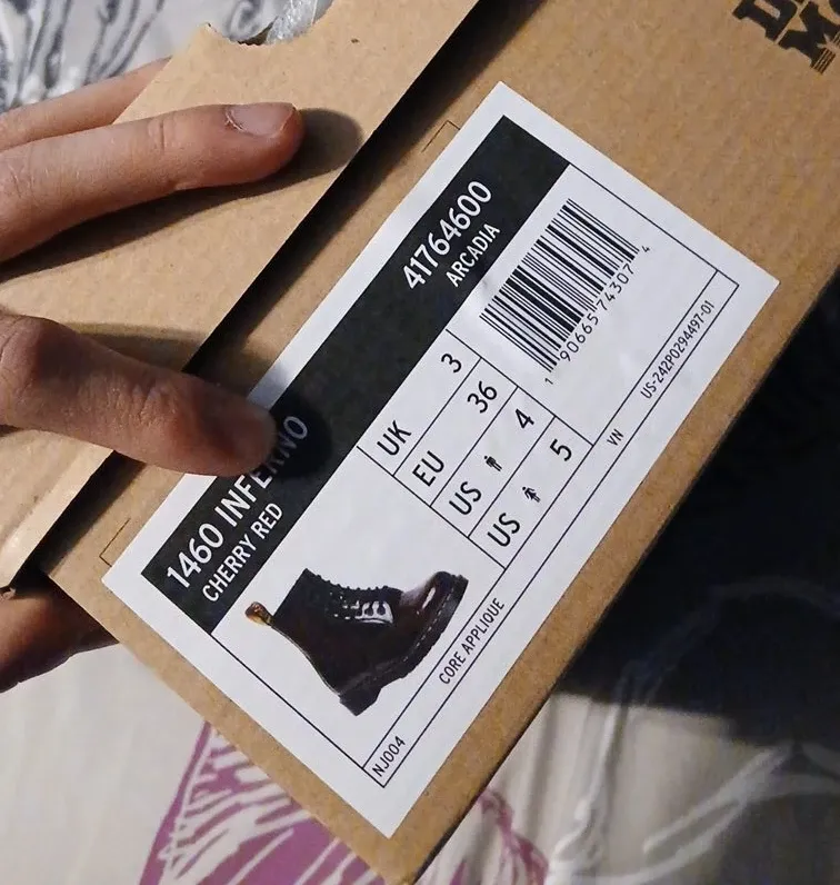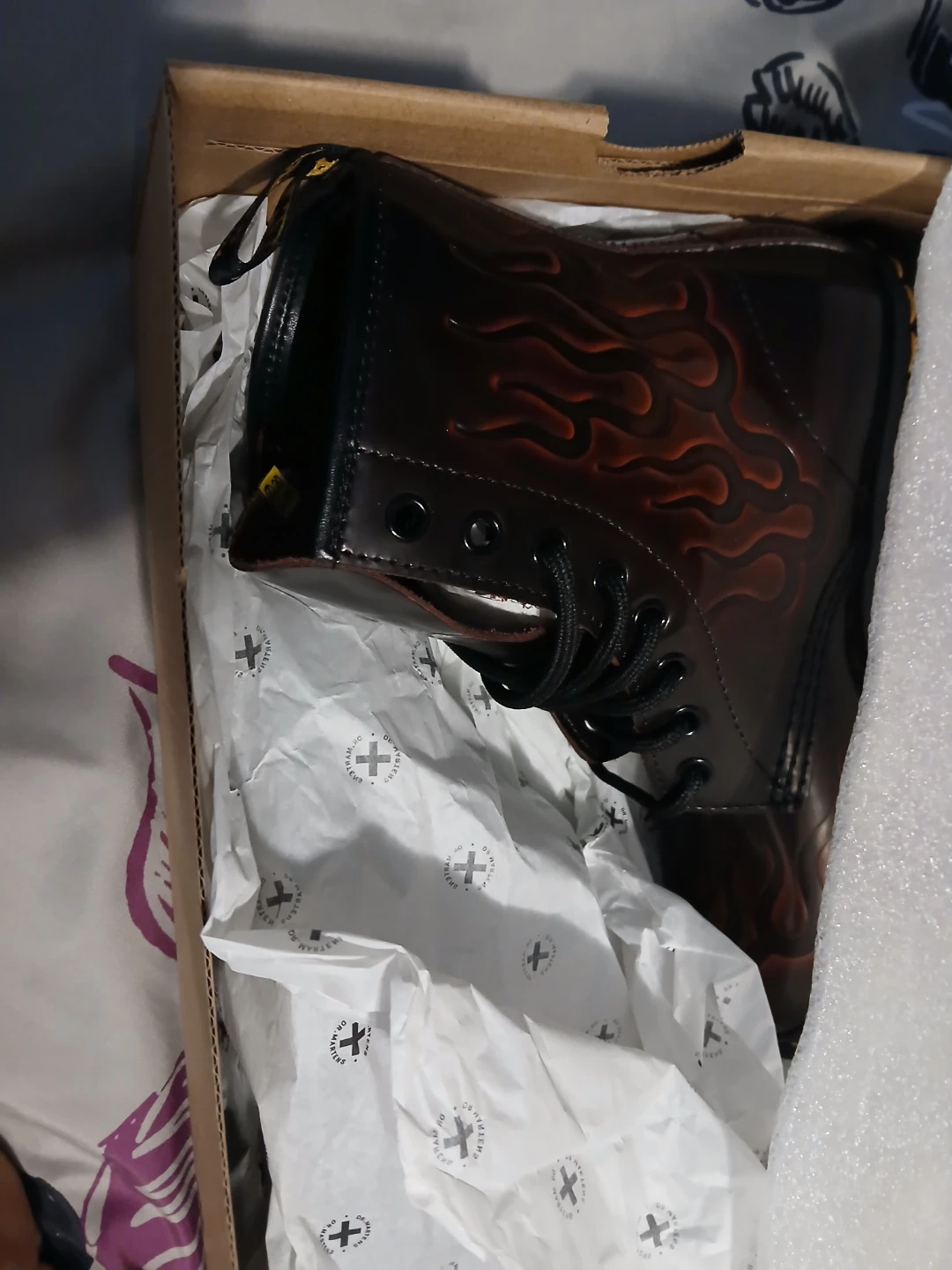 Dr. Martens 1460 Inferno boots in Cherry Red. These feature a flame design and lace-up closure. Included original box. Comes with extra laces.