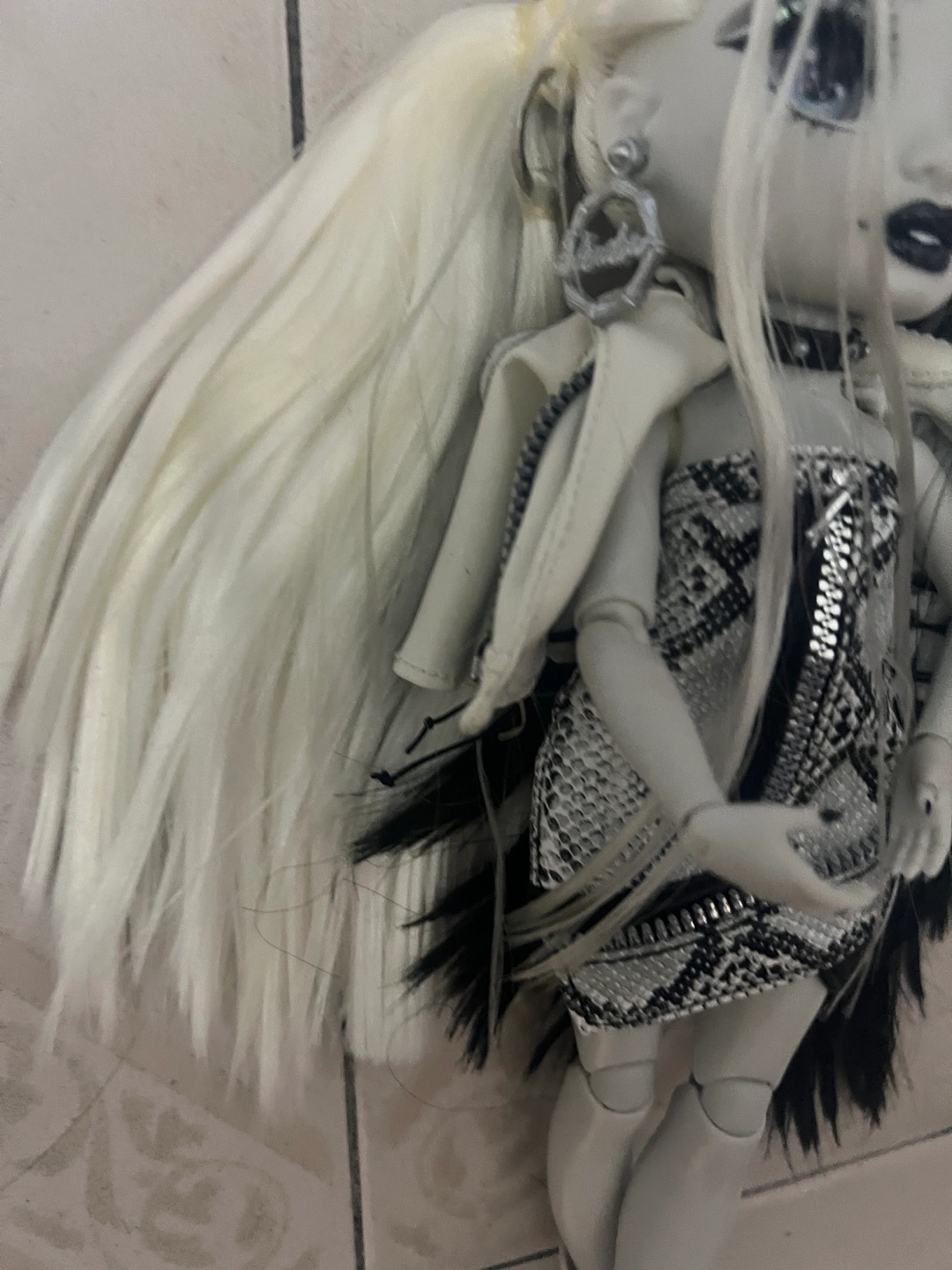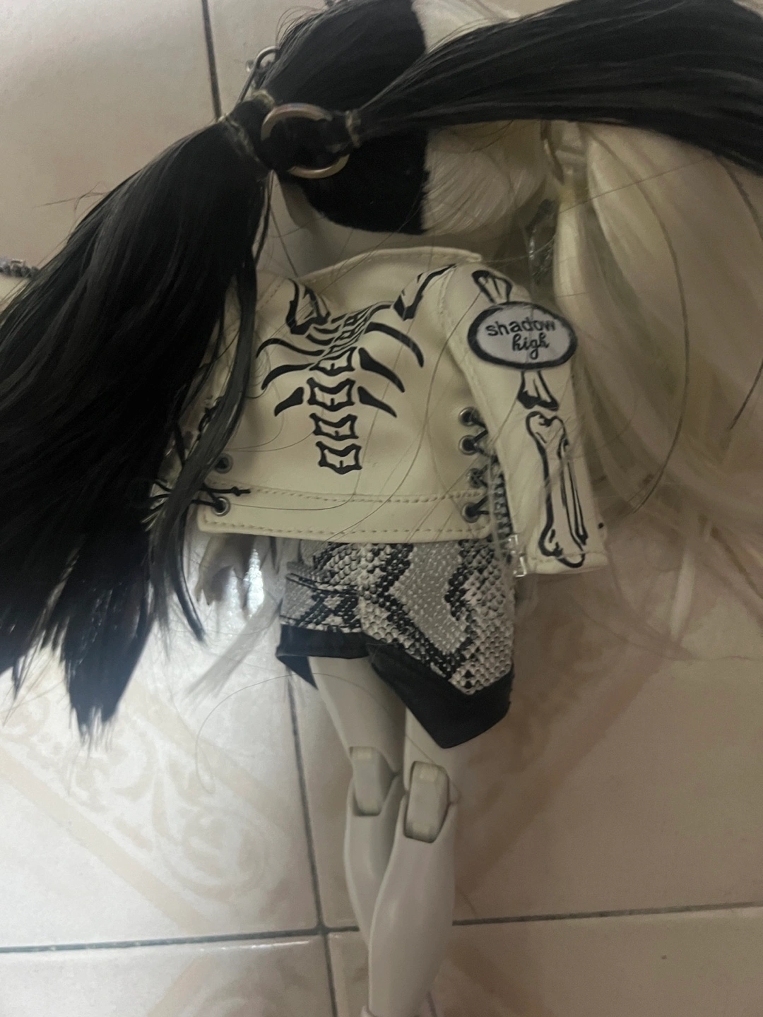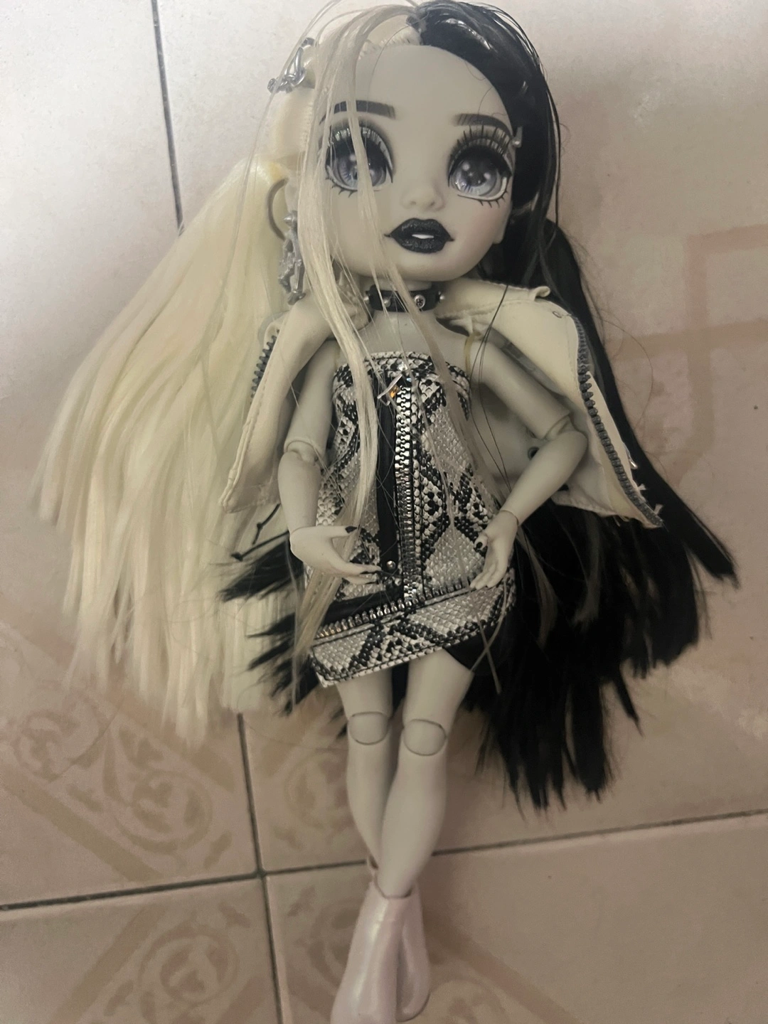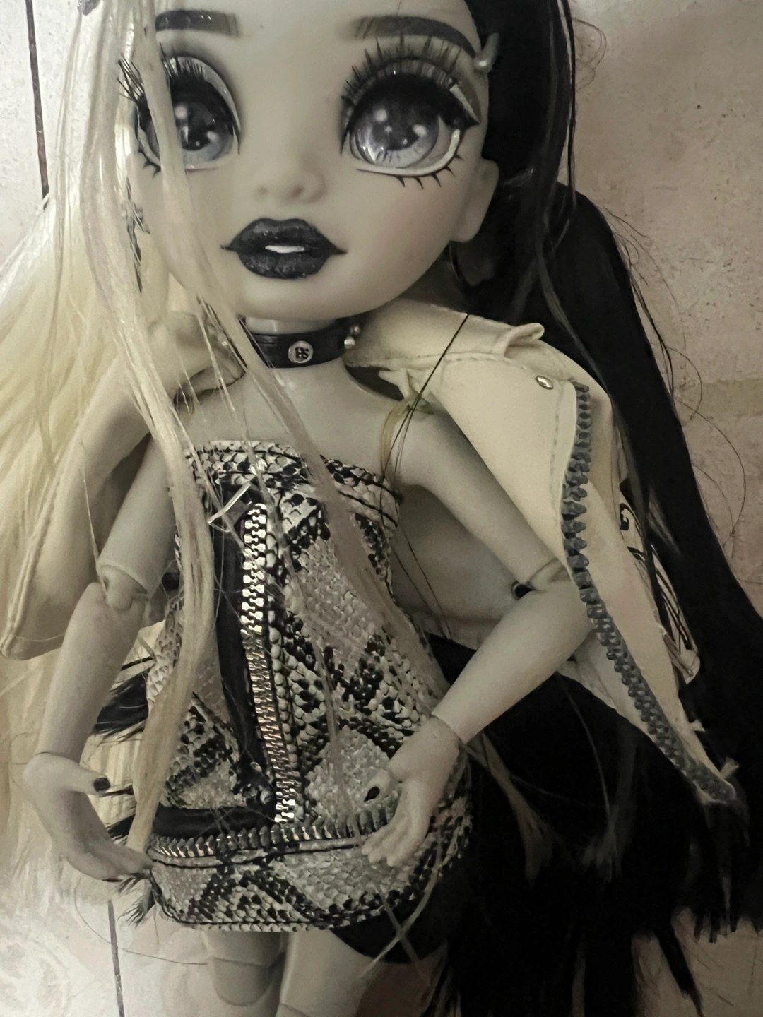 Selling a Shadow High doll. The doll has black and white hair and is wearing a snakeskin dress and a white jacket with a skeleton design on the back. Great condition