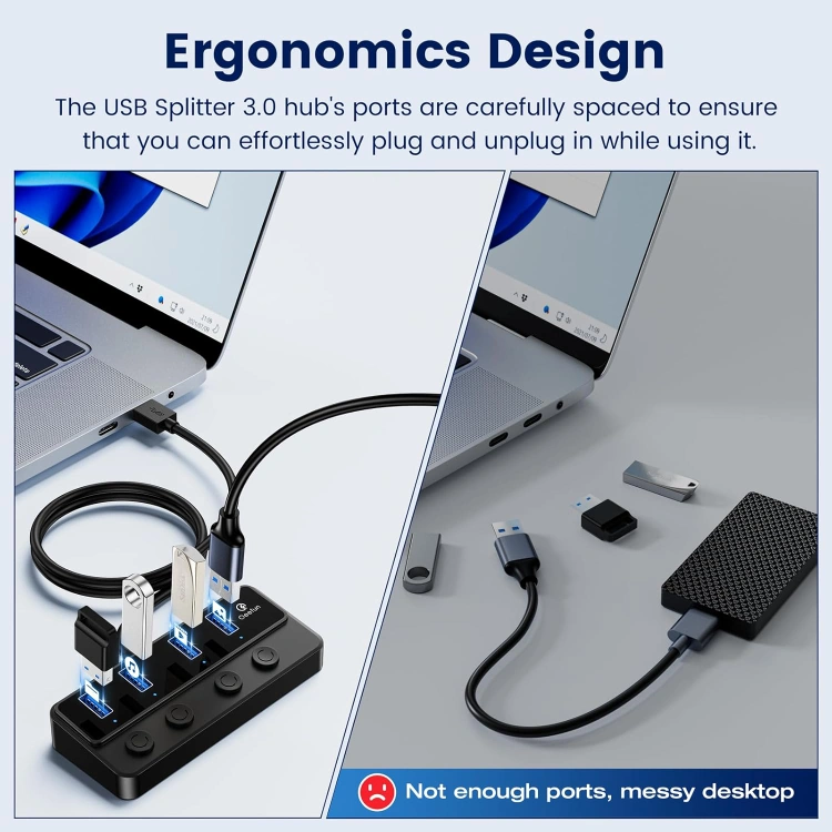 4-Port USB 3.0 Hub, Individual LED Power Switches, 5Gbps Data Transfer USB Splitter with 2ft Extension Cable, Multiple USB Extender for Laptop, PC, iMac, USB Flash Drives and More