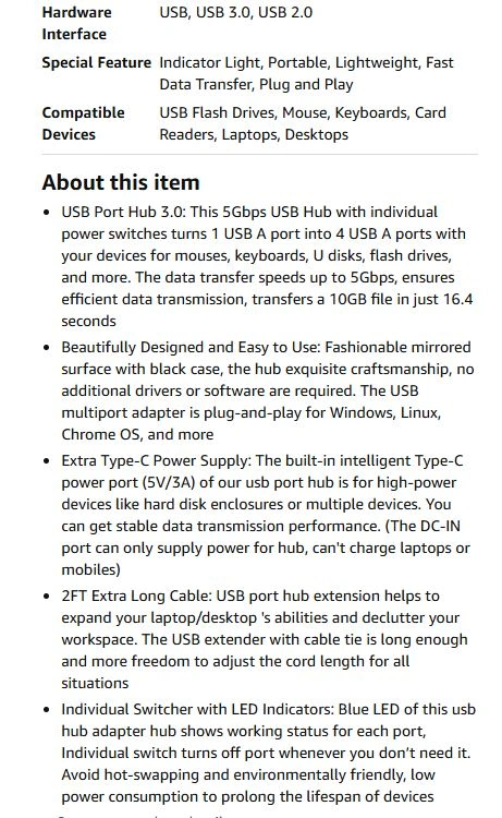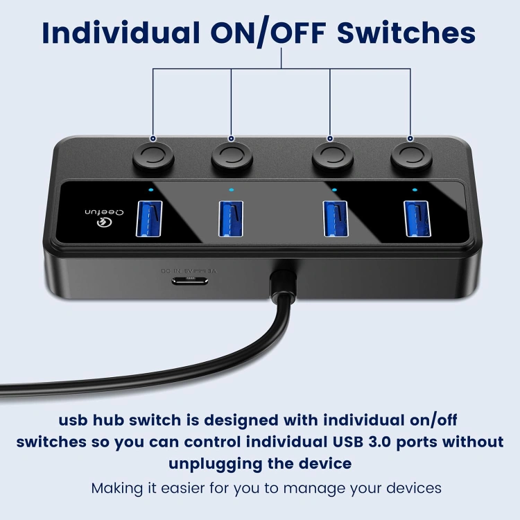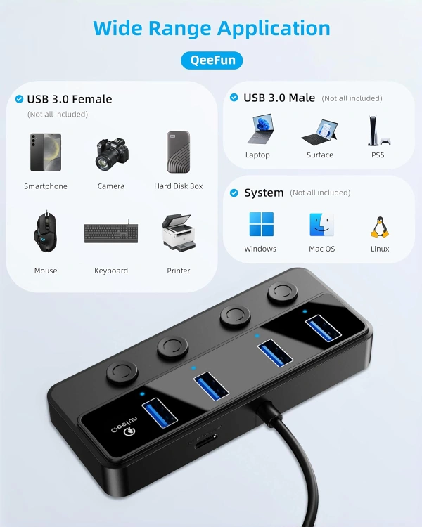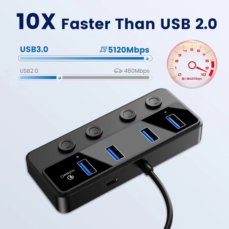 USB Port Hub 3.0: This 5Gbps USB Hub with individual power switches turns 1 USB A port into 4 USB A ports with your devices for mouses, keyboards, U disks, flash drives, and more. The data transfer speeds up to 5Gbps, ensures efficient data transmission, transfers a 10GB file in just 16.4 seconds