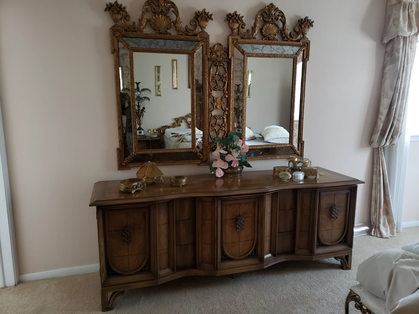 Bedroom set. Dresser with mirrors, chest, nightstand, king size sleep number adjustable bed and mattress.