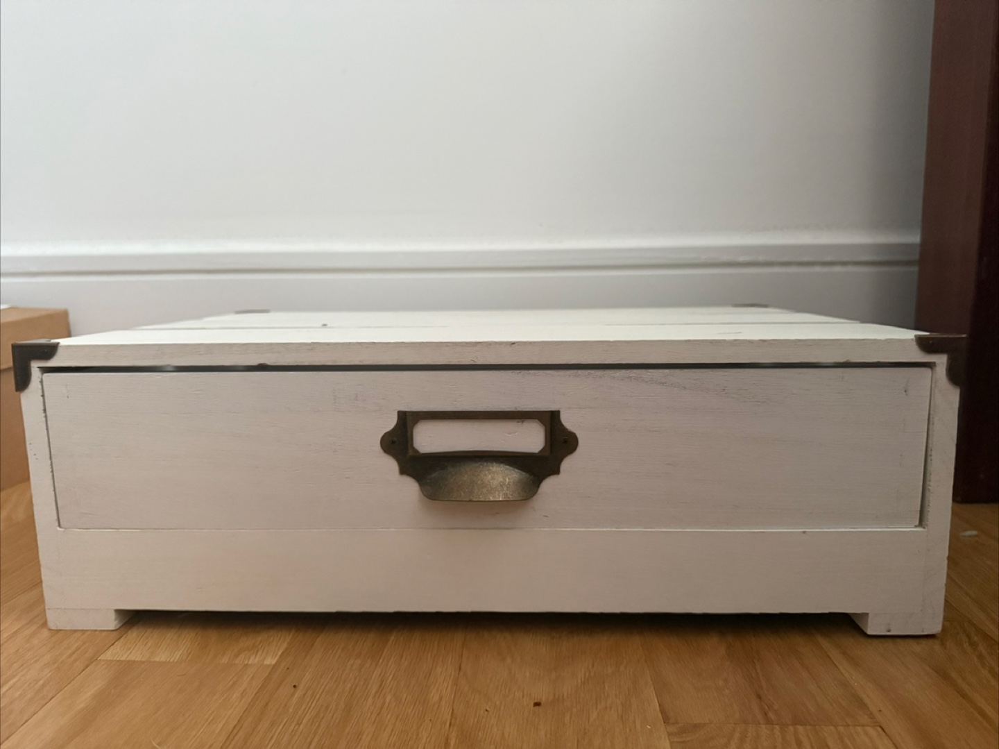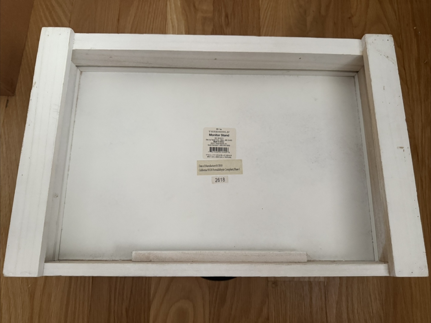 Selling a Threshold Wooden Monitor Stand in white! It's a cute little storage piece that could be used in many ways.