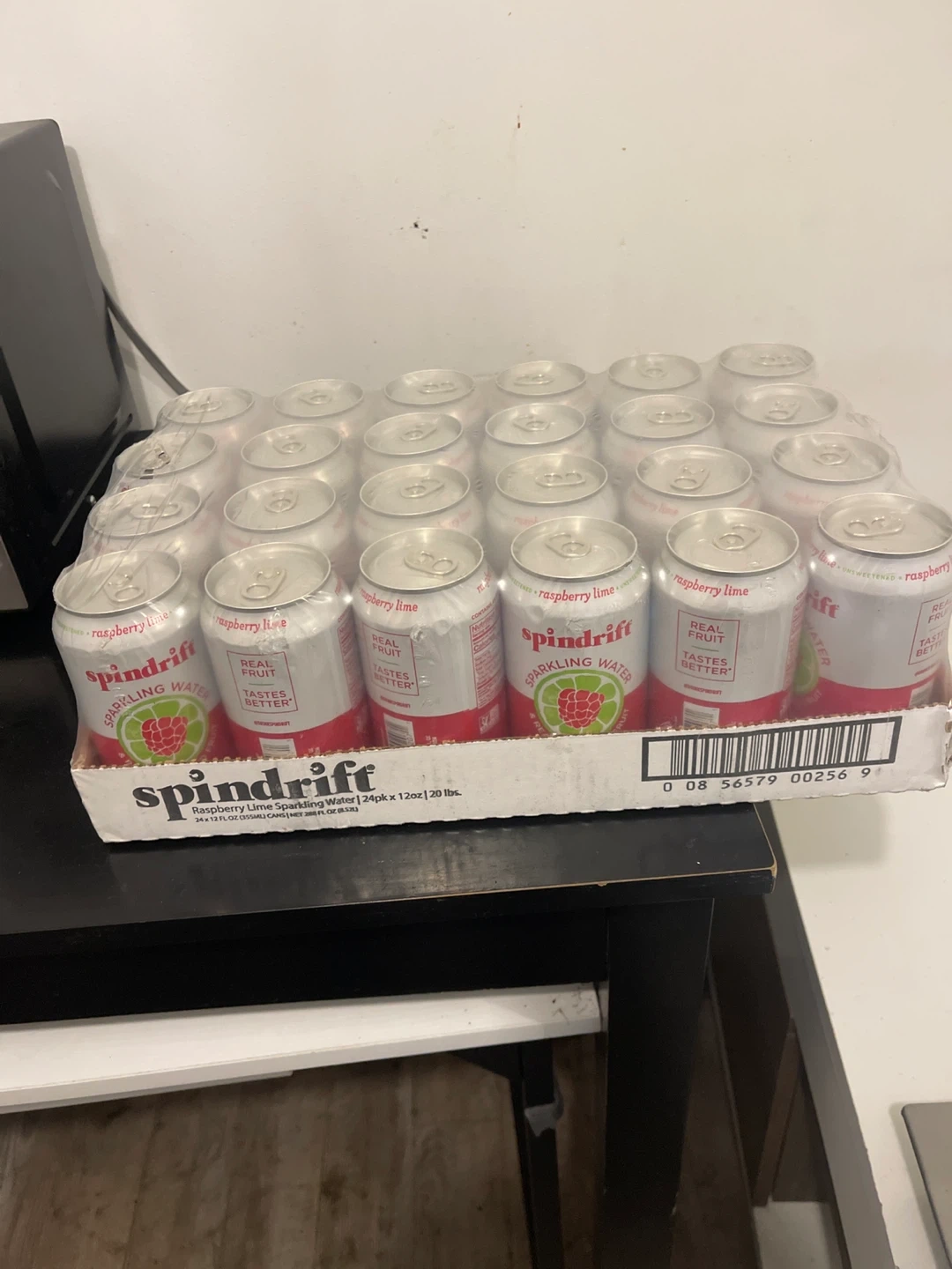 Selling a 24-pack of Spindrift Raspberry Lime Sparkling Water. It's unsweetened and made with real squeezed fruit.