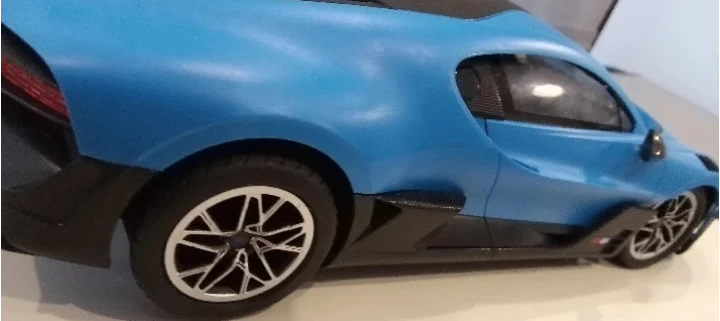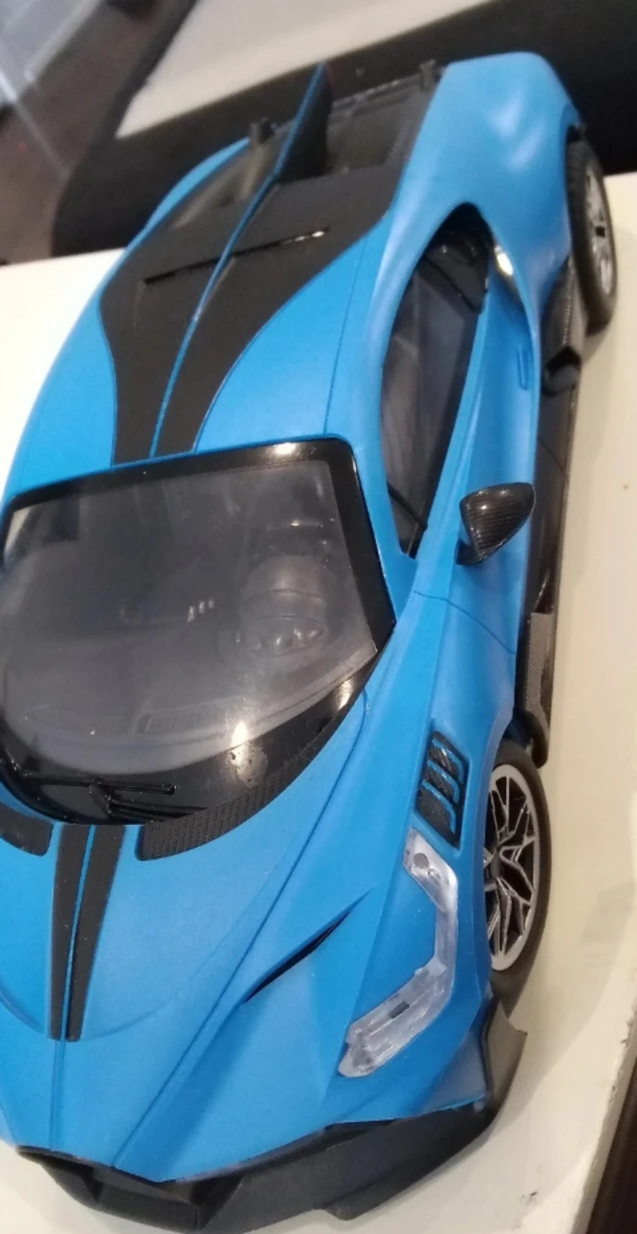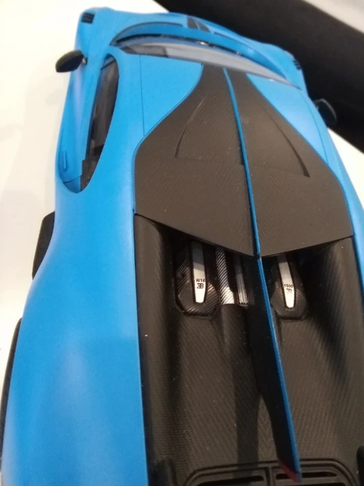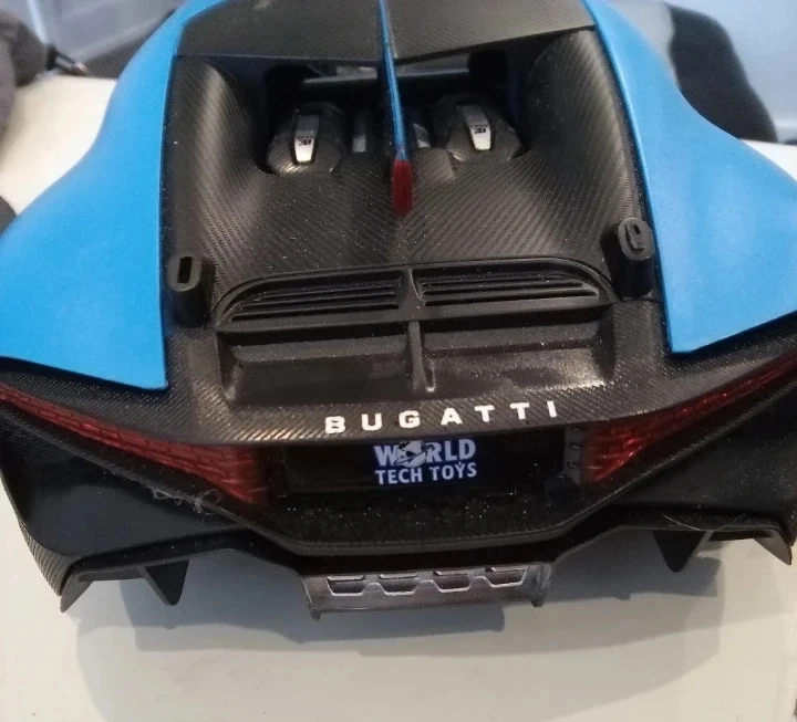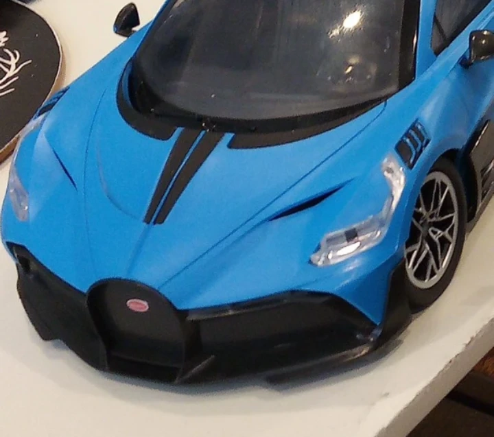 This is a blue Bugatti W16 plastic model car. It features intricate detailing and a sleek design. The model is a replica of a high-performance sports car.