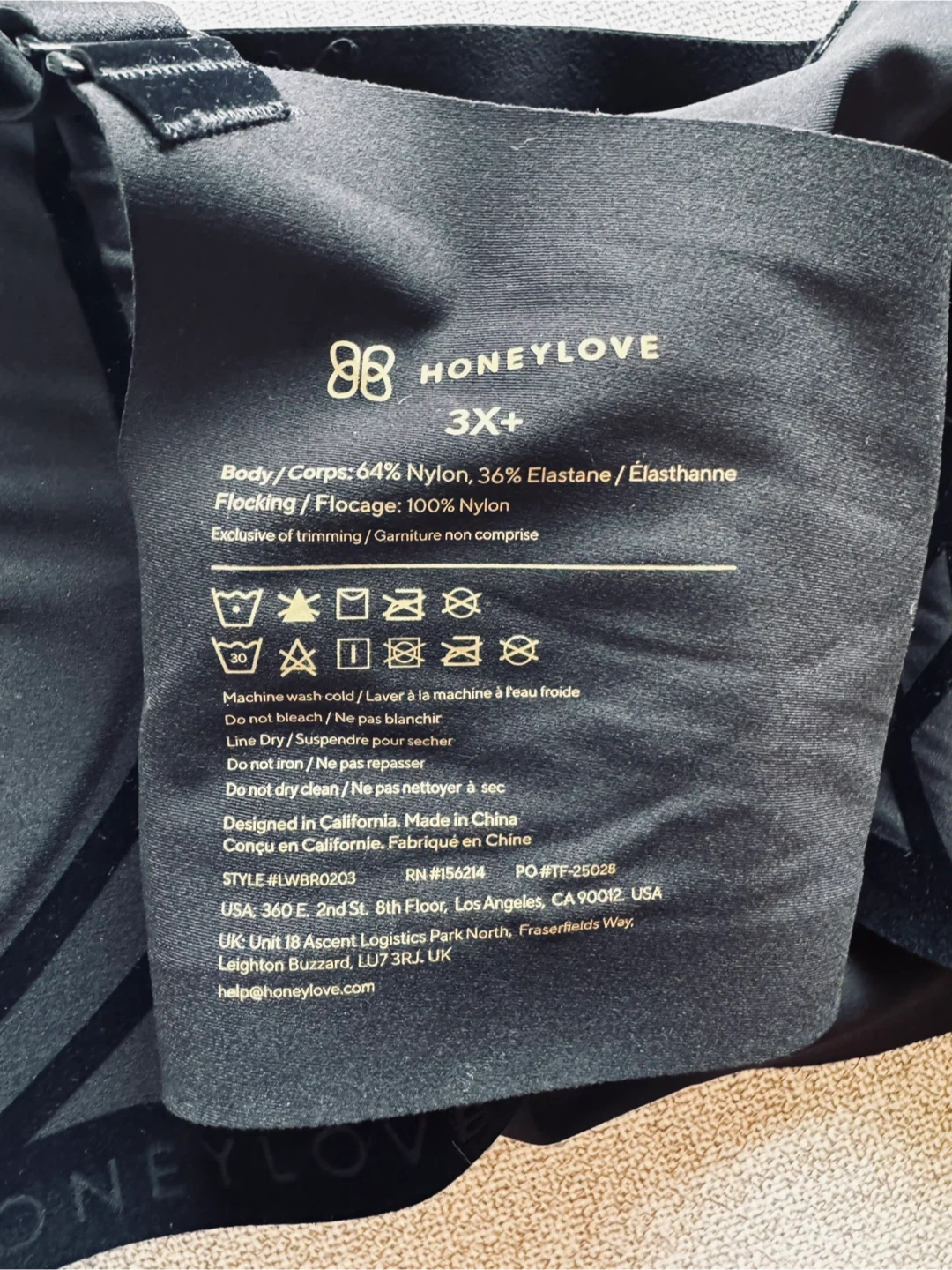 Selling a Honeylove bra in size 3X+. It's made of 64% nylon and 36% elastane. The flocking is 100% nylon. Designed in California. Never worn. Was a gift. Wrong sizeš Open to offers!