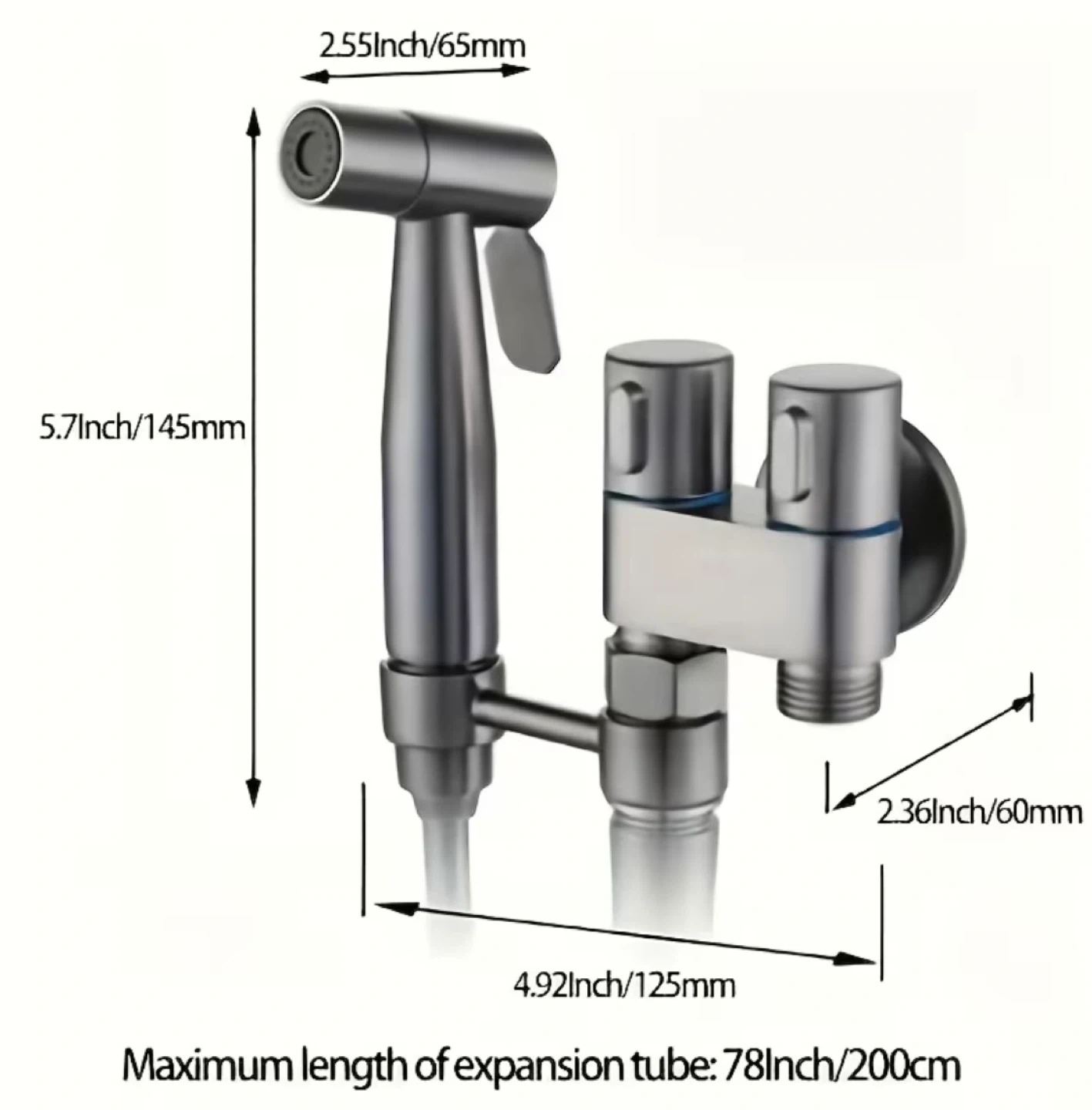 This is a bidet sprayer set, made of stainless steel. The sprayer head measures 5.7 inches in length and 2.55 inches wide. The maximum expansion length of the tube is 78 inches. It includes the sprayer, hose, and mounting bracket. The valve fits 1/2 inch toilet connector and pipe. Brand new, never used still in the box. Willing to negotiate or barter for a kitchen trash bin.