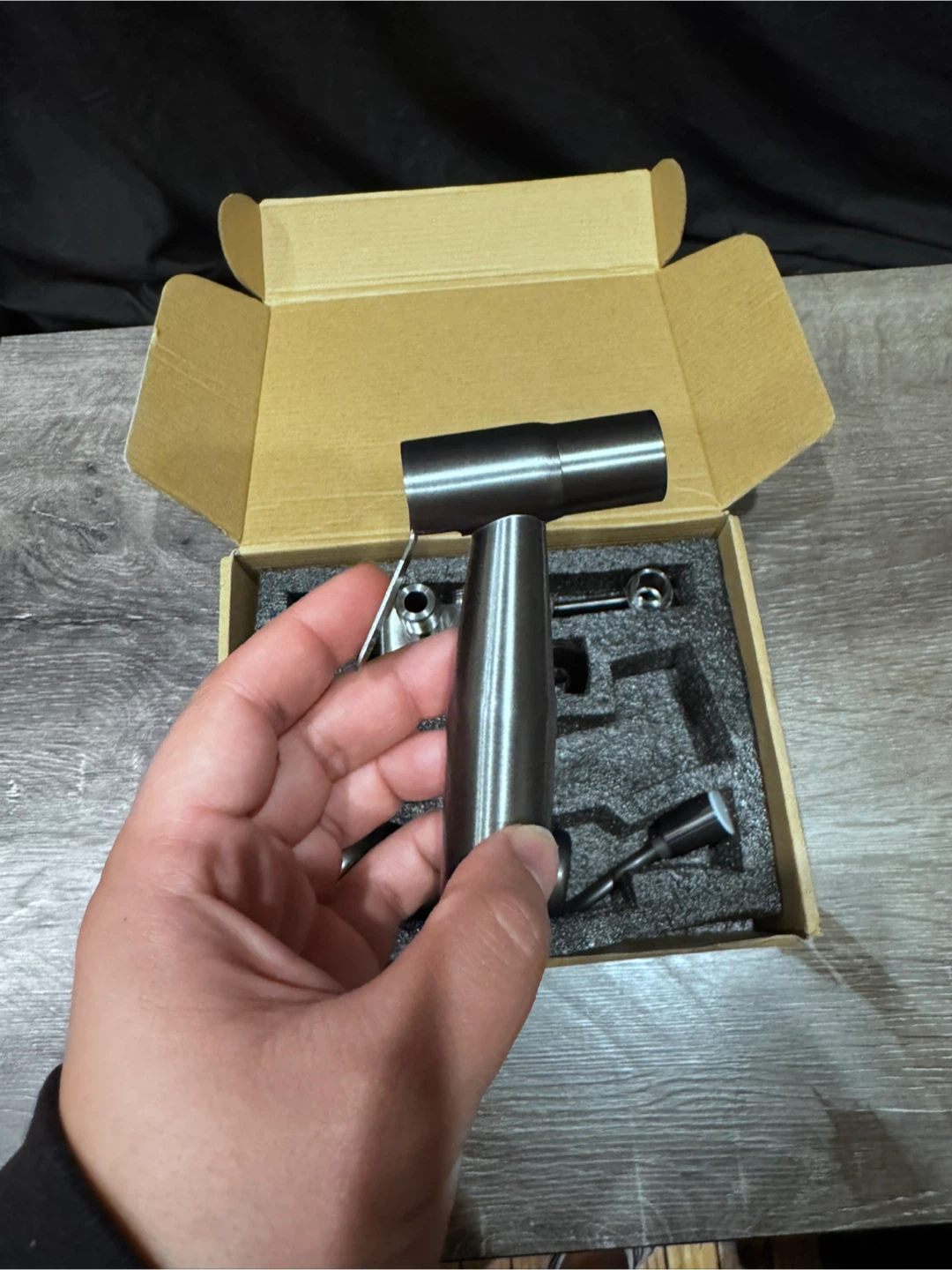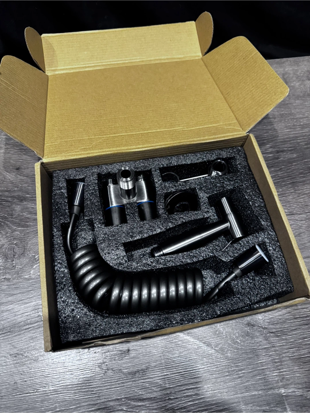 This is a bidet sprayer set, made of stainless steel. The sprayer head measures 5.7 inches in length and 2.55 inches wide. The maximum expansion length of the tube is 78 inches. It includes the sprayer, hose, and mounting bracket. The valve fits 1/2 inch toilet connector and pipe. Brand new, never used still in the box. Willing to negotiate or barter for a kitchen trash bin.