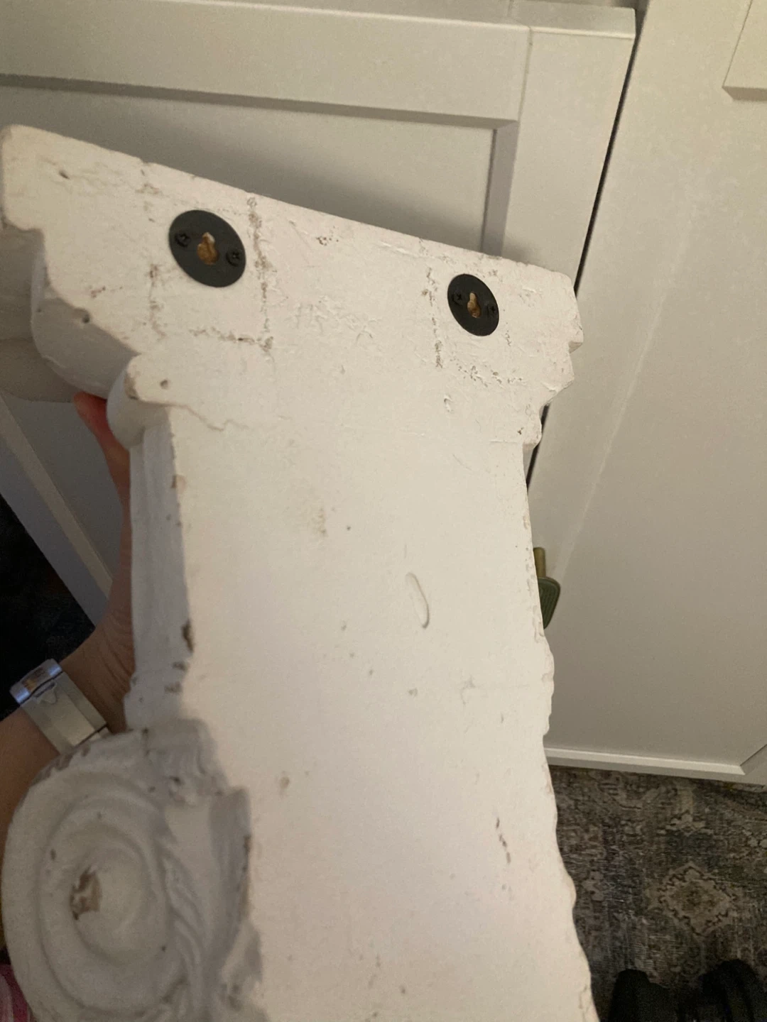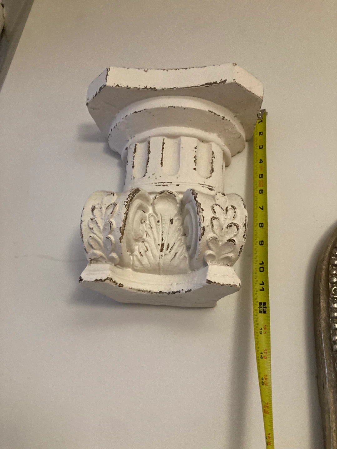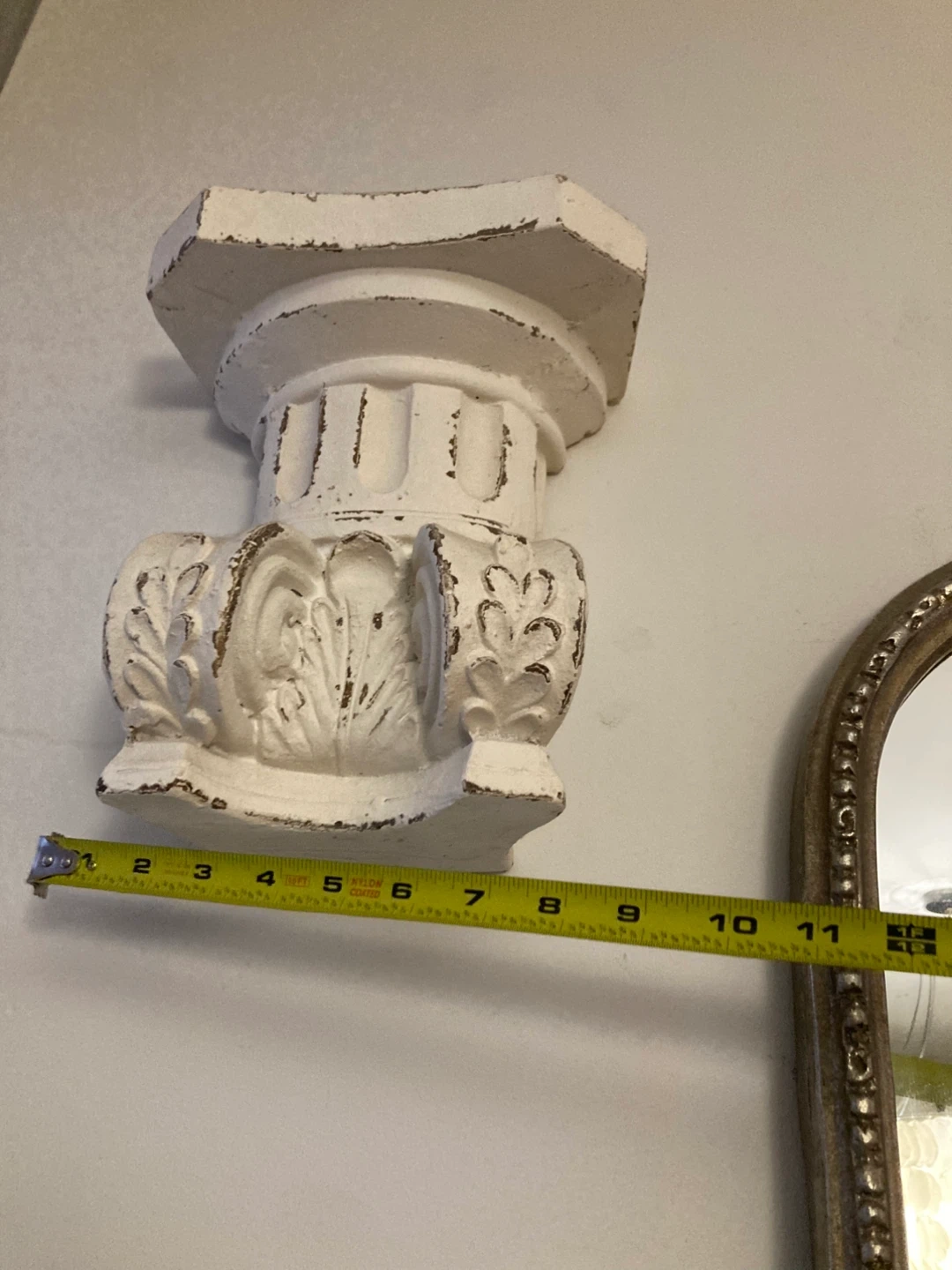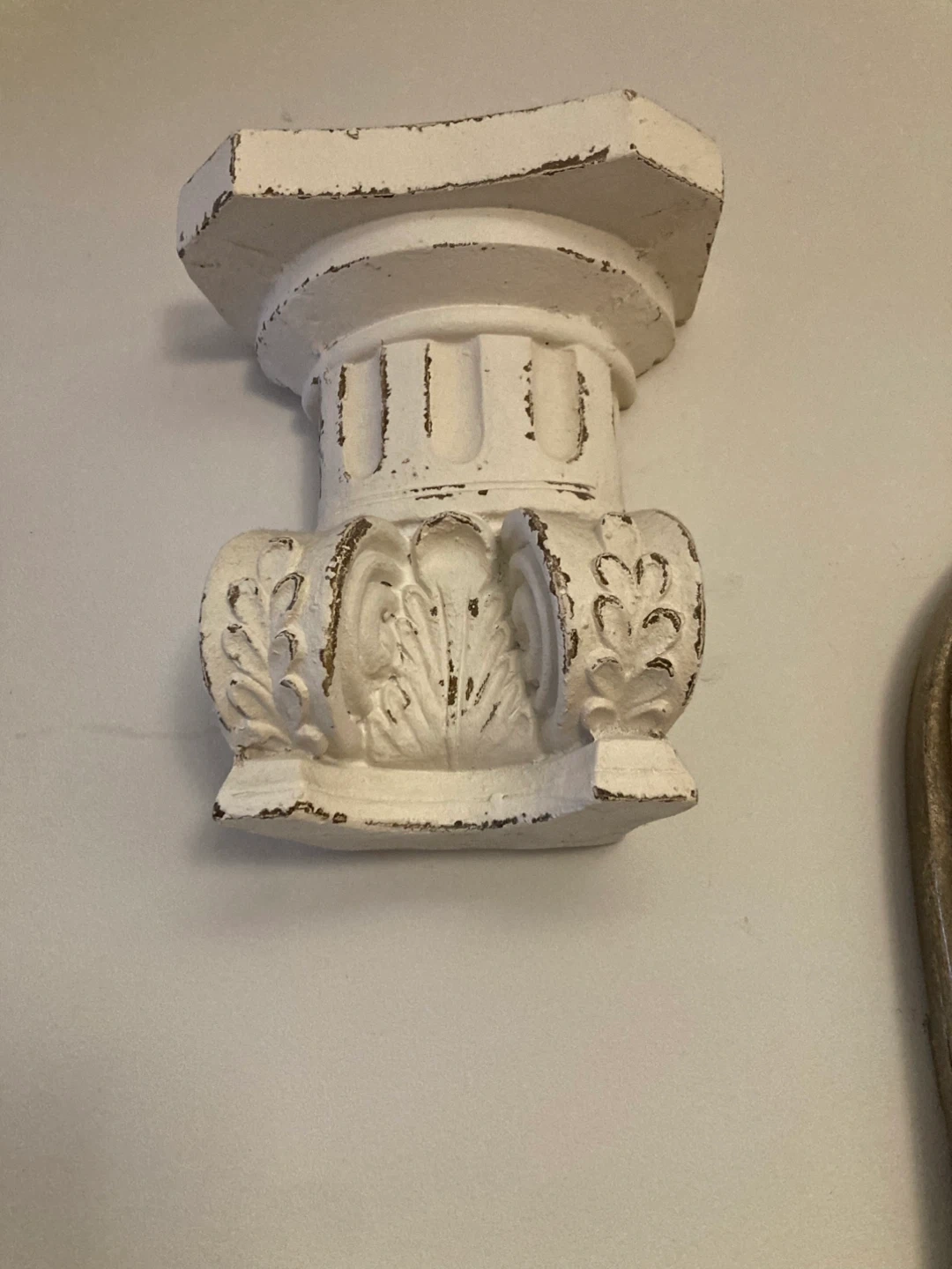 Add a touch of classic style to your home with these decorative column shelf brackets. They're white with a distressed finish, giving them a vintage look. Each bracket measures approximately 12 inches tall and 8 inches wide. These would be great for displaying small items on a shelf or wall.