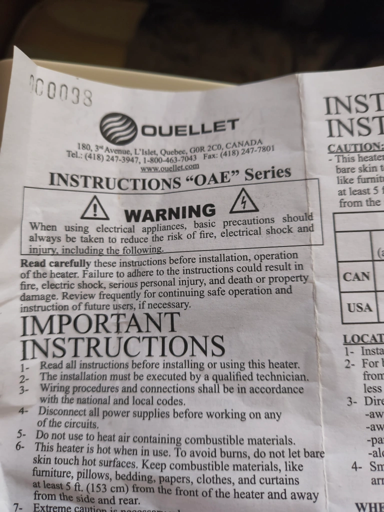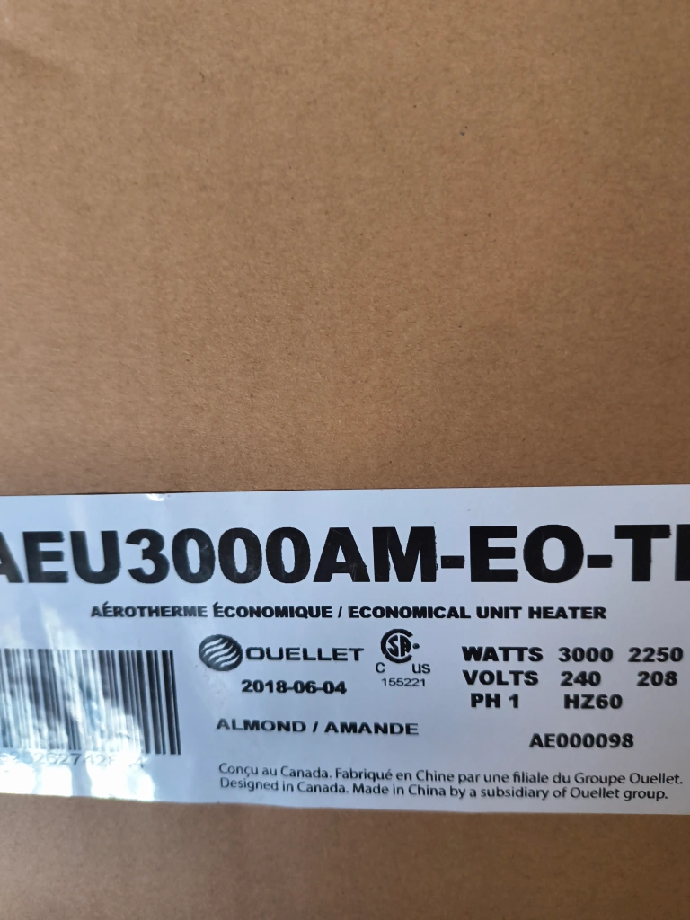 Selling an Ouellet AEU3000AM-EO-TI Economical Unit Heater. It's an aerotherme économique designed and manufactured in Canada. It operates at 240/208 volts with 3000/2250 watts. The color is almond/amande. Instructions included