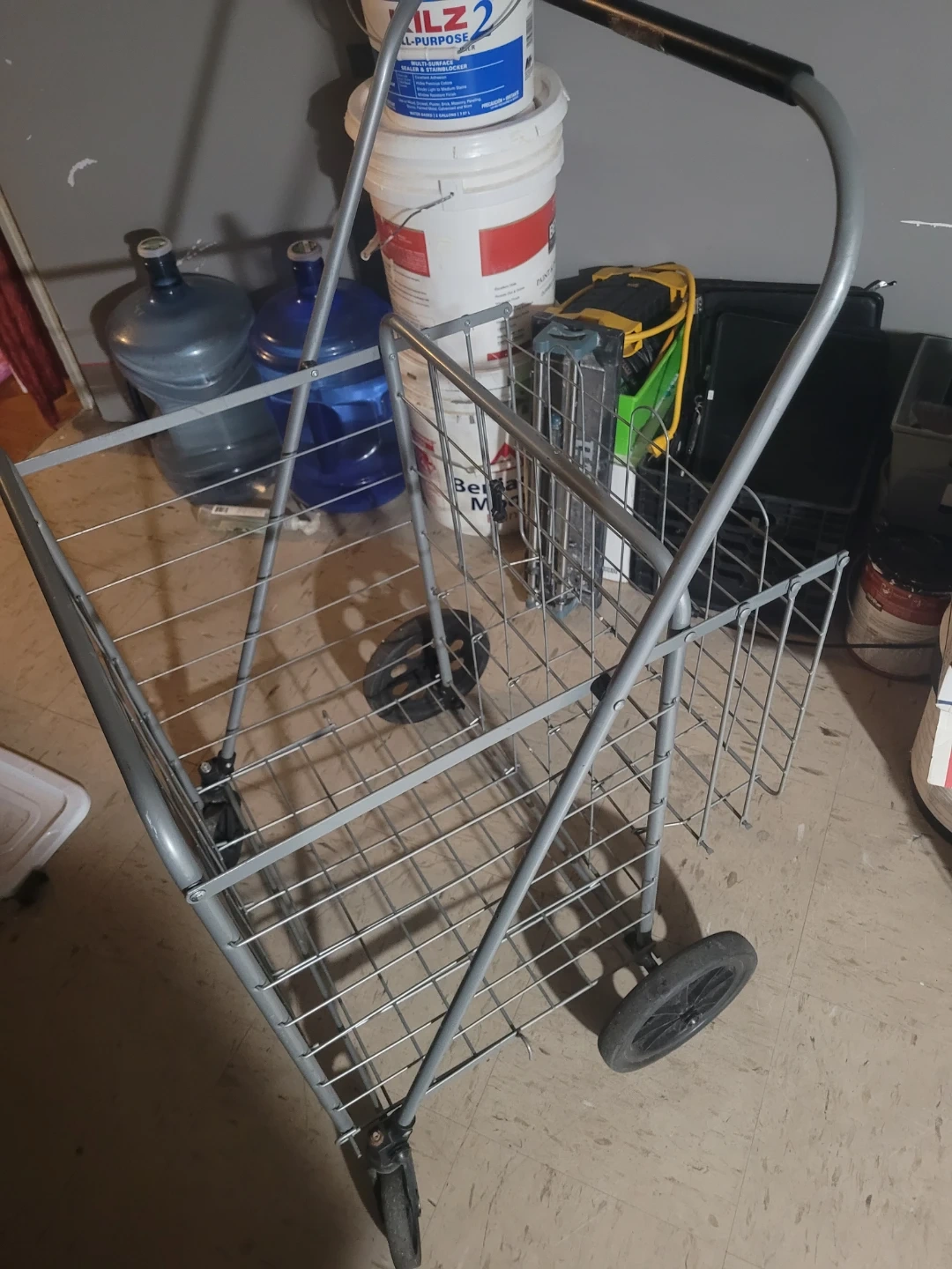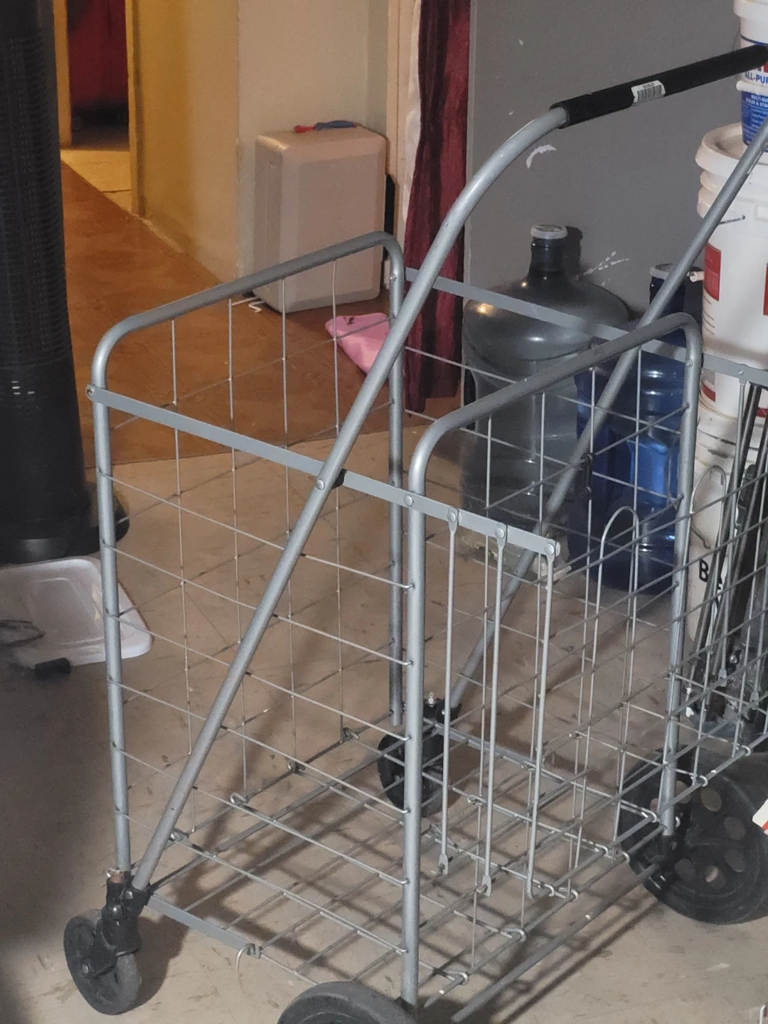 This is a lightweight folding shopping cart. It's made of metal wire and has two wheels for easy transport. Perfect for carrying groceries or laundry!