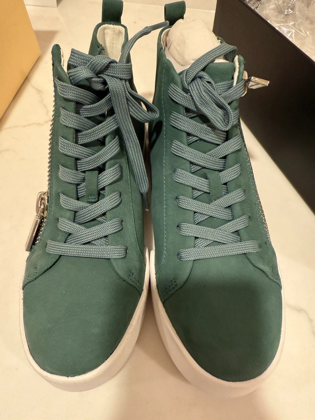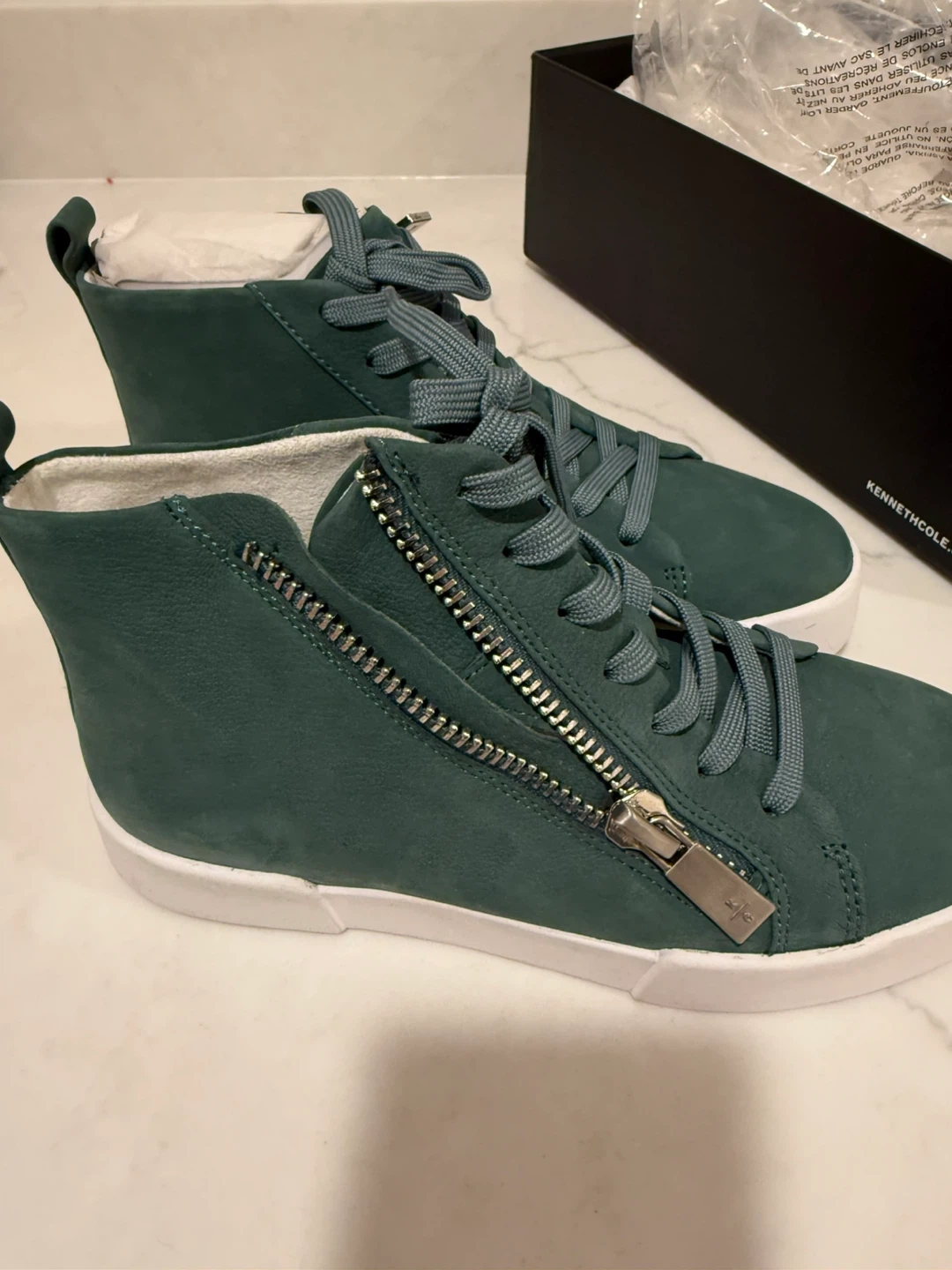 Selling a pair of Kenneth Cole Reaction high-top sneakers in a lovely green color! They are in new condition and come with the original box. These sneakers are a stylish and comfortable choice for everyday wear. The size is 5.5 us