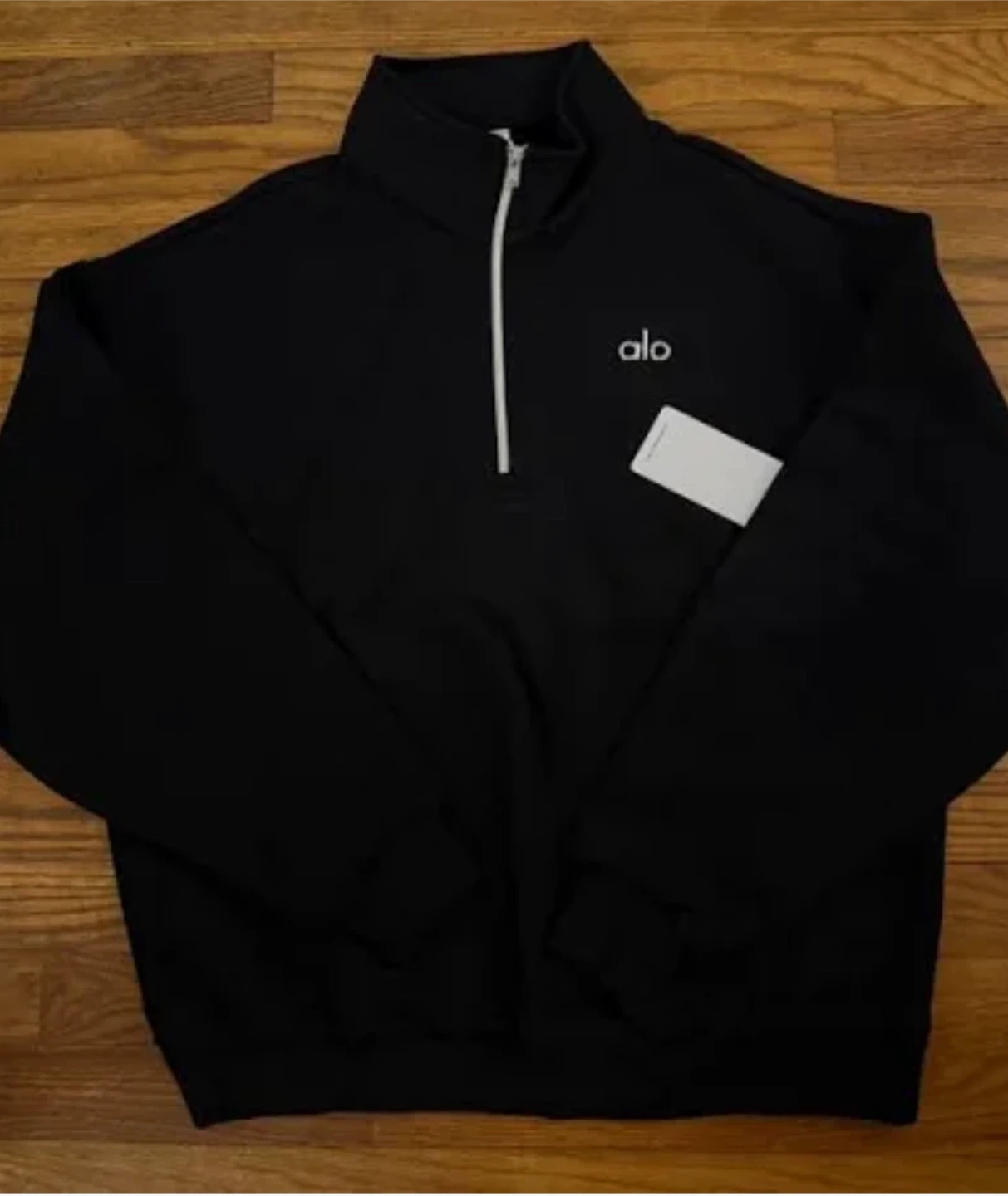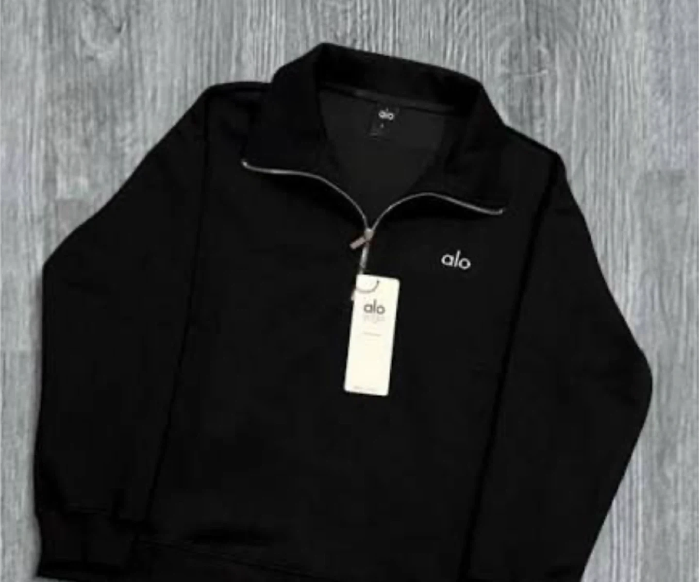 Alo Yoga black quarter-zip sweatshirt. It's a comfortable pullover style with a zippered neckline. Made from soft fabric.