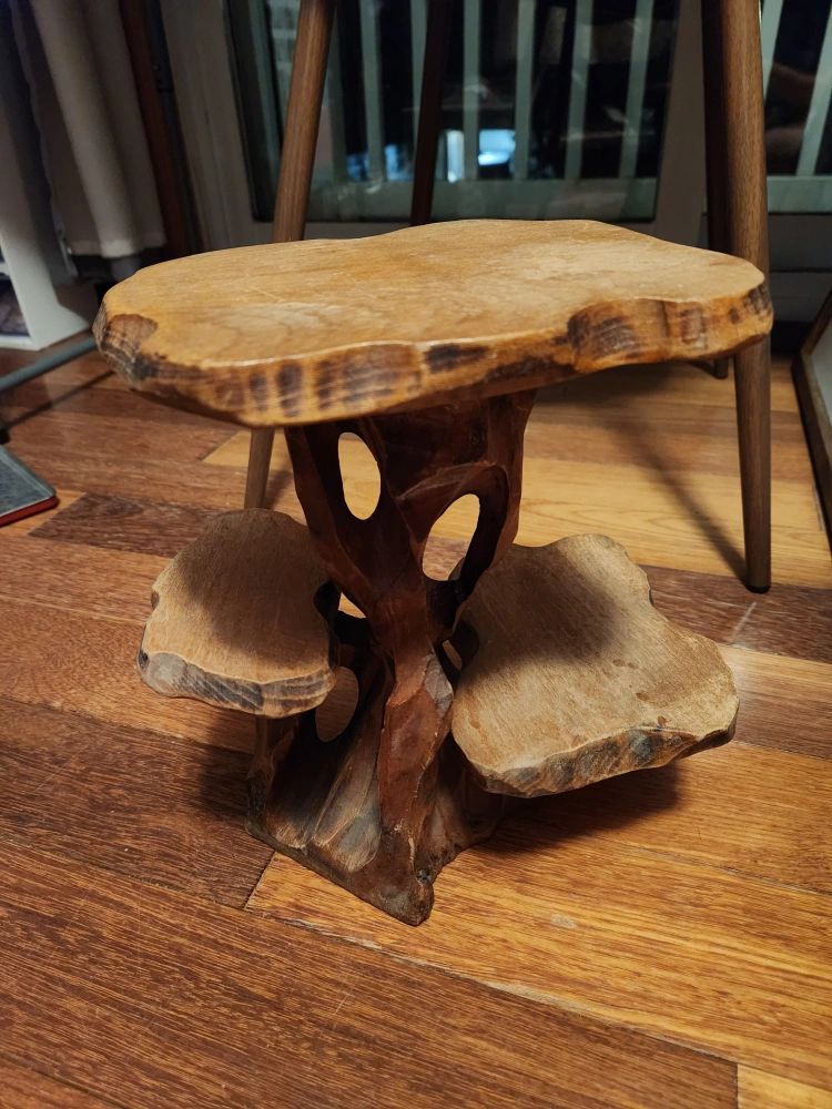 The solid wood stand features an irregular, organic shape. The top is a single piece. A pair of smaller platforms are below. The stand's base is wide, with a textured look. This stand can perfectly hold small items and mesures approximately 1ft.