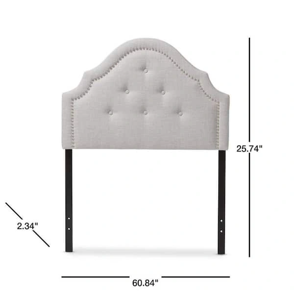This tufted Queen Greyish Beige headboard features nailhead trim detailing. It's upholstered in a light gray fabric. Width is 60.84", height is 25.74", and depth is 2.34". Perfect for adding a touch of elegance to your bedroom!