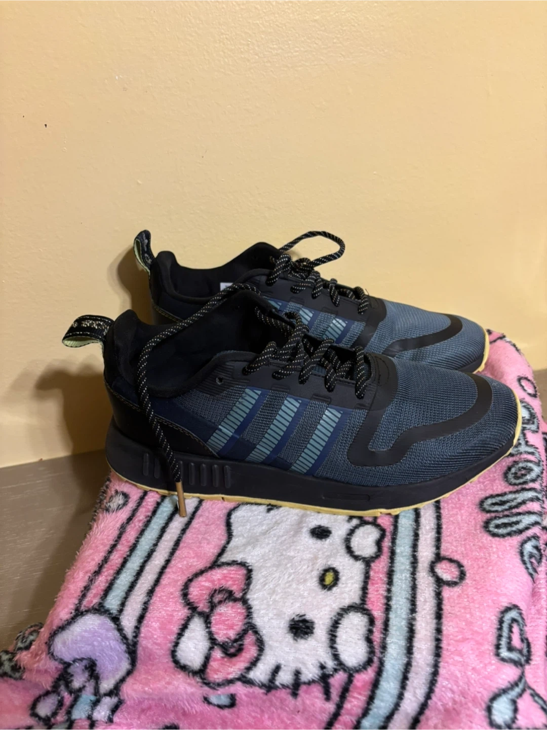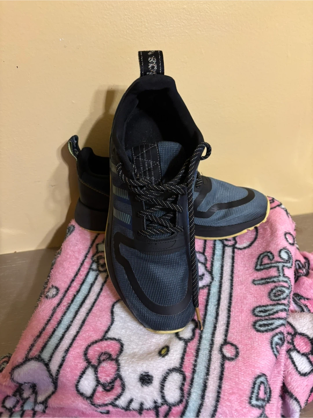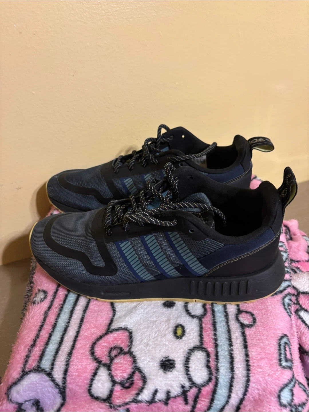 These are Adidas ZX Flux sneakers in a dark blue and black colorway with blue accents. They feature a mesh upper and a rubber sole. Perfect for everyday wear!