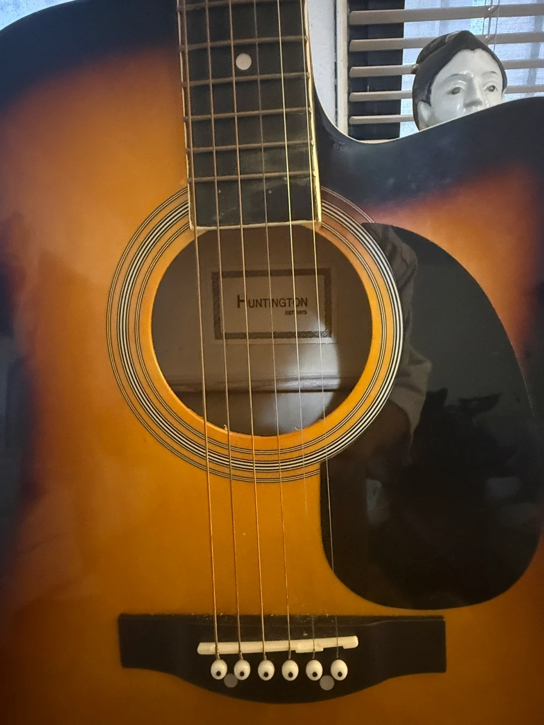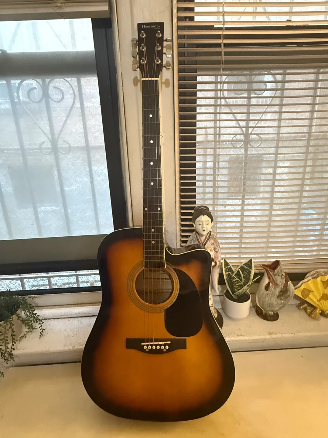 Acoustic guitar with a sunburst finish. It's a Huntington model. This guitar is great for learning or casual playing.