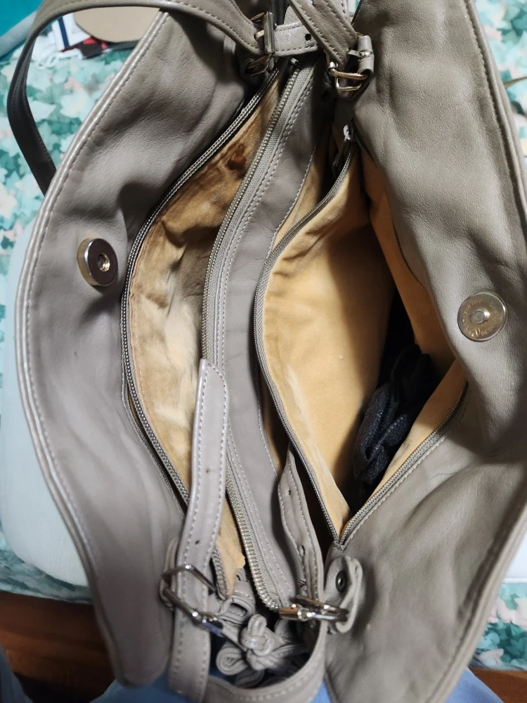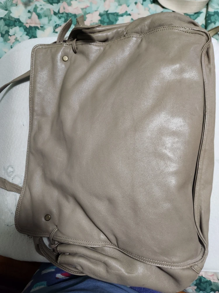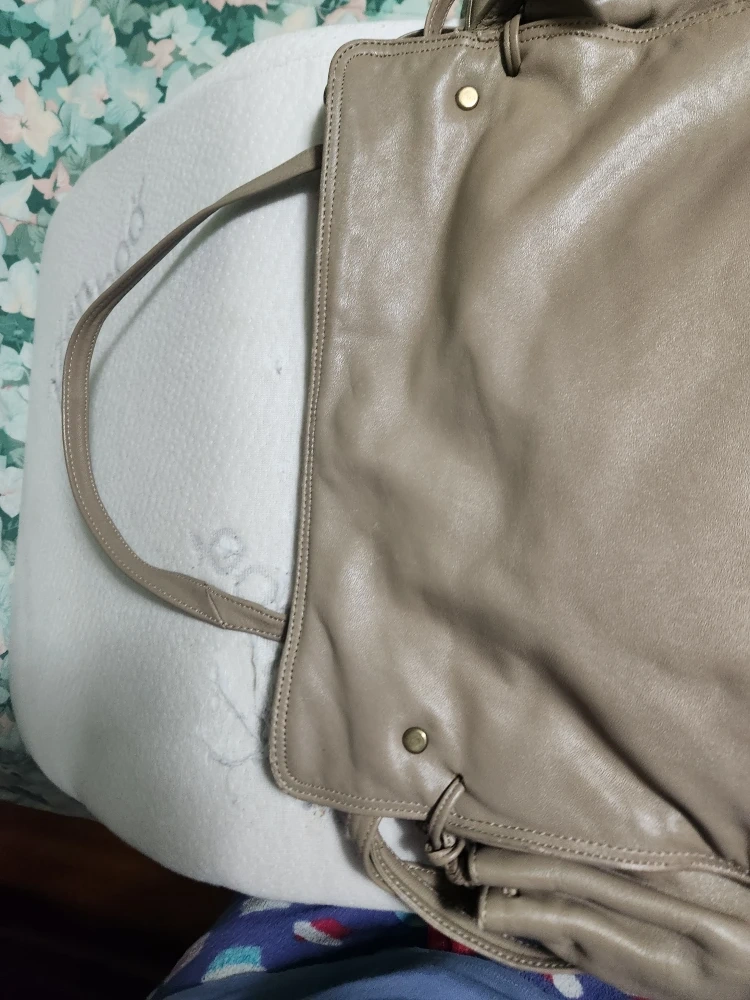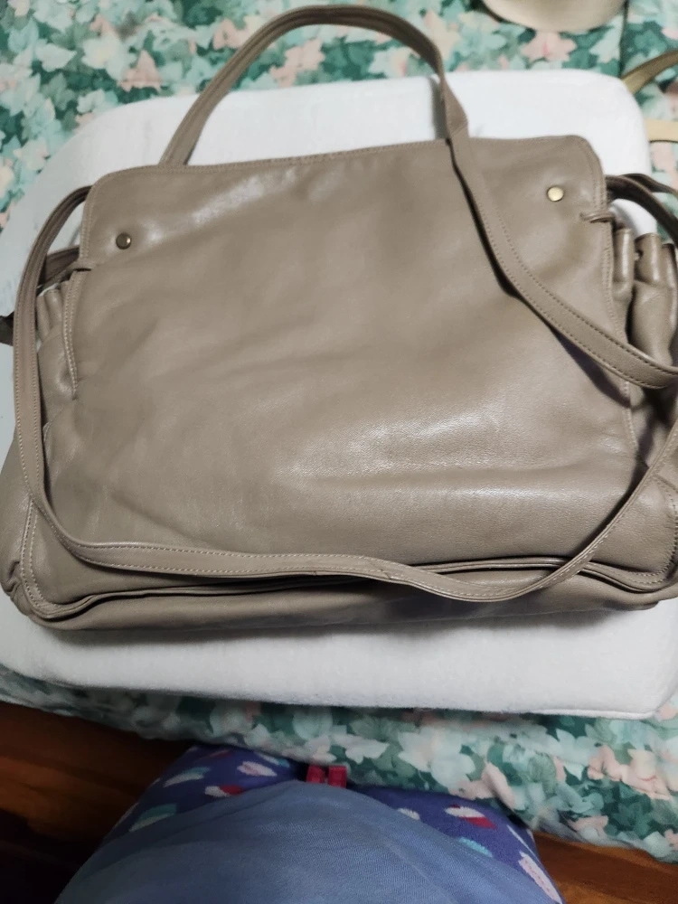 This is a stylish leather tote bag in a neutral beige/gray color. It's a great everyday bag with plenty of room inside!