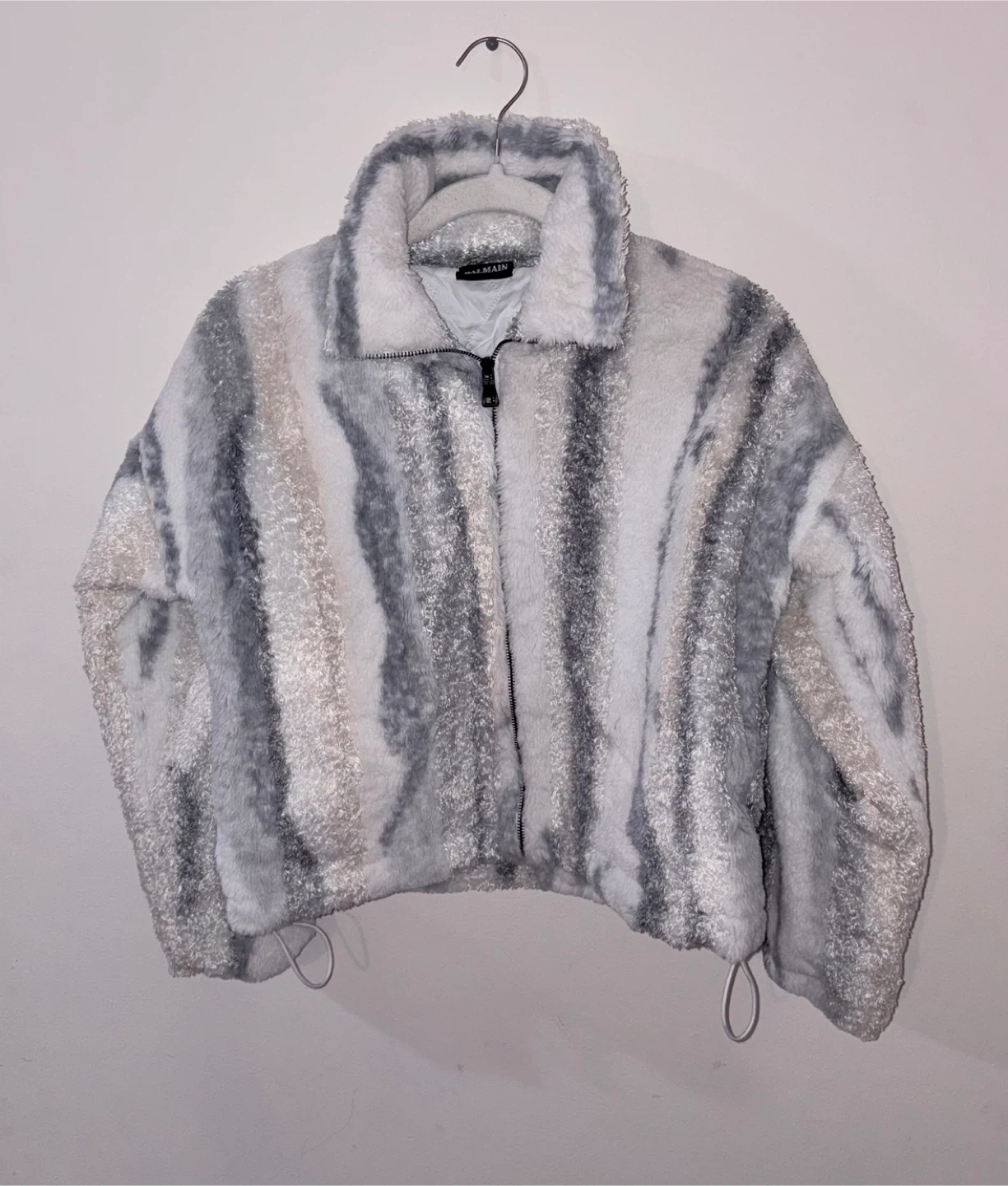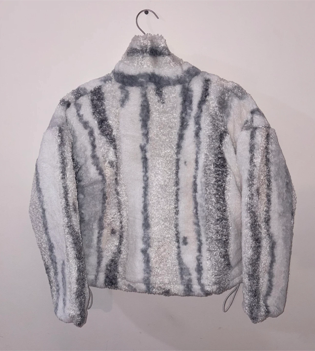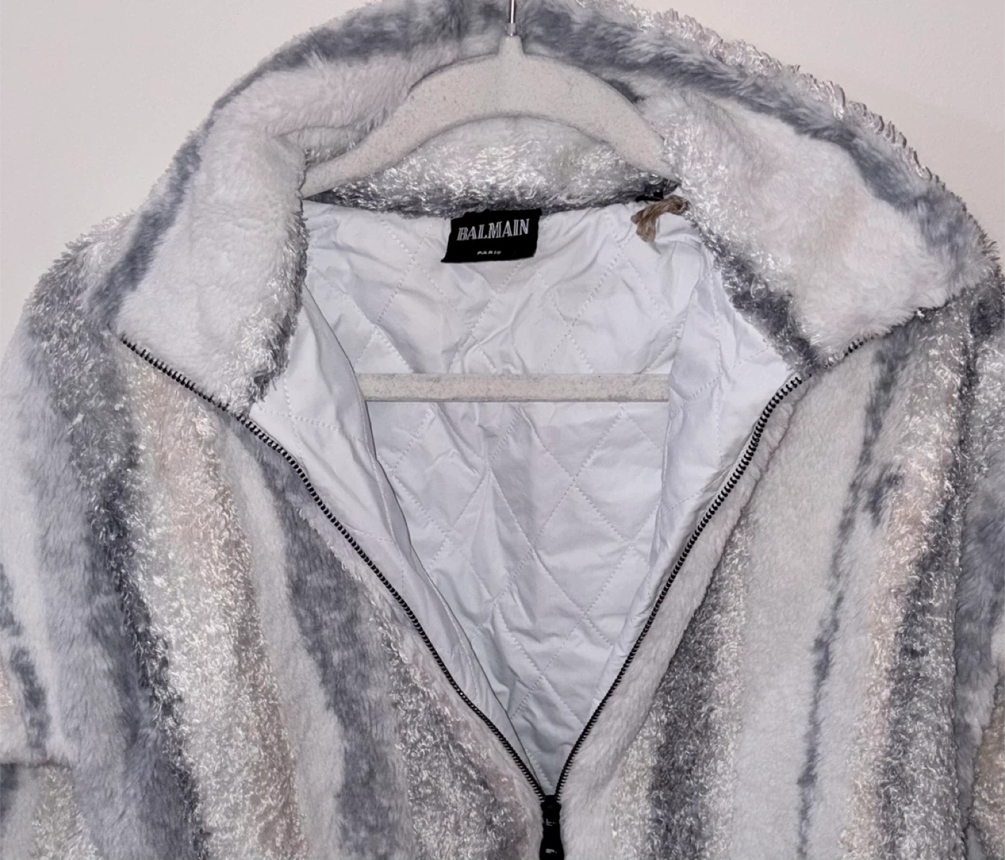 Balmain Paris jacket featuring a striking faux fur striped design. It's fully lined with a quilted interior and a zip-up front. Drawstrings at the hem allow for adjustable fit.
