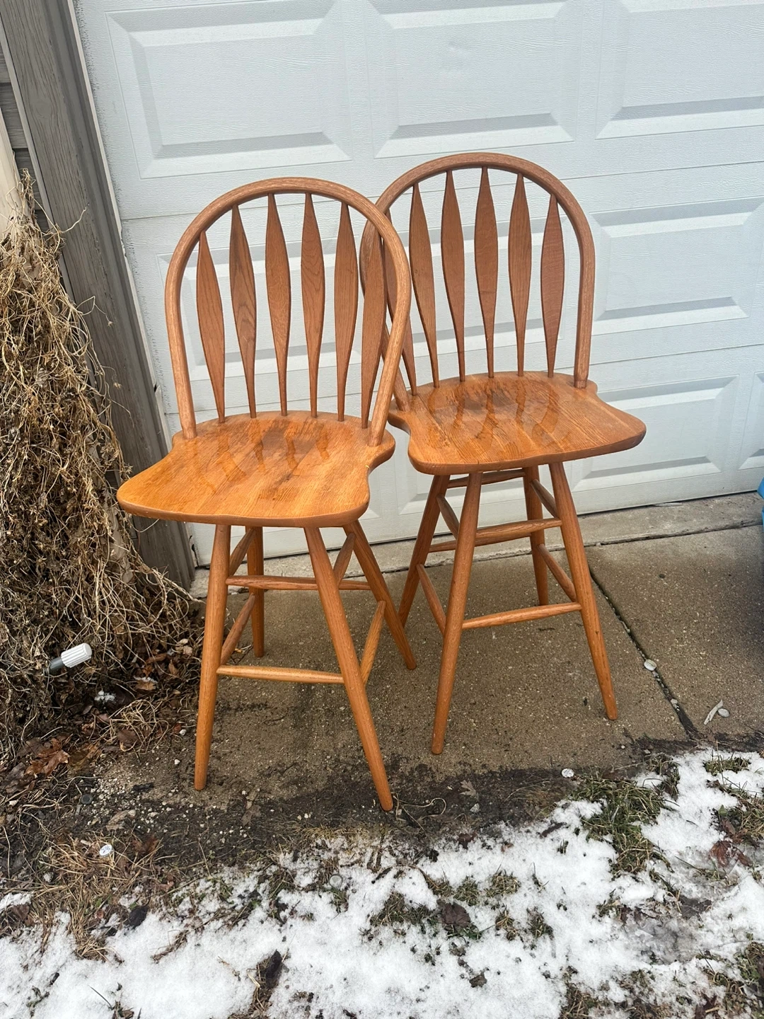 Selling a set of two Windsor style bar stools. They are in great condition and would look great in any kitchen or bar area! The chairs are made of wood and have a natural finish