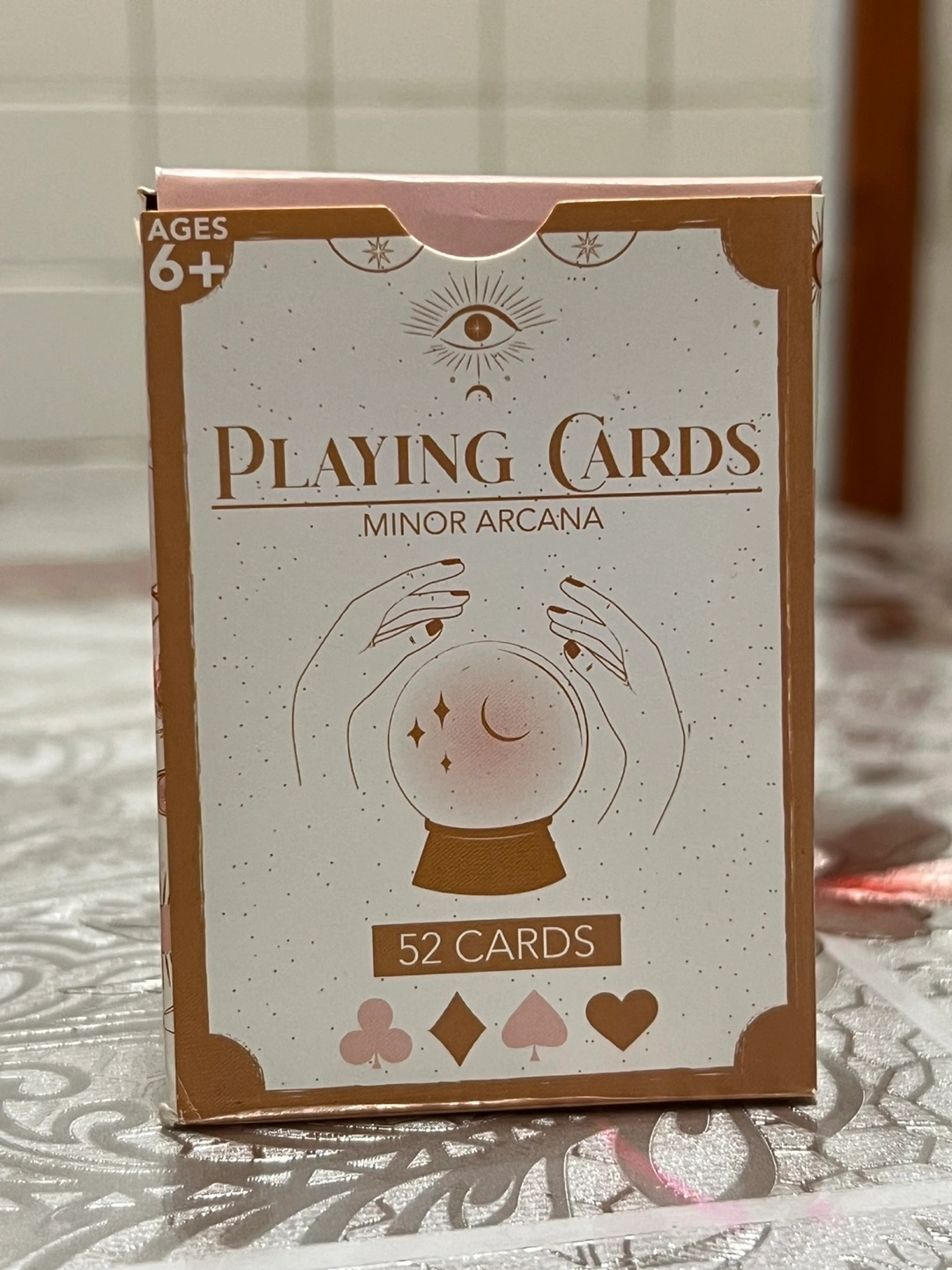 New deck of playing cards. Minor Arcana theme. 52 cards included. Ages 6+. Made in China.