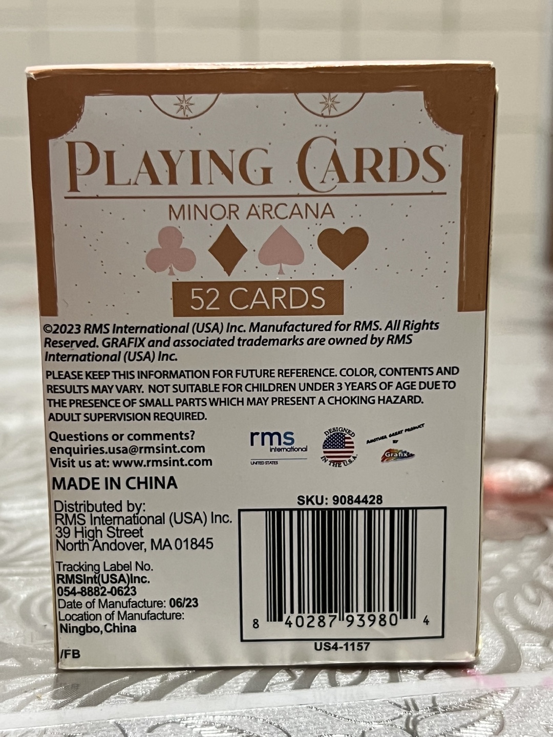New deck of playing cards. Minor Arcana theme. 52 cards included. Ages 6+. Made in China.