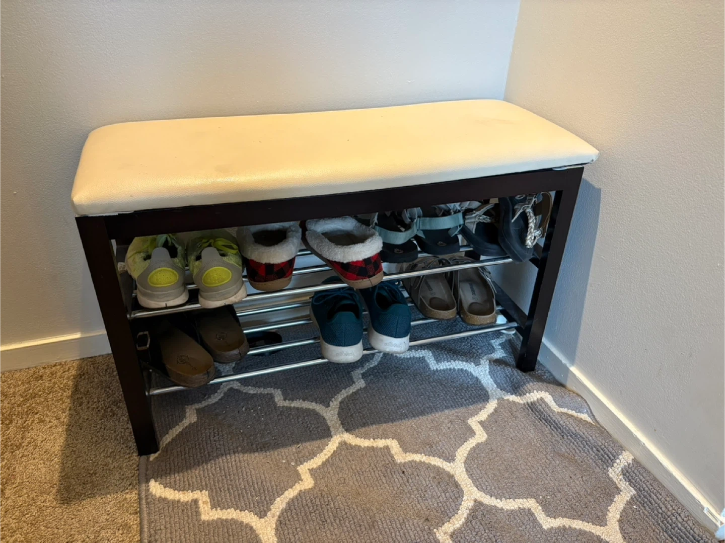 This shoe rack bench offers a convenient place to store your footwear. It features a padded seat top for comfortable seating. Two tiers provide ample space for shoes.