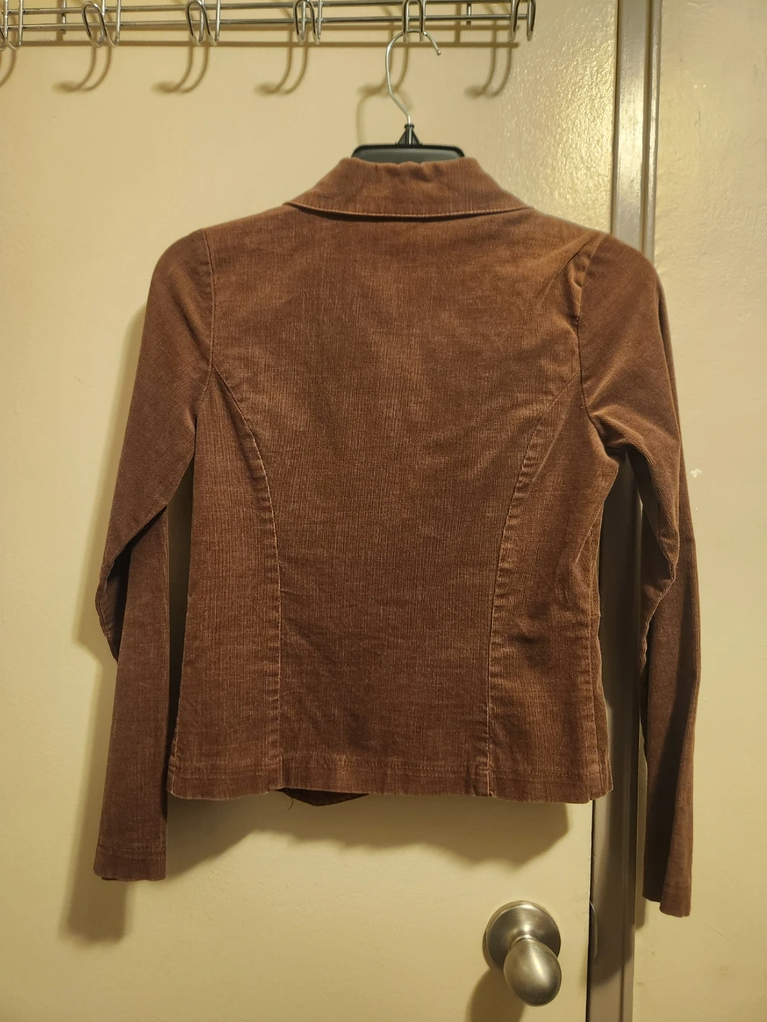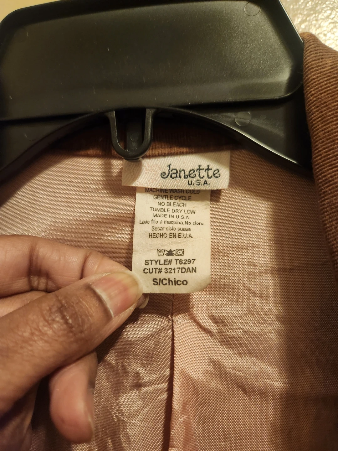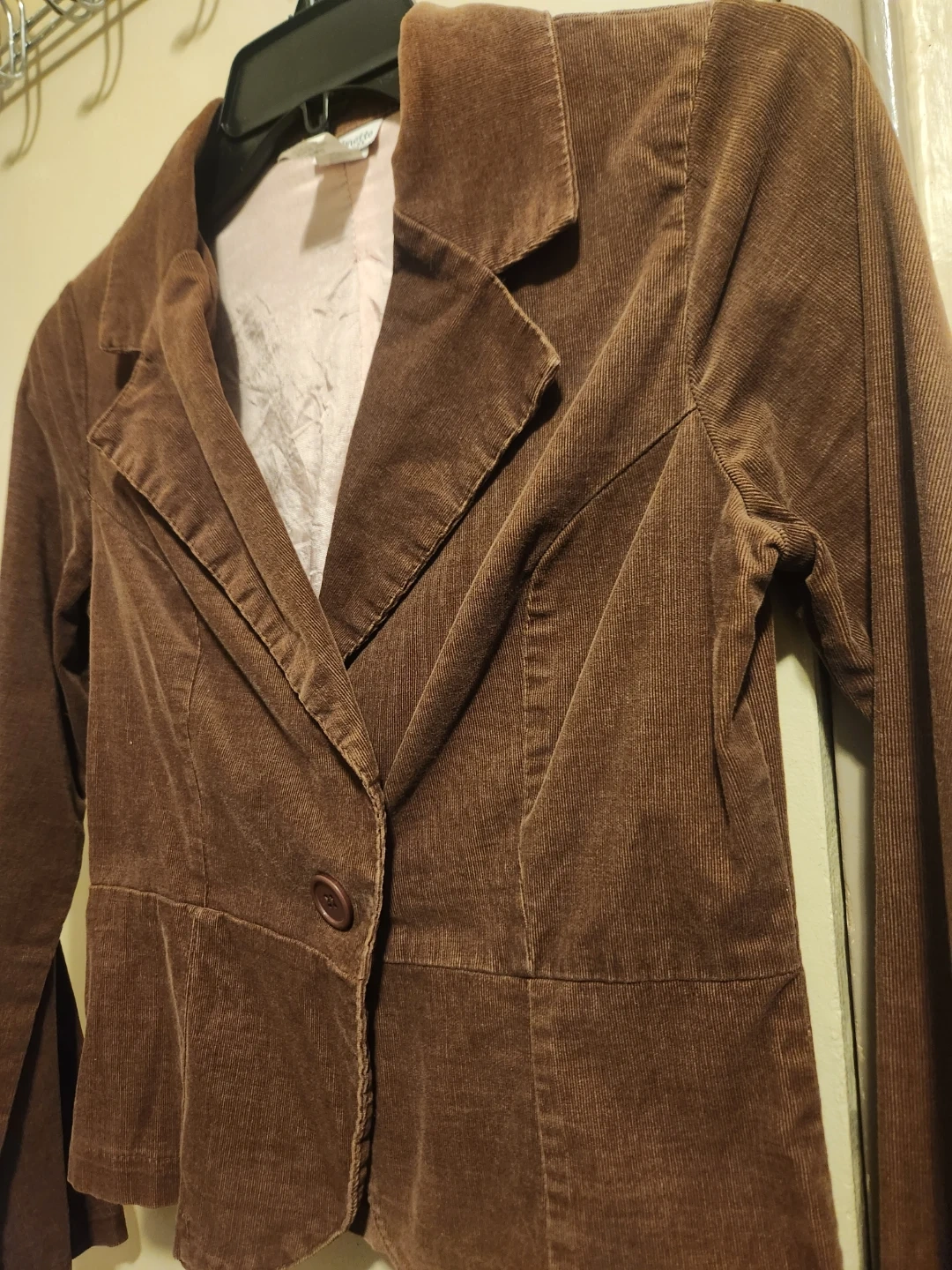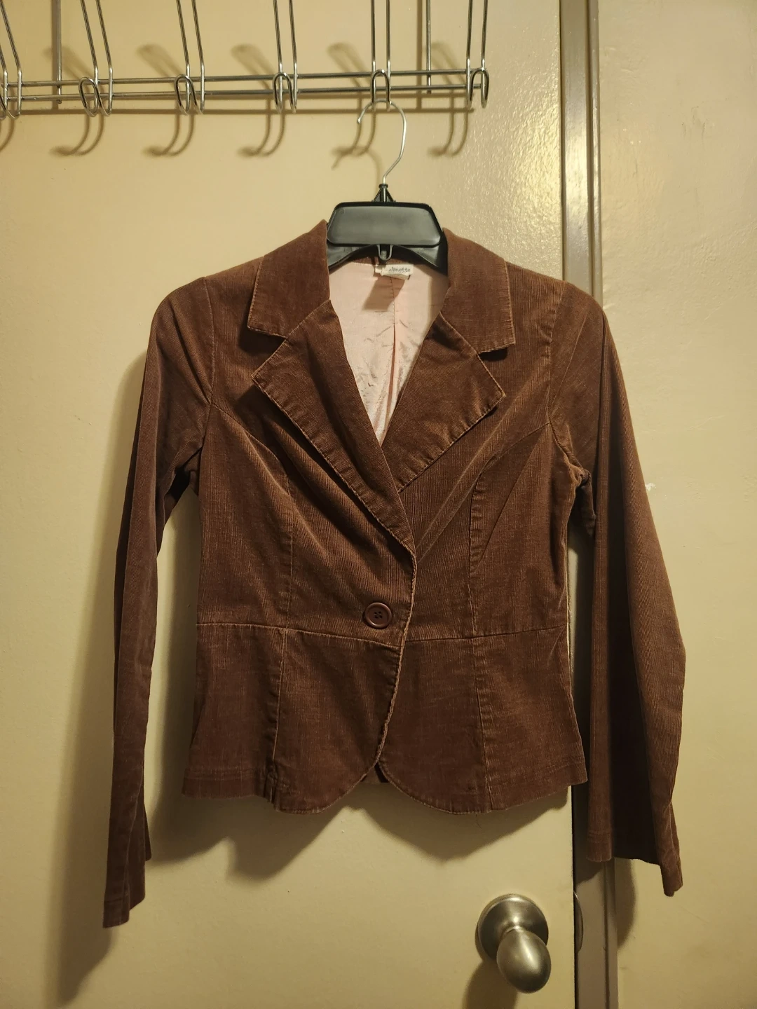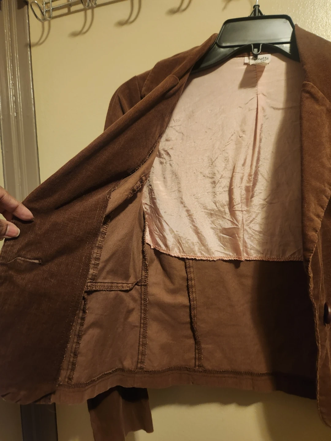 This brown corduroy blazer from Janette features a classic single-button closure and a light pink satin lining. Made in the U.S.A. It's a size S/Chico. Perfect for layering!