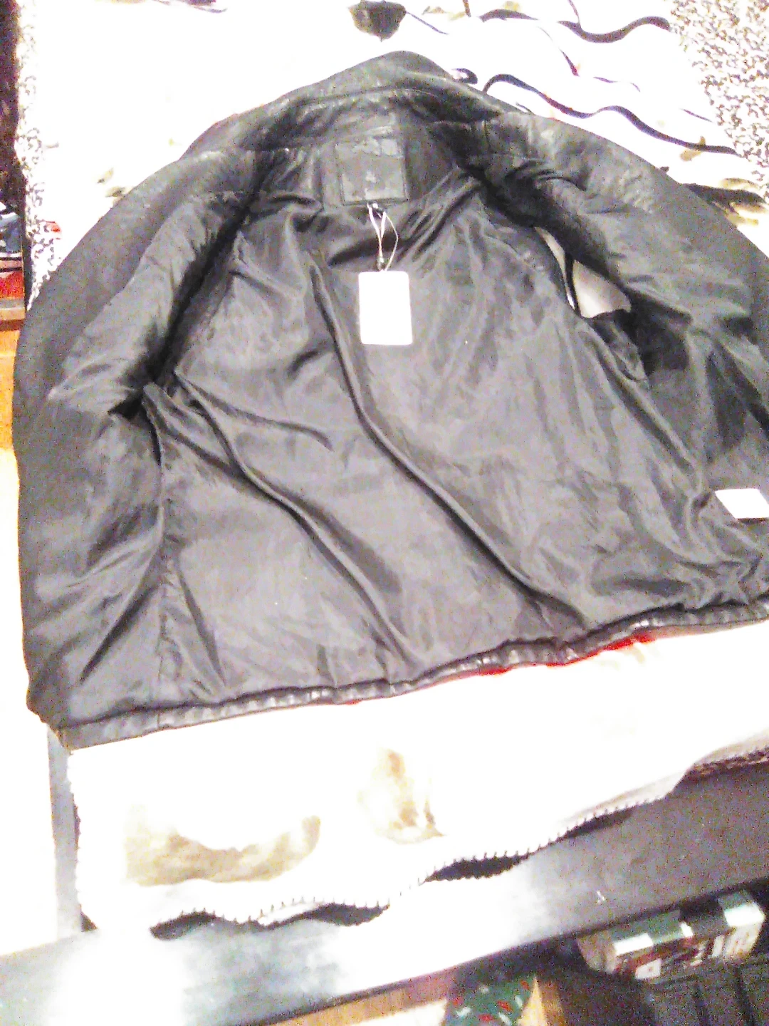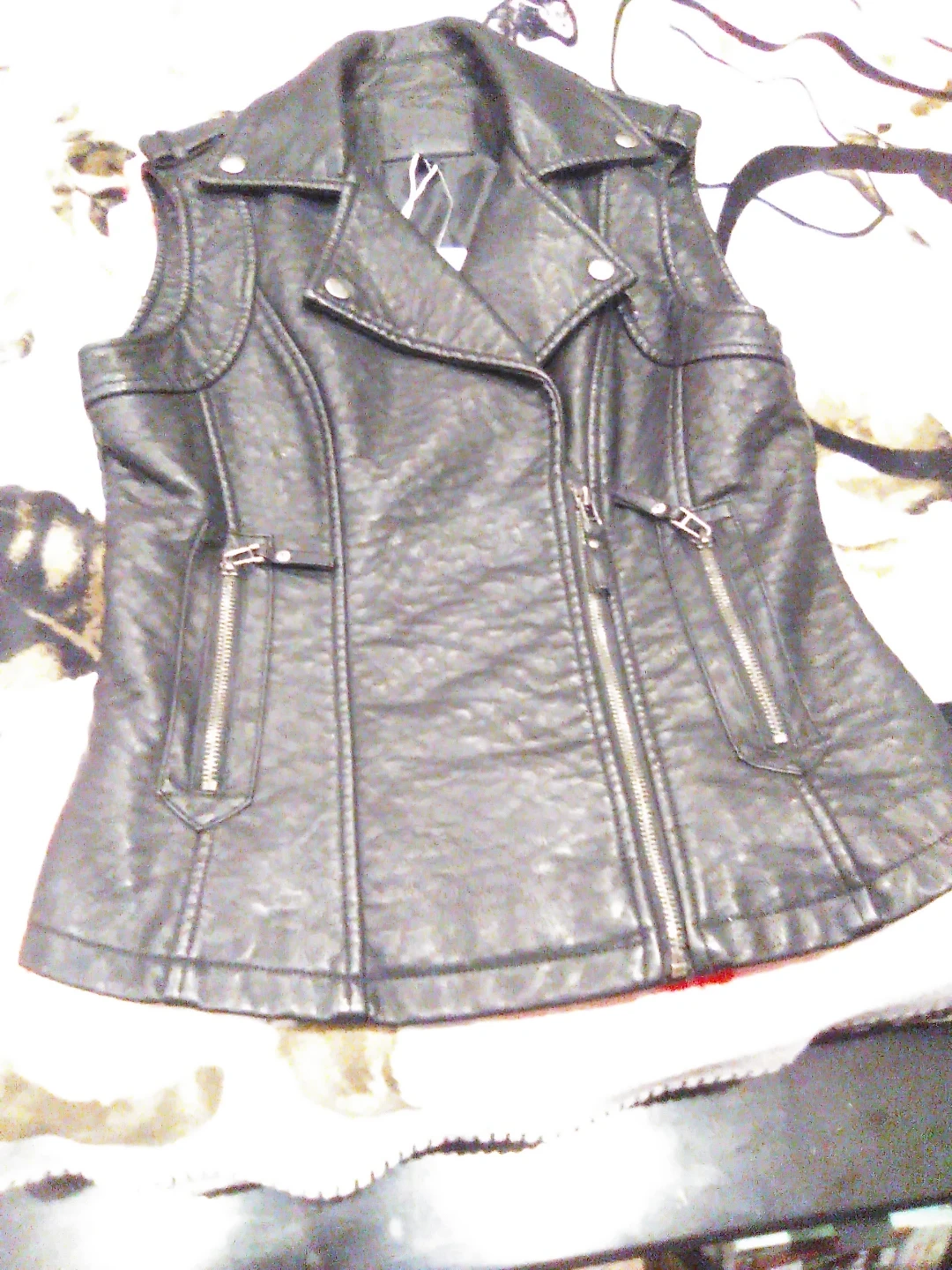 Selling a black faux leather vest in size small. It has a stylish design with zipper details. The vest is in good condition and ready for a new home!