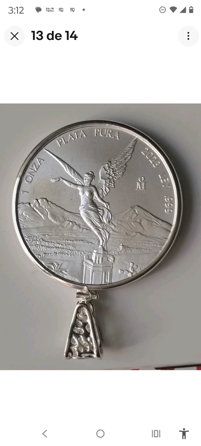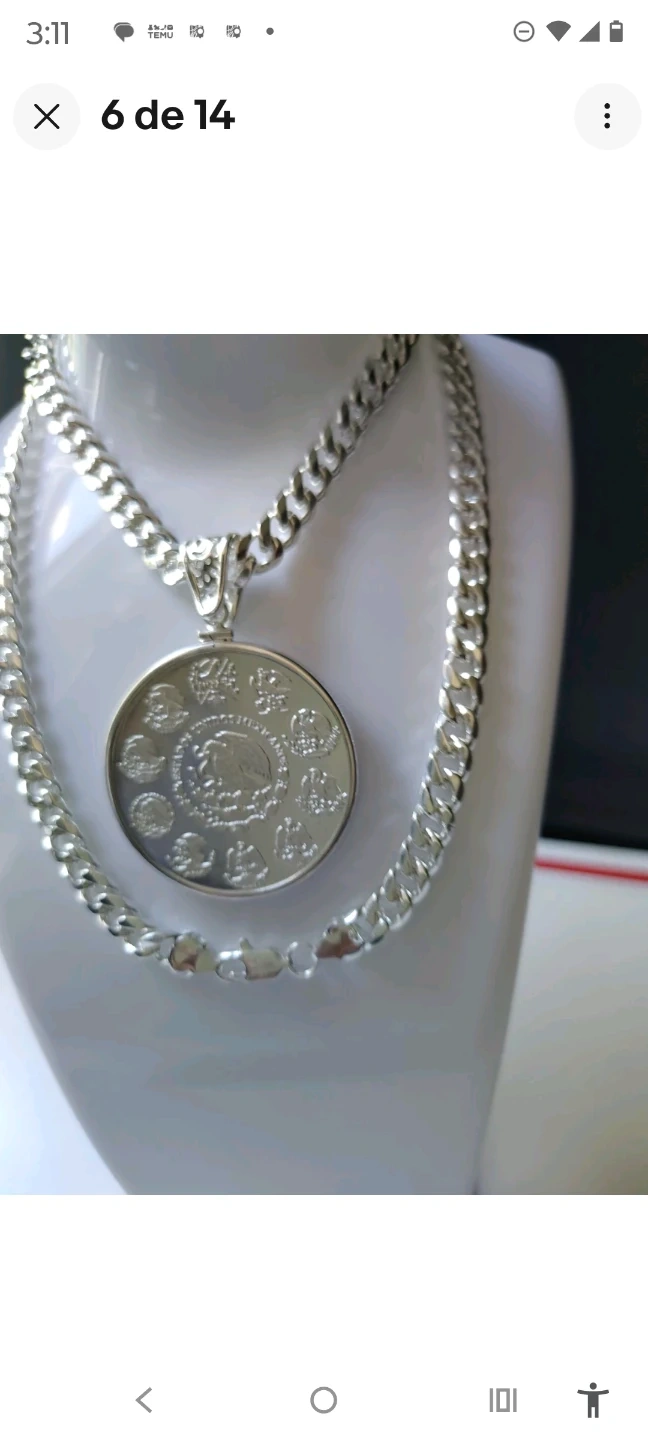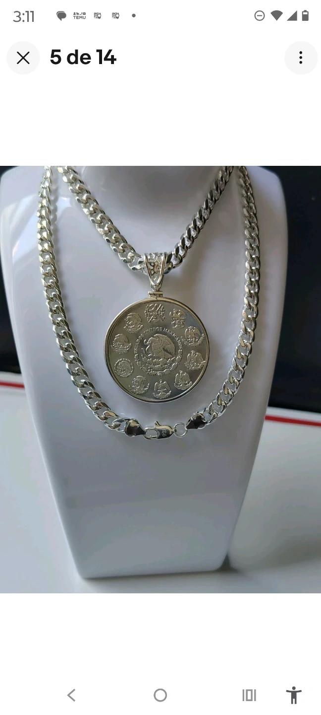 This necklace features a silver-plated curb chain and a pendant designed to look like a 1oz Libertad de México coin. The coin is plated in .999 fine silver. It's a statement piece that combines classic jewelry design with coin appeal. It's great for adding a touch of shine to any outfit!