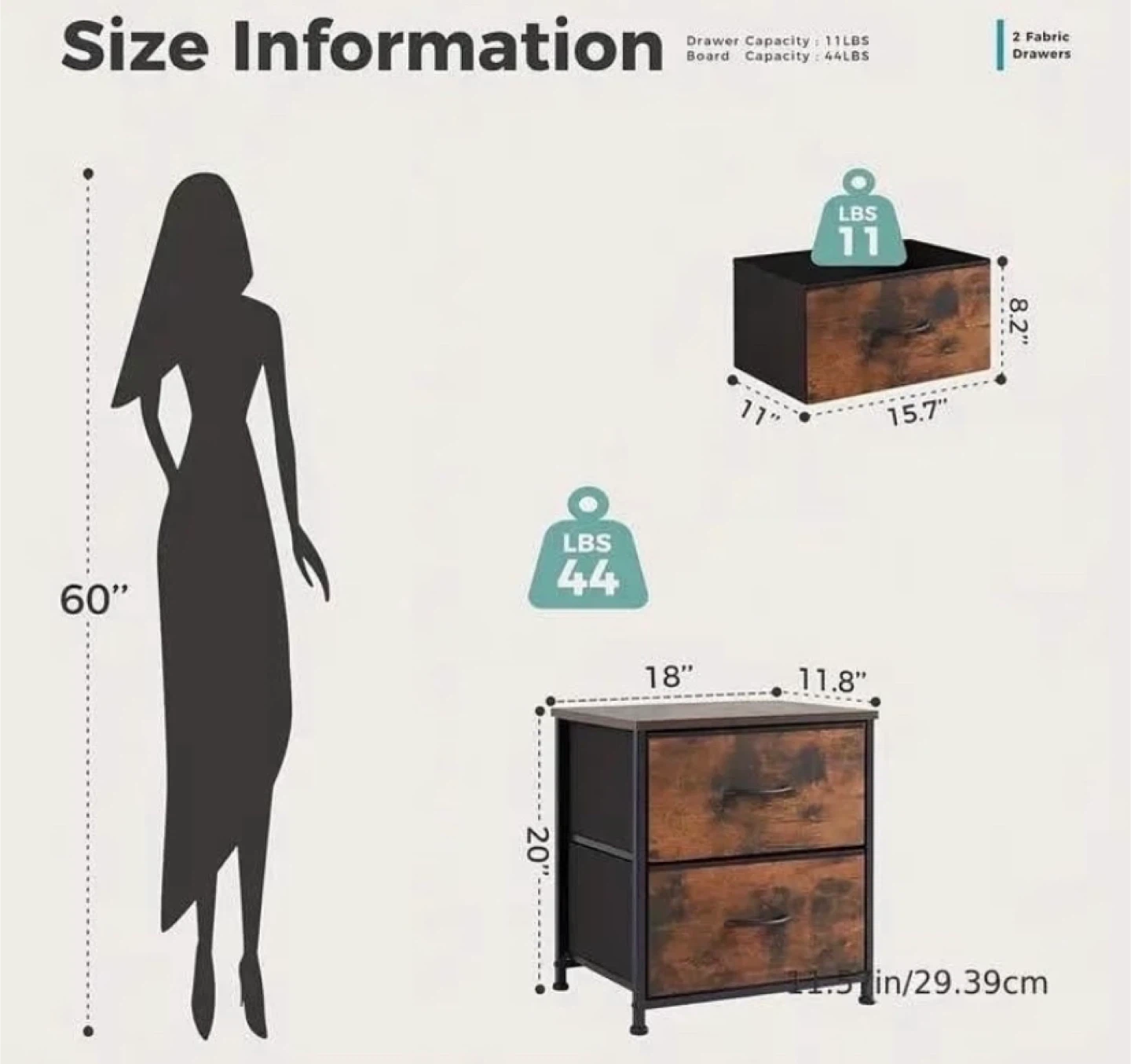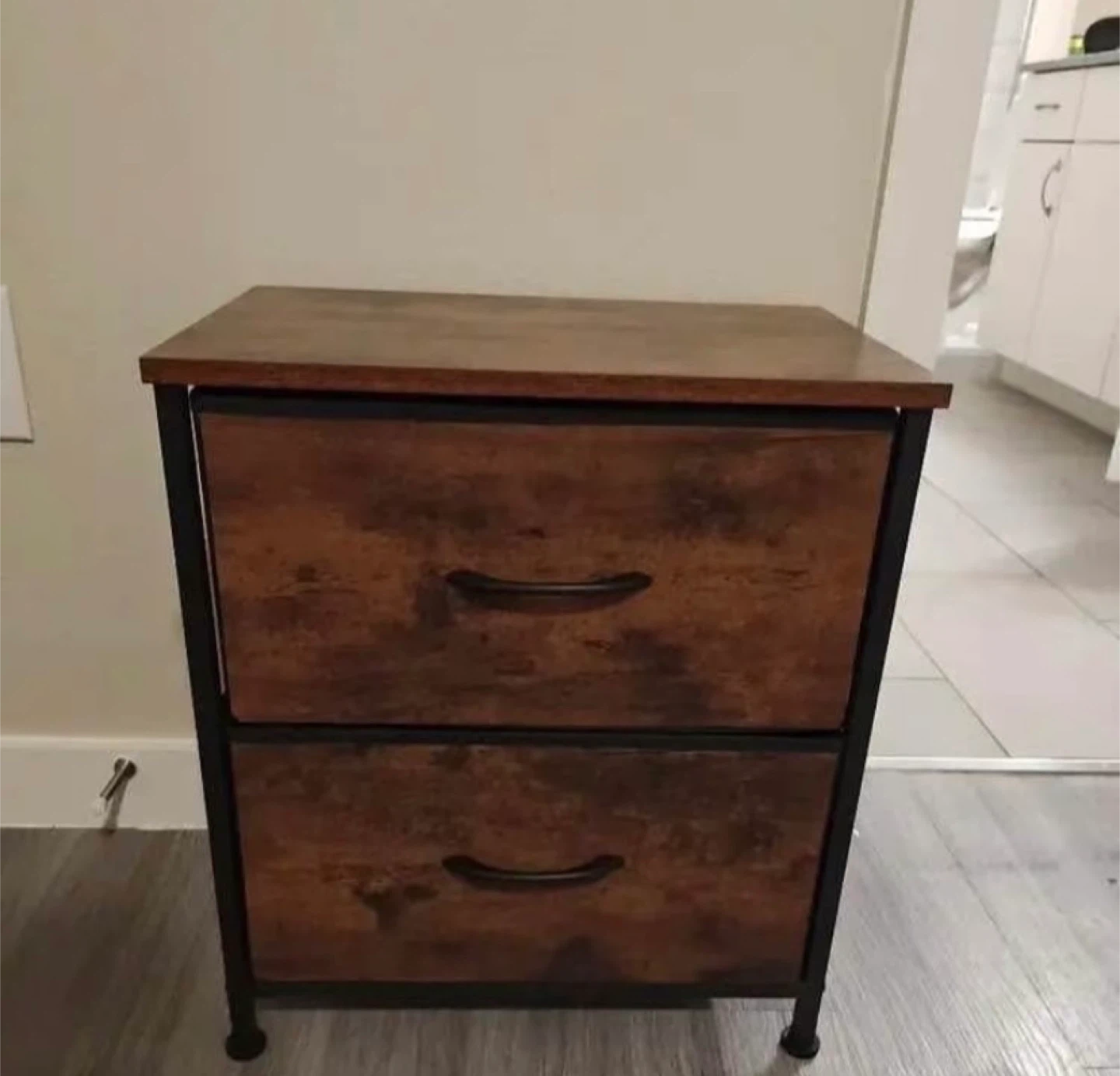 This 2-drawer dresser features a rustic wood-like finish with a black metal frame. Its compact size makes it a great fit for bedrooms or living spaces. The drawers are made of fabric for a lightweight feel. It's 18 inches wide and 20 inches tall.